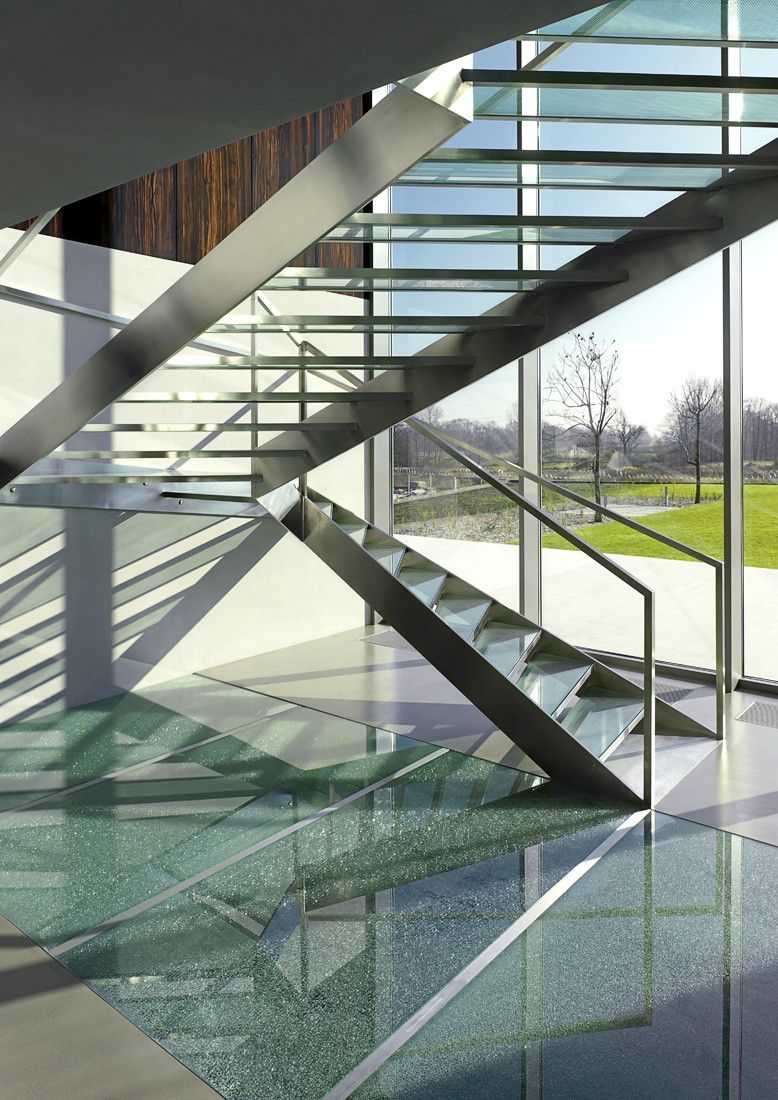 One hectare site near the forest, where the building is designed has only one weak point: south-western access. An obvious conflict develops between the driveway and the garden. The idea arose to lower the driveway in order to separate it from the garden. This prompted another idea – of a driveway leading inside to the ground floor level, from underneath the building, which became possible thanks to the creation of an inner atrium with the driveway in it.