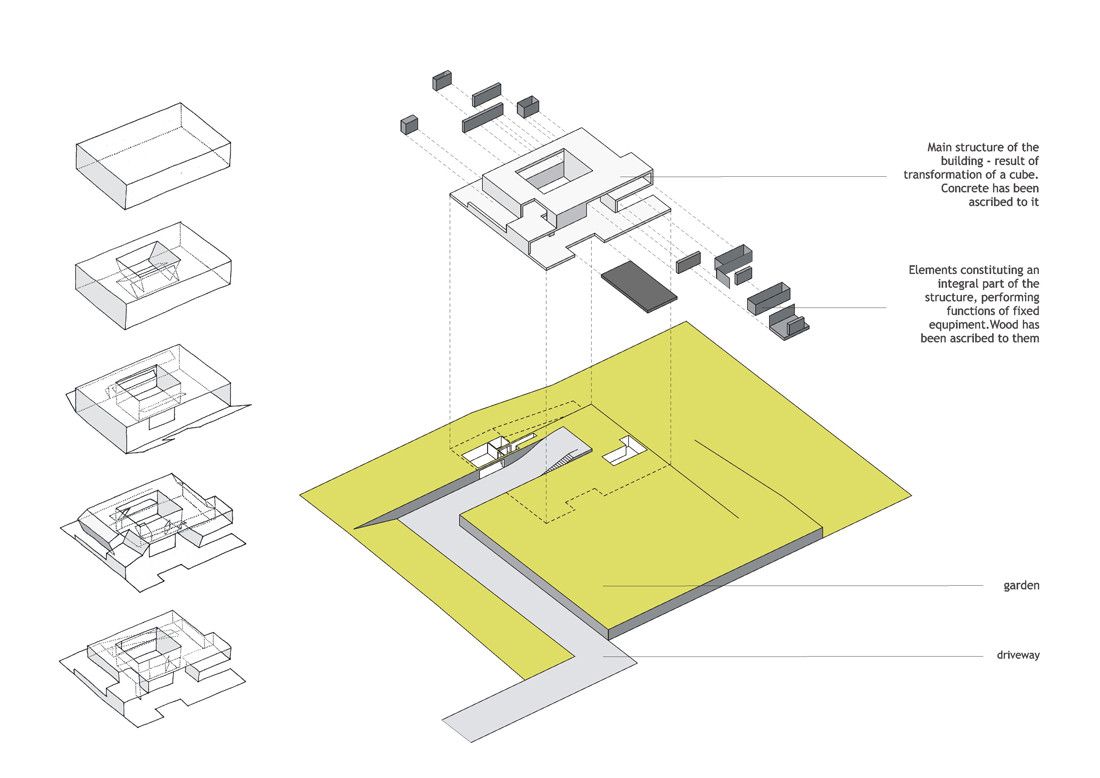 The gateway is situated in the highest point of the site sloping to the east side. The 10 meters wide driveway following slope’s declivity, was additionally lowered underneath the ground level, while the garden was partly raised above this level. As a result, the garden is separated from the driveway and the surroundings with a 2.5m high retaining wall. The building was situated on the garden level. For the sake of neighboring buildings, typical polish “cube – houses” arisen it 1970’s, the structure of the house results from various transformations of a cube.