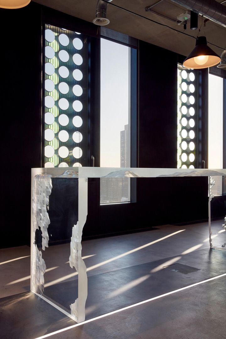 The office’s interior features colorful geometric patterns on some walls, floor carpets, and screens. The contemporary furniture, also, shows a varied range of upbeat color hues. The ceiling is left bare, revealing the metallic pipes, ducts, and lighting fixtures which, along with the red mesh screens surrounding the central stair case and the fair-faced concrete walls and ceiling, gives an industrial feel to the space. Furthermore, the alternating opaque and transparent patterns on the window screens introduce playful light projections on the adjacent soft-patterned furniture and flooring. This combination of aesthetic touches has resulted in an interior space befitting of the creativity software giant.
