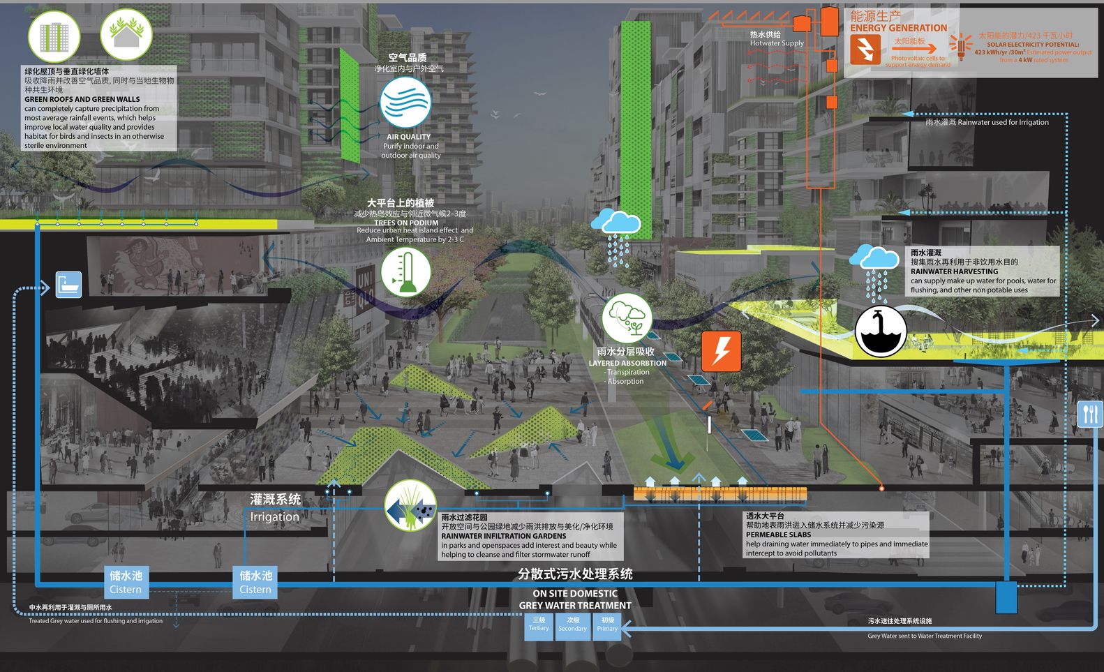 The public spaces get connected via a “rooftop network of interconnected parks and gardens,” creating the largest green roof system in the world. A car free region, this roof system by Sasaki associate will provide a natural habitat and filtering rain waters. And priority of pedestrian walkways and public transportation in the crowded areas of the development.