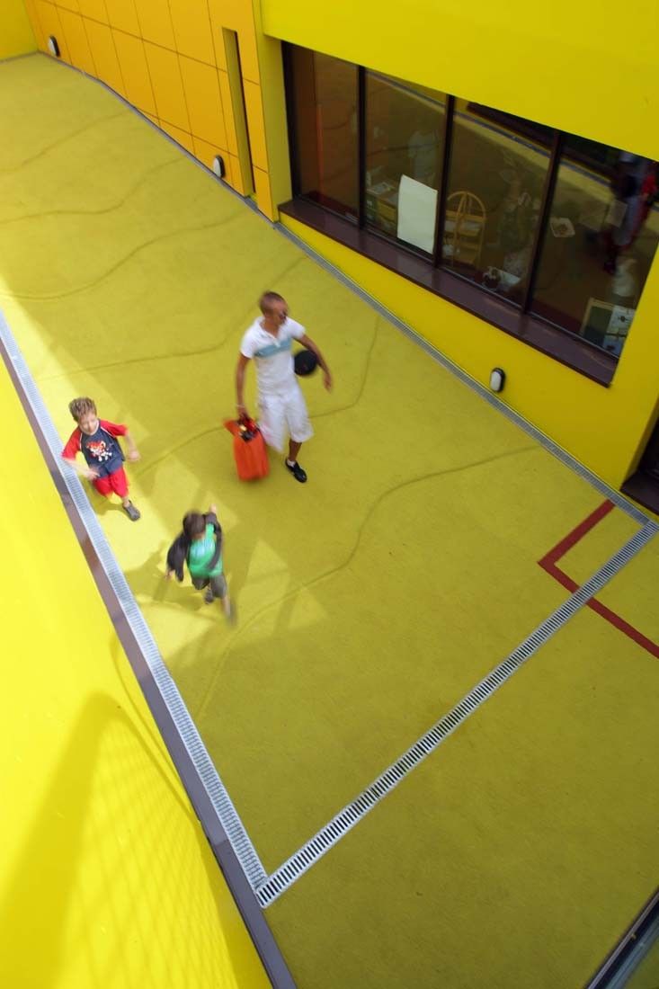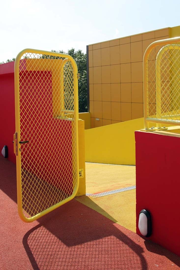 Over and above the pure functionality of the activities identified in the project, the architects placed great hope on the imagination and inventiveness of the occupants. That’s why all corridors, access ramps, nd passageways, are wide and spacious, up to 3 times the regulation size. The ramp leading to the outdoor games and training area has been designed along the same lines. Due to its exceptional width, it provides an “additional” space and safely contributes to the strong physical and visual continuity between the Leisure Centre’s internal and external areas. Indeed, it was designed with the aim of making it useable for activities ranging from just running up and down to becoming a small sized outdoor theatre. With no steps and surrounded by a 1.80m railing, it is a secure and private area where children can go alone in complete safety.