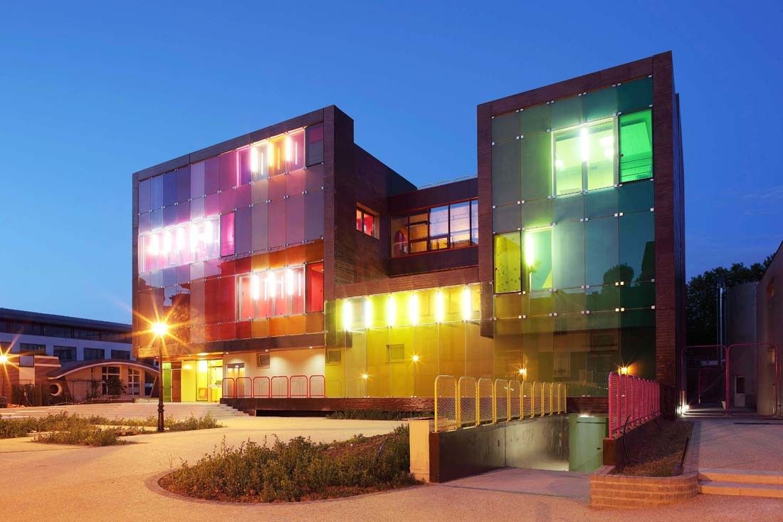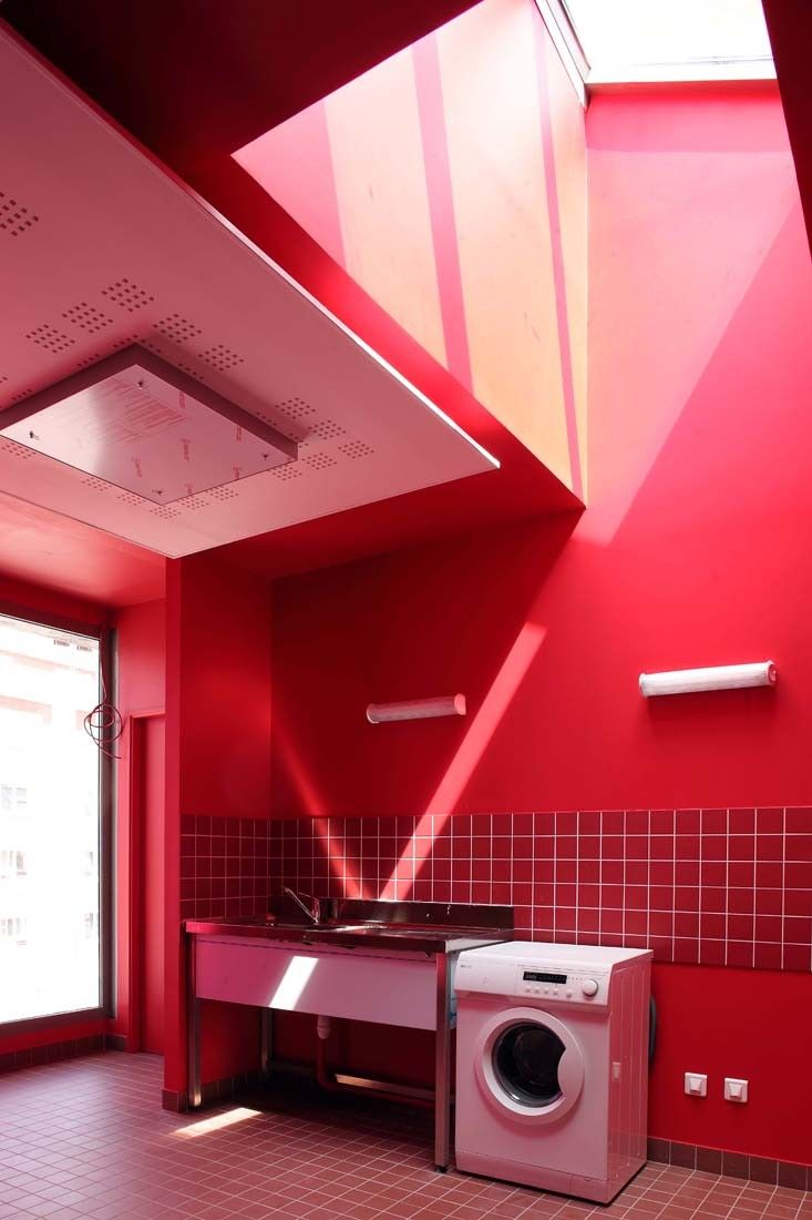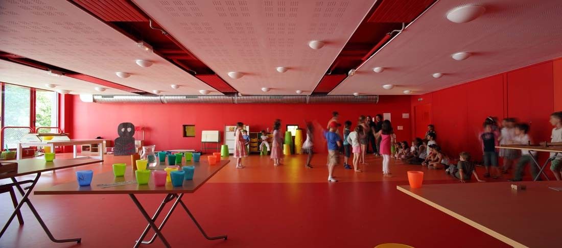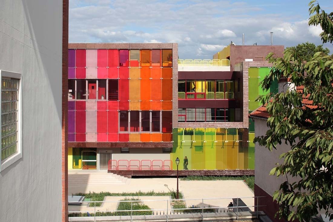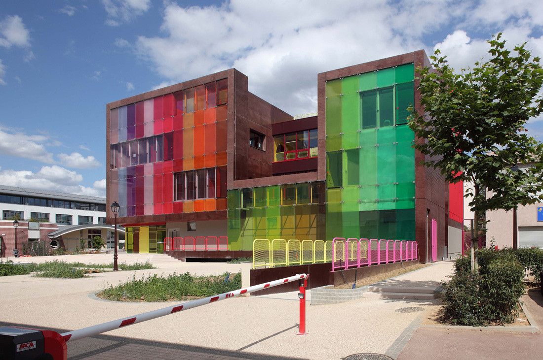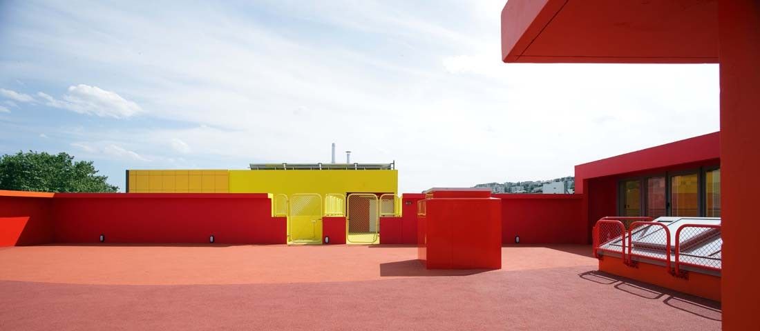 With its cheerfulness and nonconformism, the building contrasts strongly with the urban development zone in which it’s located, behind a new block of private apartments and next to neo-Haussmannian offices and a day-nursery in a similar style. It is with the facing 1930s infant school that it empathizes, extending the metaphor of the balcony courtyard, the passageways, the brick color and the forecourt. As for the 1970s infant school next door, it maintains an obvious affinity with it in terms of shapes, only to dynamite the whole lot.