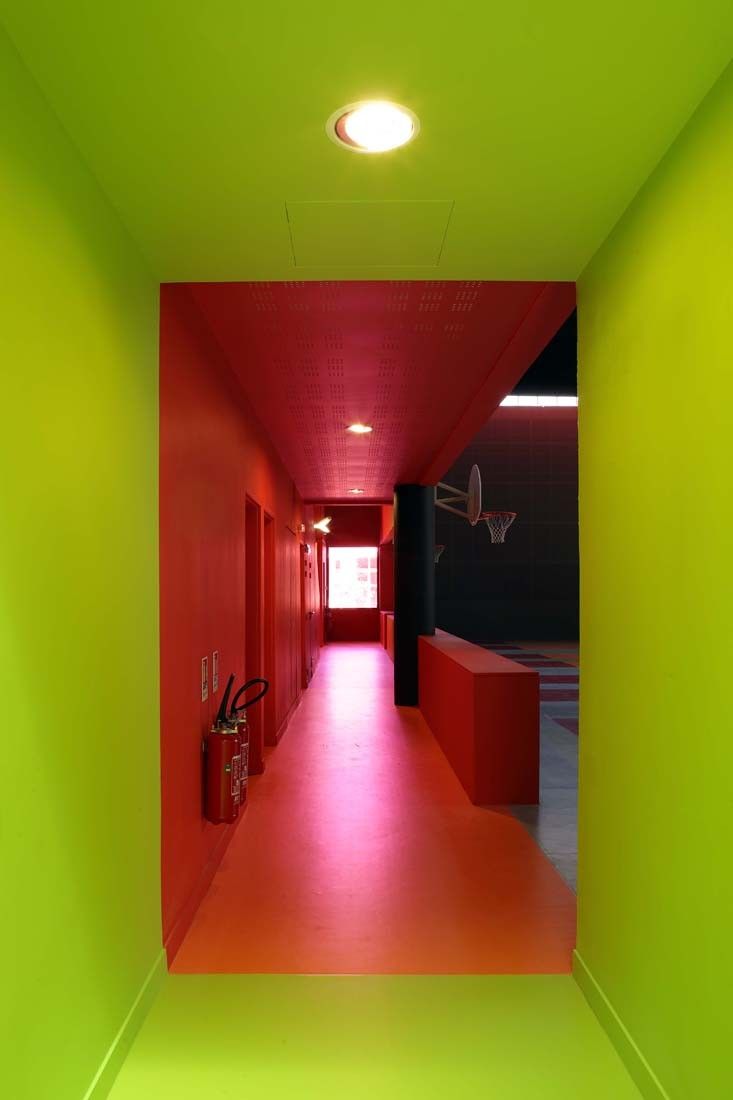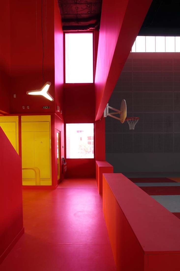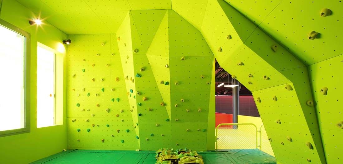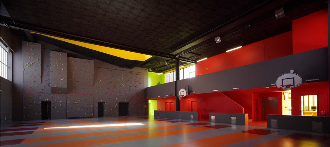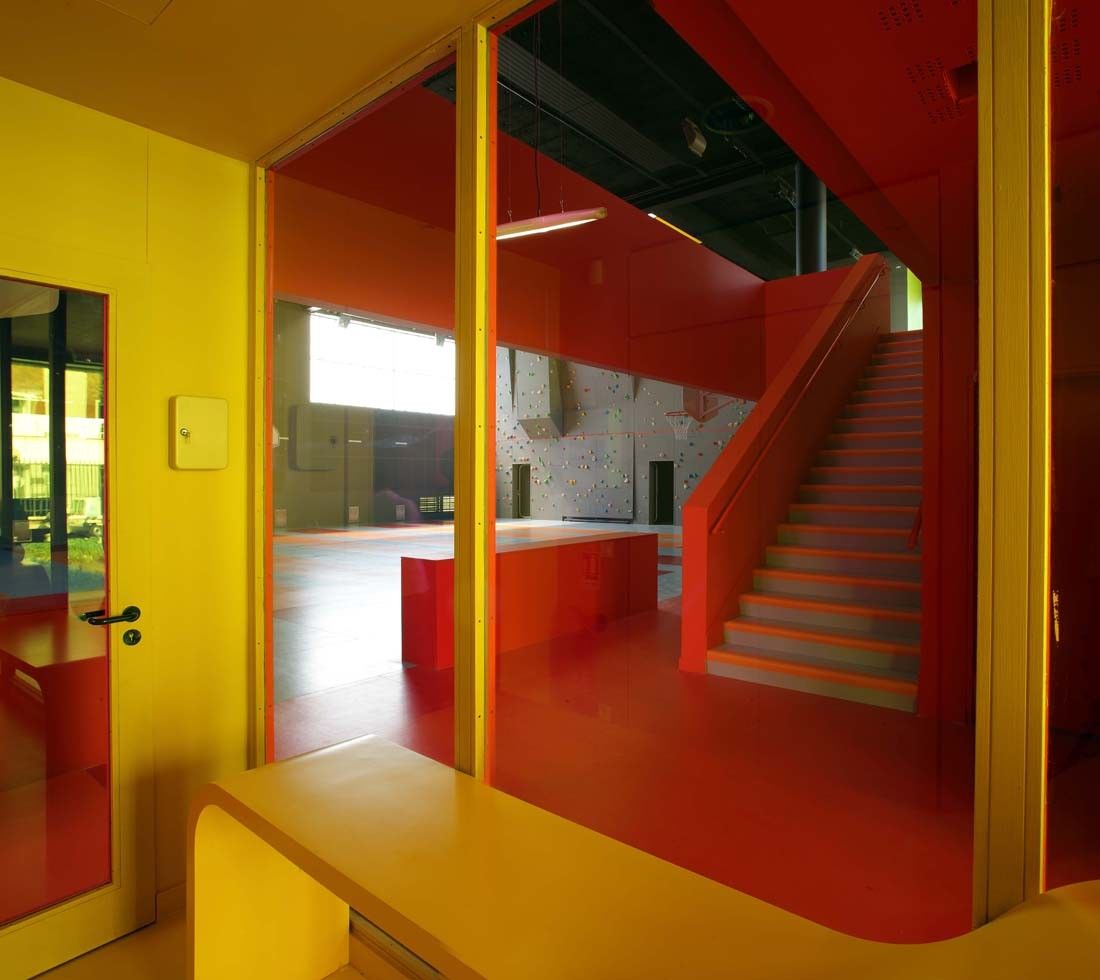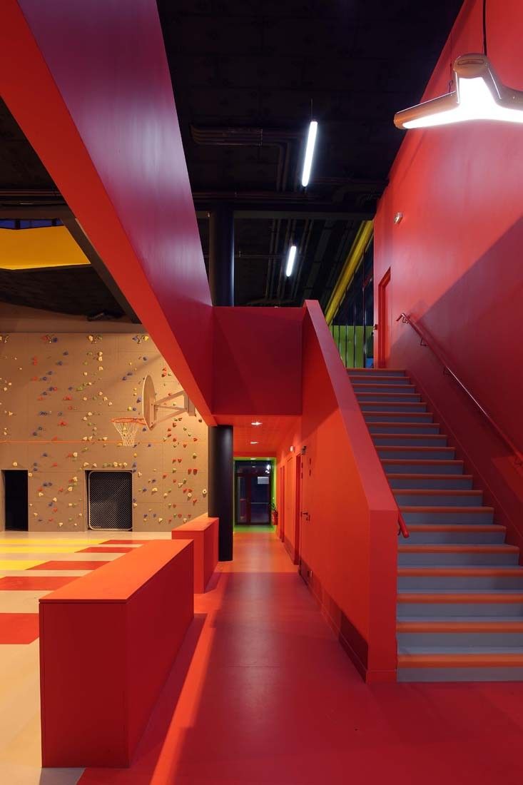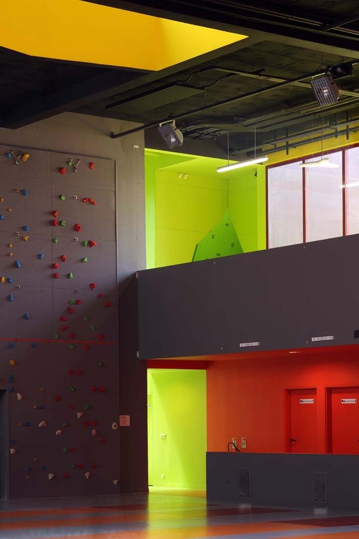 The building uses color very openly and assertively, with a wide palette ranging from red to green, by way of yellow, pink and orange. These colors cover the façade in wide stripes. Inside, the same colors are systematically repeated, like stepping in an oversized graffiti.A color coding that helps you locate from the outside of the areas created on the inside. A means of spatial orientation for young children. An echo to street culture codes for those who crawl on what is dubbed the coolest indoor climbing wall in France, or practice on the pop fencing rows below!