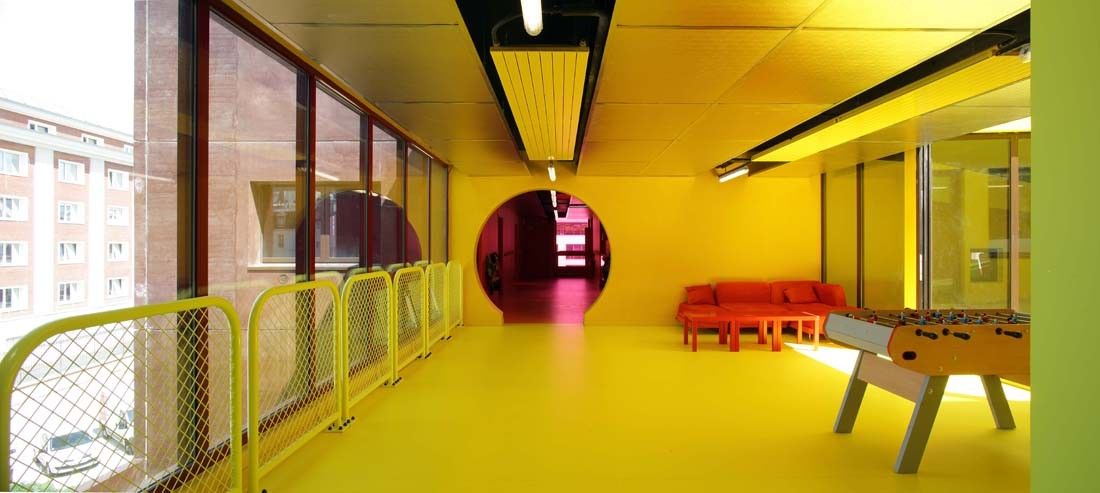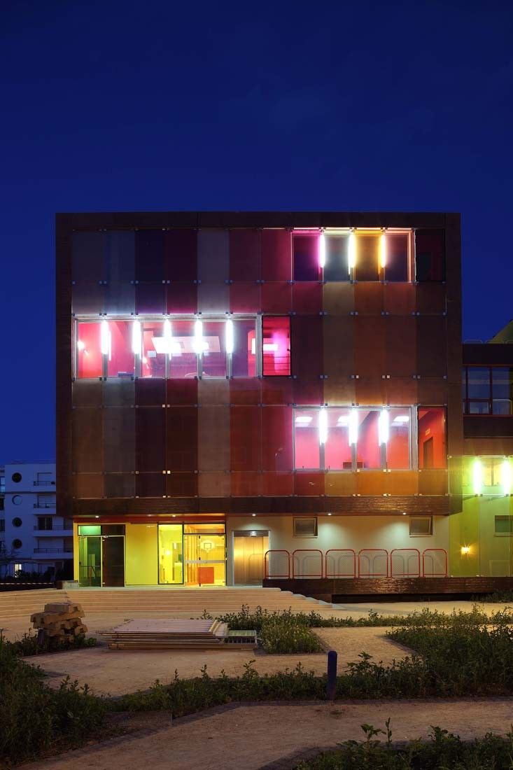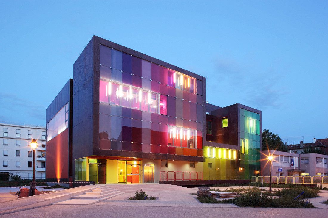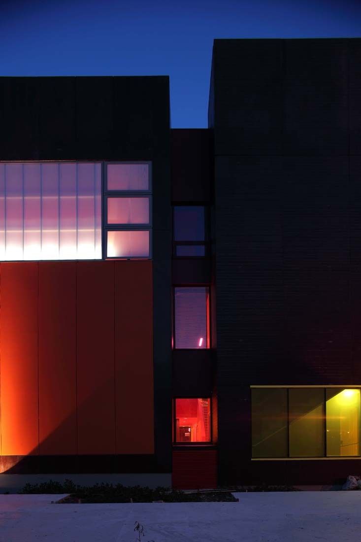 The project is broadly made up of prefabricated concrete load-bearing panels.The molded and tinted reinforced concrete contrasts with the colored surfaces of the laminated panels.
