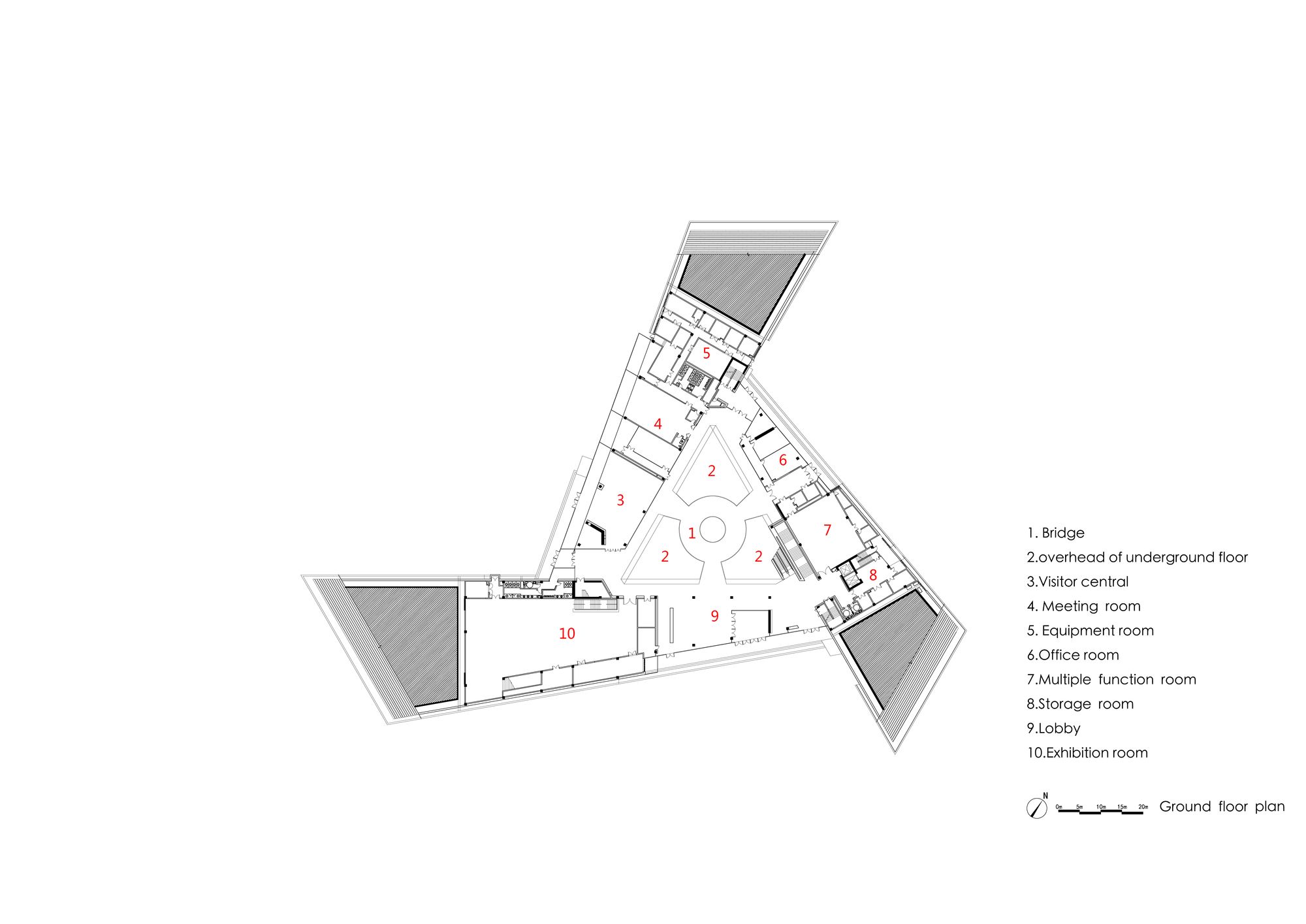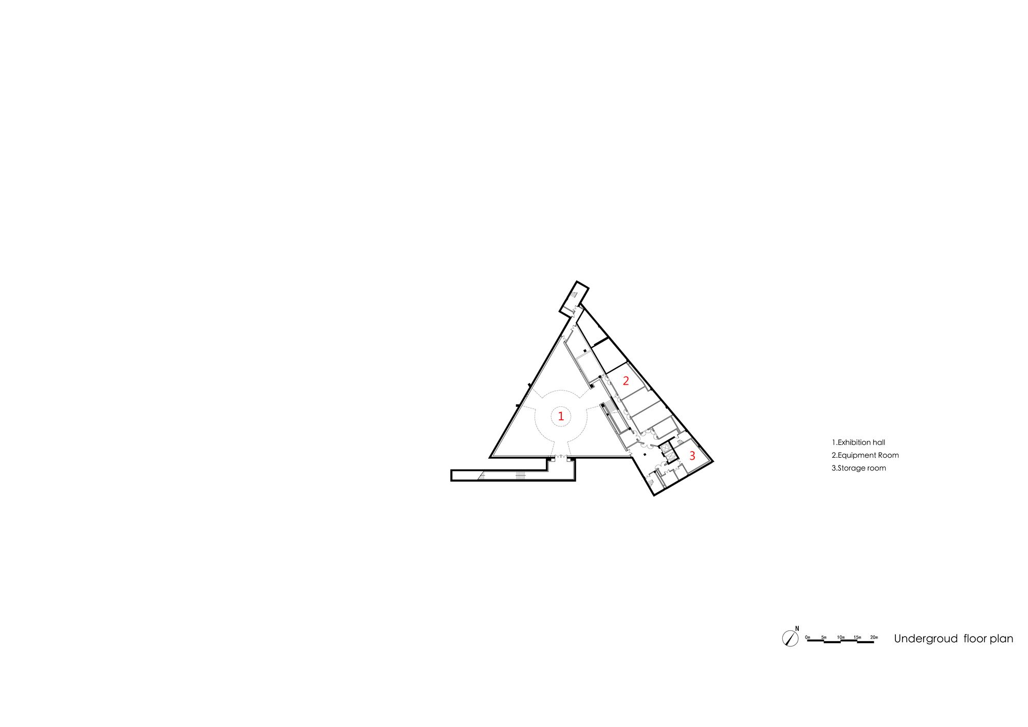Three individual blocks of the new Museum, forming an experiential construction of time and space. The central courtyard enclosed by three blocks symbolized the harmony, vitality, as well as the unity. In addition, by reference to the Chinese dragon cultural pattern, the three separated blocks in the central location of atrium space is connected by three bridges, which implying the process of Chinese civilization from secession towards solidarity. The lower ground floor of the central courtyard is simulating the ancient period of the three ancestors, regarding the settings, such as the stone carving on the wall and sculptures interior, in order to render the historical atmosphere, further building up the cultural palace of the three ancestors. The whole architectural model, including the three individual blocks and the central courtyard, is echoing the herring-boned building pattern in the three-ancestor period, so as the semi-subterranean dwellings.
