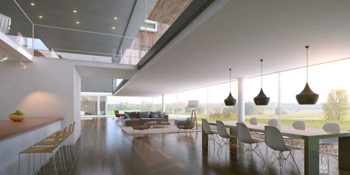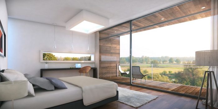 The 3 layers are organized also functionally to enhance the site characteristics and maximize the green-sustainable aspects of the project. The ground floor is ideally presented as a transparent glass box. It contains all public spaces (living, kitchen, pool, garden, deck, etc.) Via operable wall windows, the ground floor greatly takes advantage of the cross ventilation as the main green feature. The second level works as a “connector” between the top and bottom floor and it’s programmatically intended to be a semi-public space. Mostly carved to allow for soaring double height spaces at grade, it features passing bridges that lead to the family/fun/recreation areas to the east of the house.