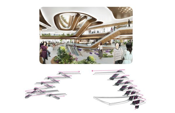 The functional aesthetics of the hexagonal views is that it allows maximum penetration of natural light where retail has become a singular unit to be well lit. But on the other hand, the clever hexagonal design provides maximum shading for required areas too, considering Singapore’s climate. The hexagonal visualization incorporated into the glazed structure becomes a beautiful representation of the aesthetics of transparency. United beneath the façade are food & beverage areas, garden activities, retail areas, lounges and a cineplex and movie themed attraction. The exterior landscape is represented via a garden, which stands for the Attraction element. It leads into the realms of all-activities