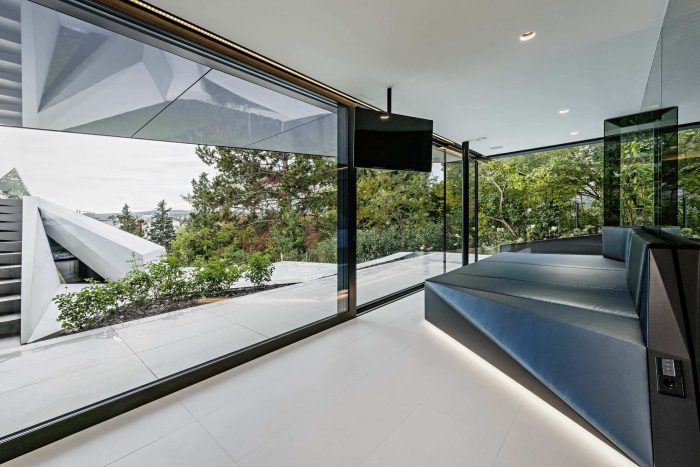 For merging garden with the folded facade on the hillside of the plot, the “garden folding” in white was created: Made of glassfibre concrete panels, this functional object fit the outdoor living area for habitation with their different features: