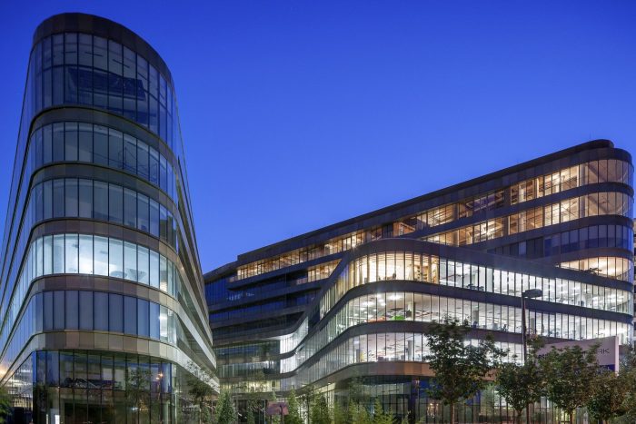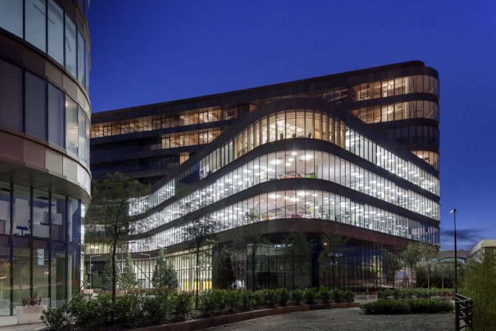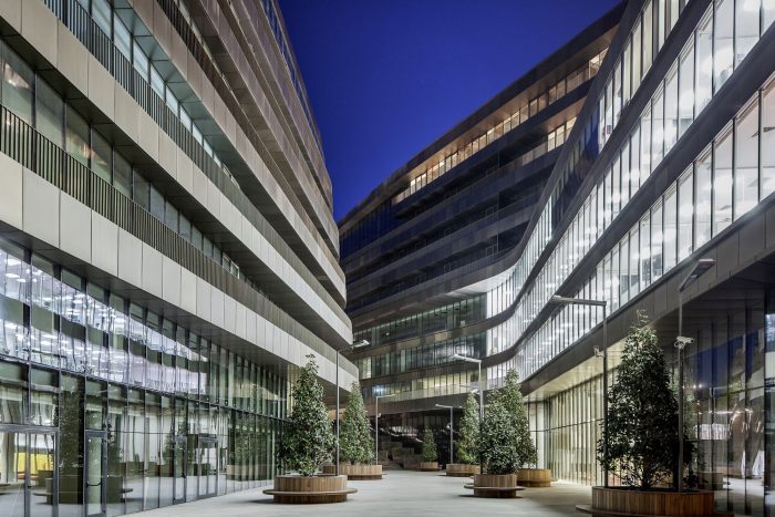 Curvilinear parallel facades of the two buildings produce a semi-sheltered, 20 meters wide pedestrian link that forms an integral part of the network of neighborhood connections. Small cafés as meeting places, not only for the direct users but also for local people, take place on the passage.