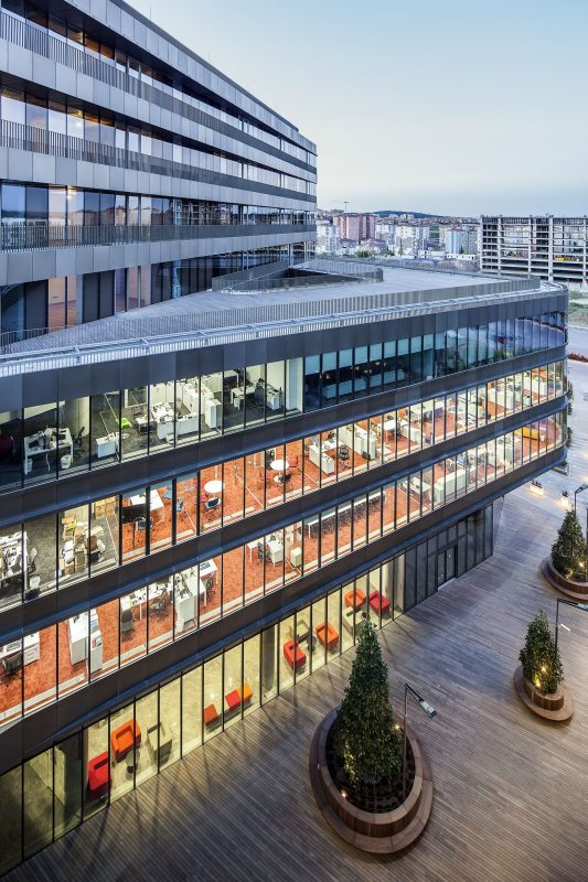 Beside balconies and terraces, each of the buildings has high atriums with open roofs that grant natural air and optimum daylight at interiors. At the ground floors, these atriums serve as patios to meet and relax. The roof of Pegasus is designed as a roof garden that is located in front of the communal area of the residential floors, housing gym and the spa. One of the attraction points of the modest complex is the “simulation zone” which is located below ground at the upper elevation; having transparent glass openings on top, the curious passer-bys are welcome to take a look at. Conceptually the building is a permeable and transparent workspace with the choice of visibility and interaction with the existing surroundings.