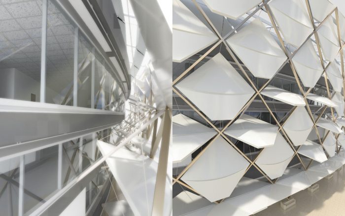 Al Ain is the second largest city in the Emirate of Abu Dhabi and has been inhabited for thousands of years. It is well- known for its date palm plantations. Patternʼs design is inspired by the rotating fractural geometry of the date palm fronds. The architects used the latest parametric technology to create an outer facade that reflects this.