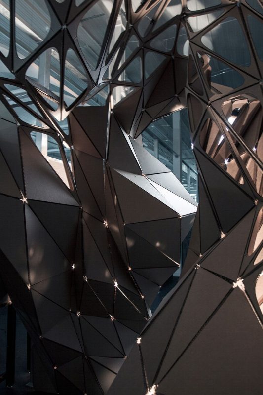 INVOLUTION, the Larry Martin studio took a long hard look at the conventional column design and decided to completely revolutionize it. They subdivided the typical solid facade into triangulated panels to add dynamism and movement.