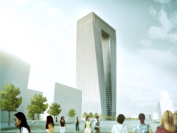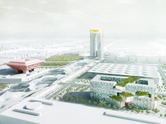 Horizontal spaces, such as kitchens and meeting rooms, are placed underneath the restaurant with a glass floor on top of the center. To create perfect views at the top, the tower is twisted. It is orientated to the skyline of Pundong, the Expo Axis, and the China Pavilion. The tower marks a new beginning for the Expo Area and respects the urban relations with the surroundings.The tower has an energy efficient concrete facade. Deep windows provide shadow to the interior and protect users from the heat while offering users panoramic views of the surroundings