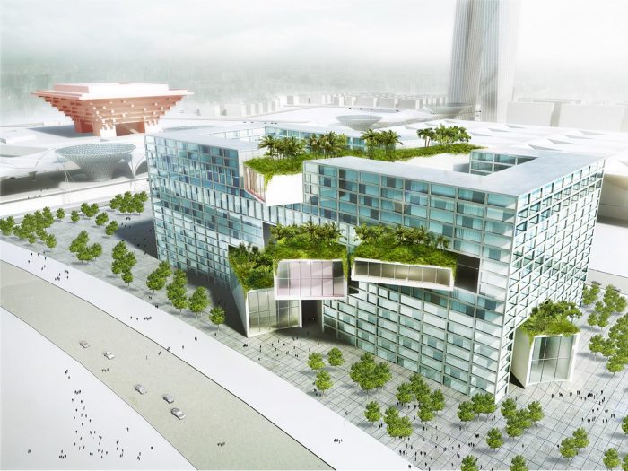 In a city as large and flat as Shanghai, views become the most important factor in architectural and urban design, along with common criteria of floor space and functions. MVRDV’s proposals for a hotel and office tower on the site of the World Expo 2010 take this principle to its extreme and are designed to maximize specific views of the city, which are assigned to appropriate areas of the program. Restaurants face the glowing night skyline of Pudong in Central Shanghai, a spa looks out over the river flowing past, and a hotel lobby has views at one end to the monumental Lupu bridge, and at the other to the equal monument and iconic Chinese Pavilion of the World Expo.