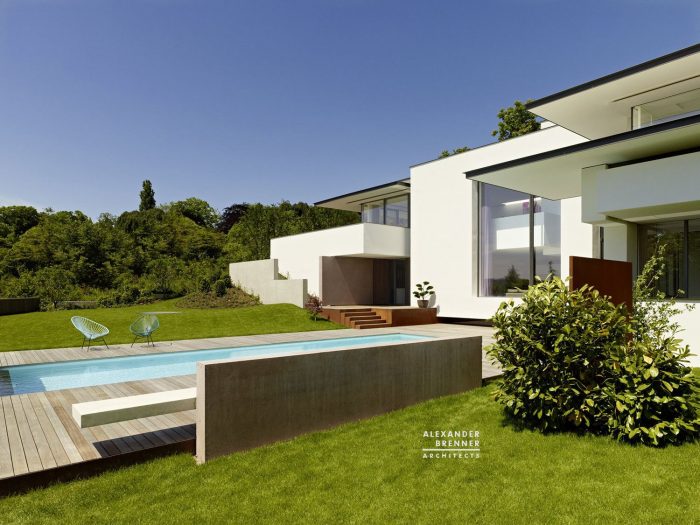 An art-loving couple was able to purchase an outstanding scenic property in the north of Stuttgart with spectacular views over the city. The property is reached via a southern access road situated below. While the garage, situated below the garden, is visible only through a wood-clad incision in the existing sandstone wall, the arriving is guided onto the property by a black concrete sculpture, a freely deformed polished wall. A gently curved path leads via the east side to the entrance at the rear of the plot. The relatively close buildings on the eastern and northern neighboring properties led to an angular building that is largely closed to these sides. To the view in South and West direction, however, the building structure opens with floor-to-ceiling or multi-story glazing. The angular shape of the structure compensates for the different building depths of neighboring buildings. Also, it creates a sheltered courtyardlike exterior space in the pool and garden area. The cantilevered roofs protect the south-facing house from the sun and “direct and frame” the view into the valley.