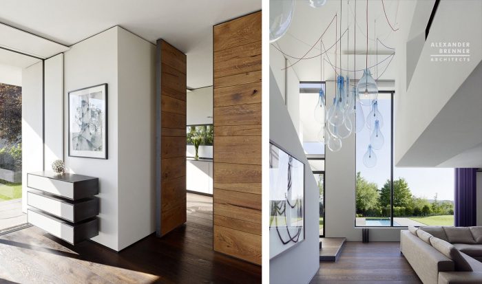 The clients had precise ideas of the atmosphere of their home and the materials to be used. According to this claim, Alexander Brenner designed an open house inside which the spaciousness of the rooms creates a feeling of comfort by the use of walls, wall panels, and room-defining fixtures. The client’s wish was to be also able to place their pieces of art on the walls. Therefore the living space is extended over two floors. In the lower garden level, a rather introverted, warmer, and more intense colored living room with a library, workplace, piano, and fireplace was created. Via a single flight stairway in an air space, one reaches the bright, light-flooded upper living level. White dominates here as a neutral background for art. The flooring is made of deep dark bog oak floorboards. This flooring goes through all areas as a continuous companion, including the dining room, the kitchen, which can be used both connected or separated by two floor-to-ceiling high, solid oak doors. Beyond the Gallery and the airspace the sleeping area with a dressing room and the bathroom is located, which almost feels like an open space due to the generous skylights. The airspace itself is dominated by a light sculpture by artist Tobias Rehberger which interacts with the house. It is attached in front of the large, two stories high window in which at darkness reflections play, blending with the lights of the city while the pool shines like an abstract image.