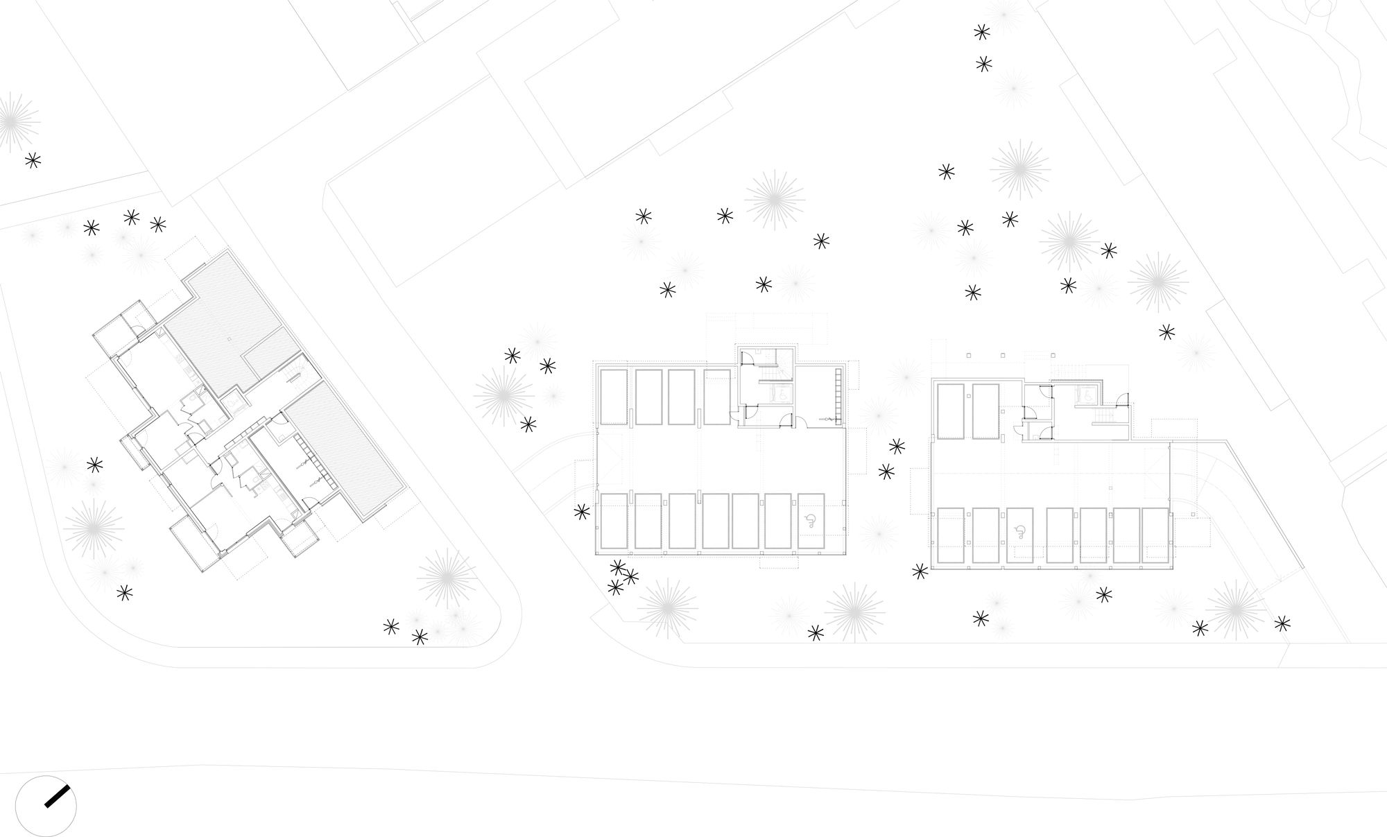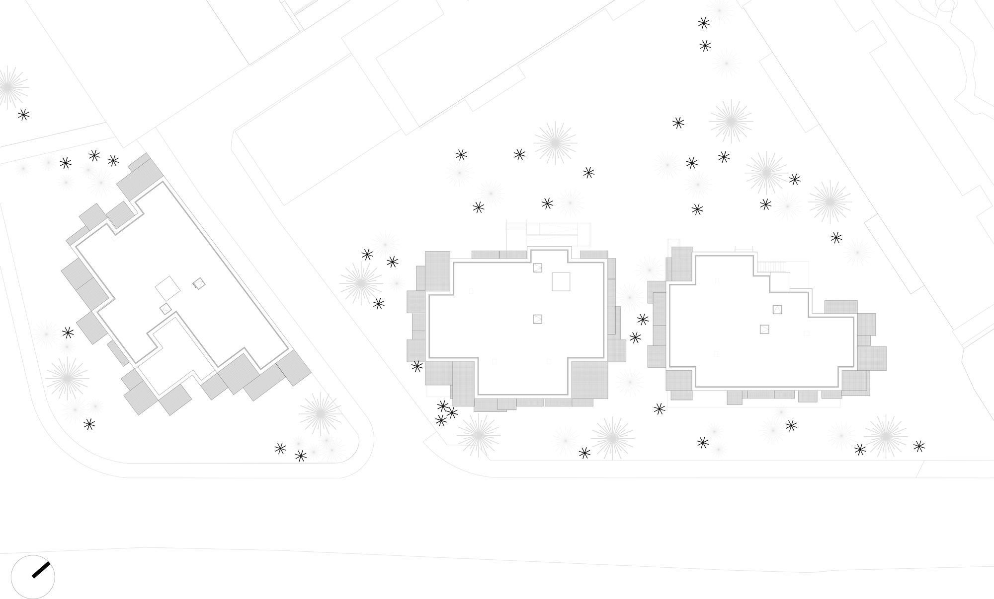 This building functions as a pivotal point and its strategic position means that the eye at once perceives it in its entirety. It has no main façade, and no front or back. The three volumes which compose it are compact and the amply proportioned exterior private spaces are grafted onto them in accordance with their internal spatial arrangement and specific needs, playfully disturbing the line of the building’s façades.