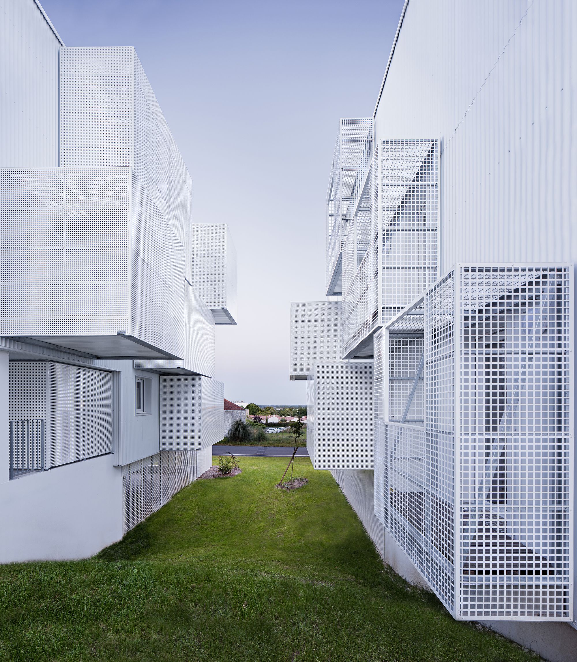 The harmonious association of setting and architecture makes way for a design which, rather than closing in on itself and looking inwards, opens out to embrace the neighbourhood as a whole, while still providing protection from direct line of sight and noise thanks to its perforated cladding.