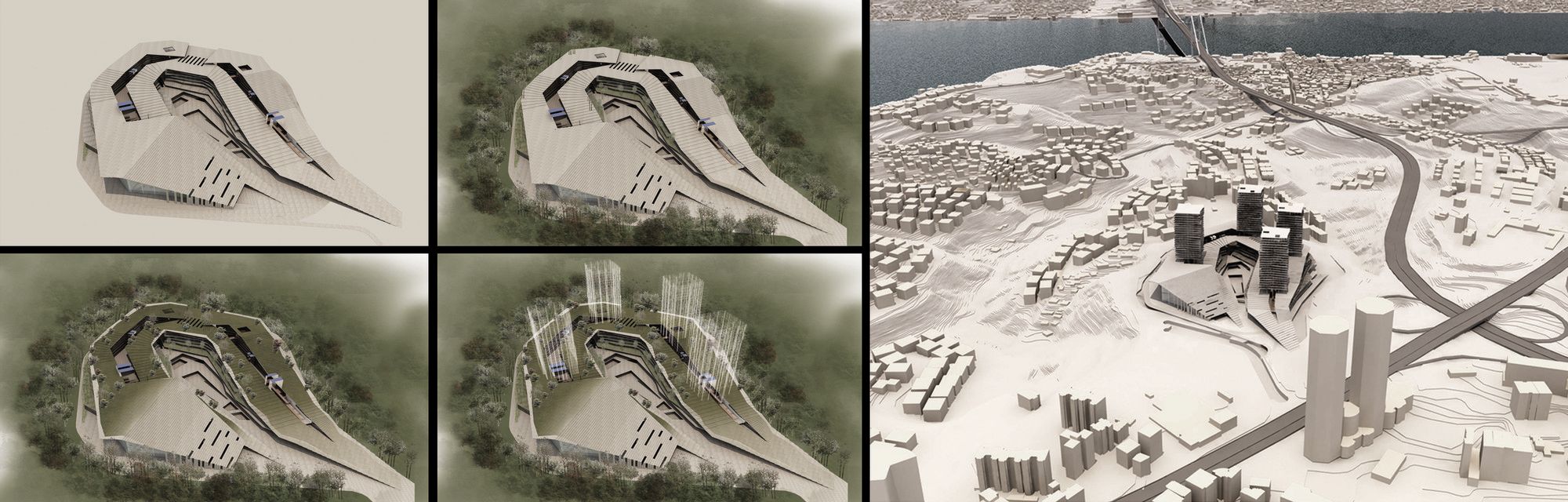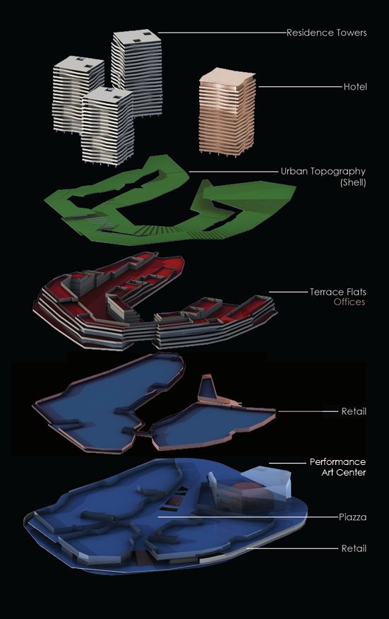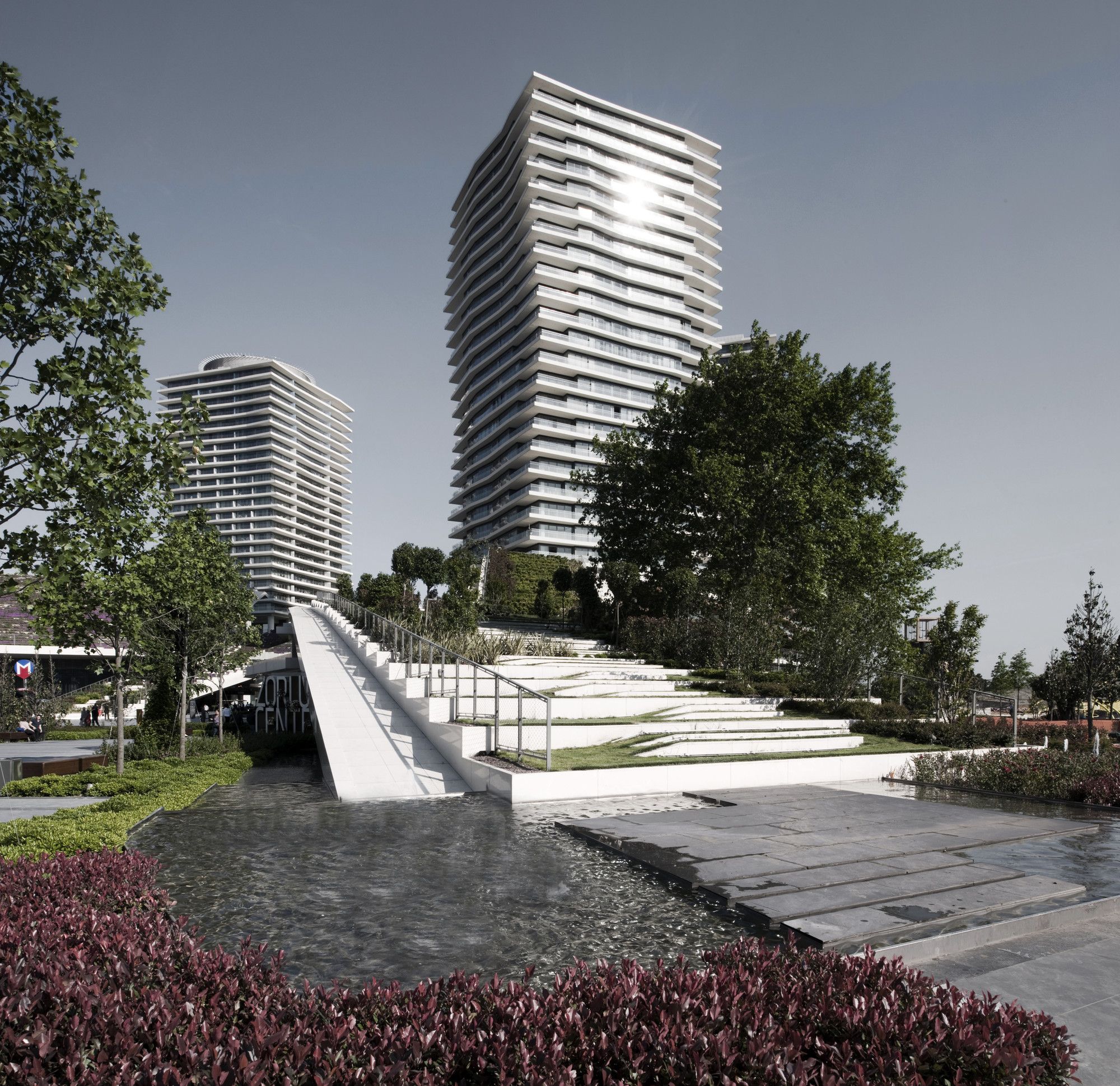 The Piazza surrounded by the retail units creates an alternative public space. The activity stairs direct the public down to the interior mall that also has another direct entrance on the south. The retail level below has a subway connection and includes the cinemas, a gourmet market, and leisure platforms. The highly professional Performance Arts Center of 2300 people capacity has an entrance amphi as a continuation of the Public Square and the Piazza.The terrace flats under the shell have large gardens and terraces enjoying the Bosphorus view. The rest of the residential units form three identical towers, the fourth of which is a hotel. One of the prominent goals of the project was to enhance public life in a completely private land by the help of free porosity and outer space articulations.