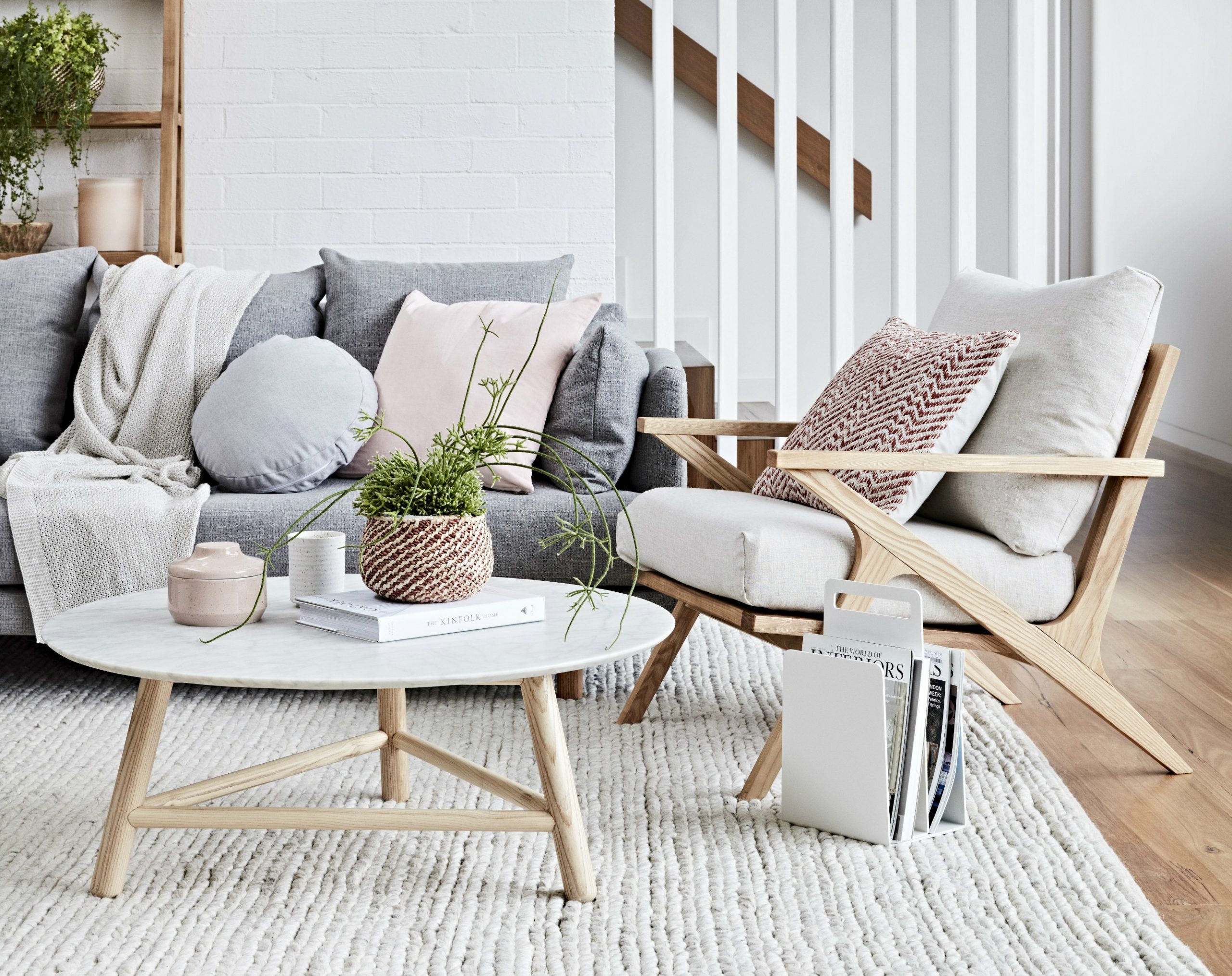 This Simple Scandinavian living room masters the theory that the devil is in the details. The living room design features marble round nesting tables, a woven bench with many pillows for comfort, and a colorful potted plant in the corner.