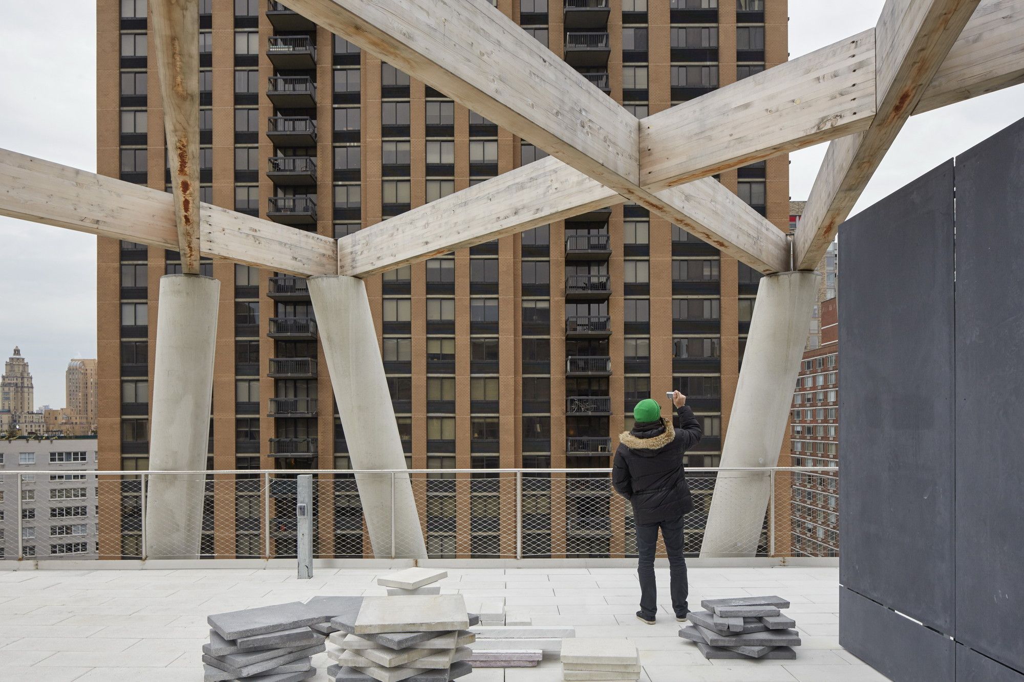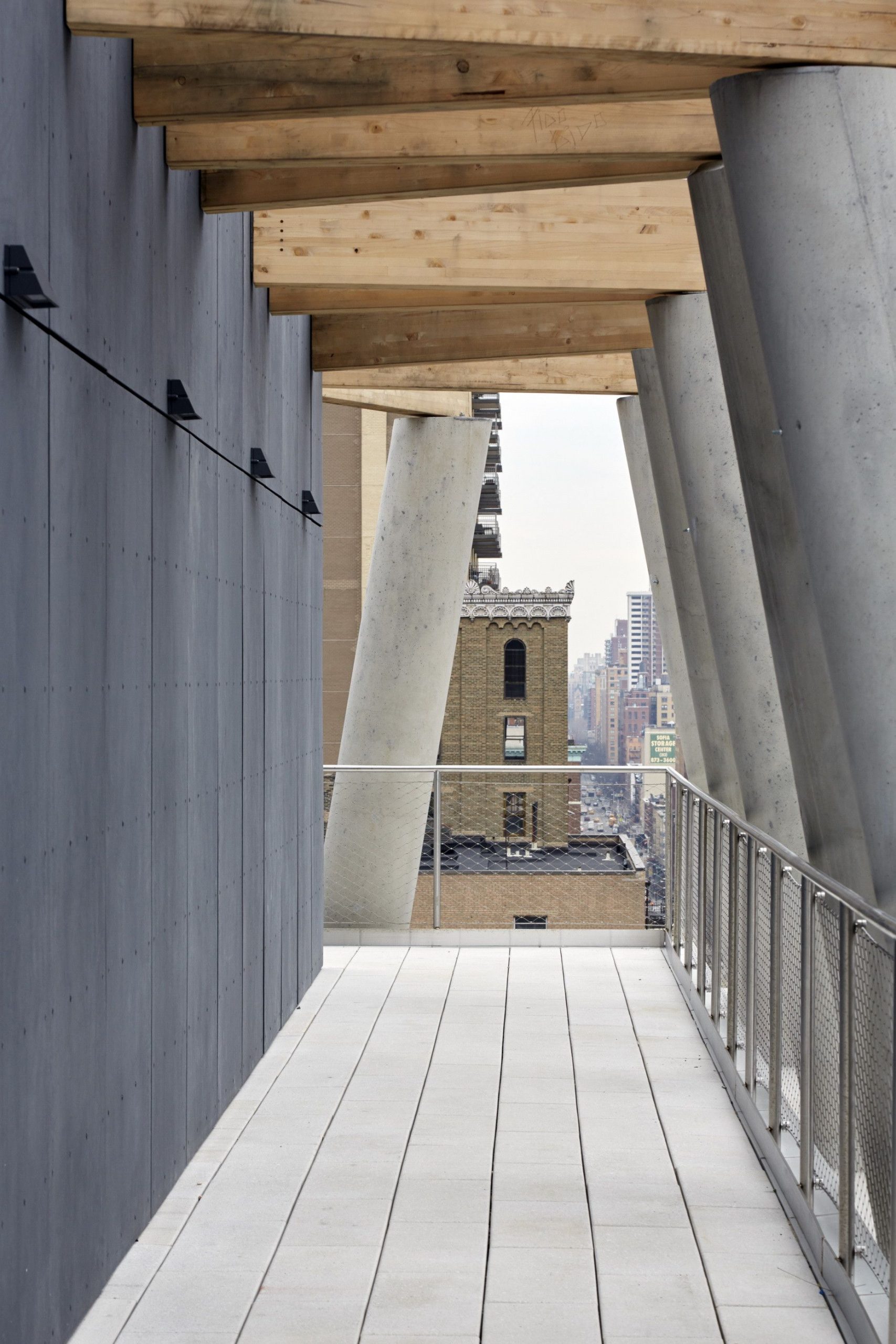 At ground level, the columns create a dynamic streetwall, with the exposed structure angling into the sidewalk and piercing the solid form of the building canopy. Inside, the exposed concrete columns angle through the public spaces of the building piercing the floors and walls of the lobby, common rooms and corridors, and disappearing into the ceiling above. In the apartments, seeing the structure through the floor-to-ceiling glass has the effect of being suspended in a treehouse, held up by the branches of the building’s exoskeleton.