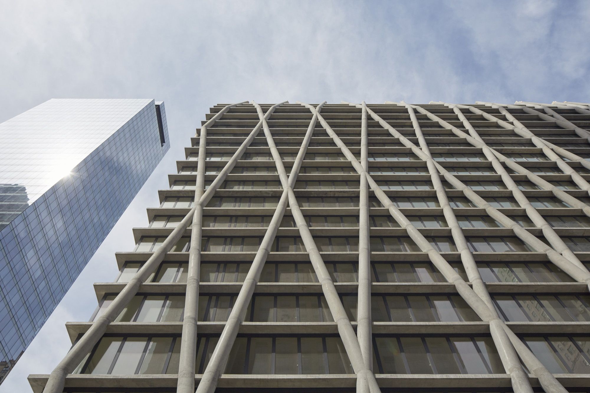The columns that make up 170 Amsterdam’s exoskeleton intersect at different heights, giving the appearance of a façade in motion as the locations of the intersections rise to the top of the building. The deep recesses that are created between the structure and the glass facade play with the light and shadow, creating a changing impression throughout the day. Once at the top, the building’s volume ends while the skeleton continues, creating a structural canopy for the rooftop spaces.