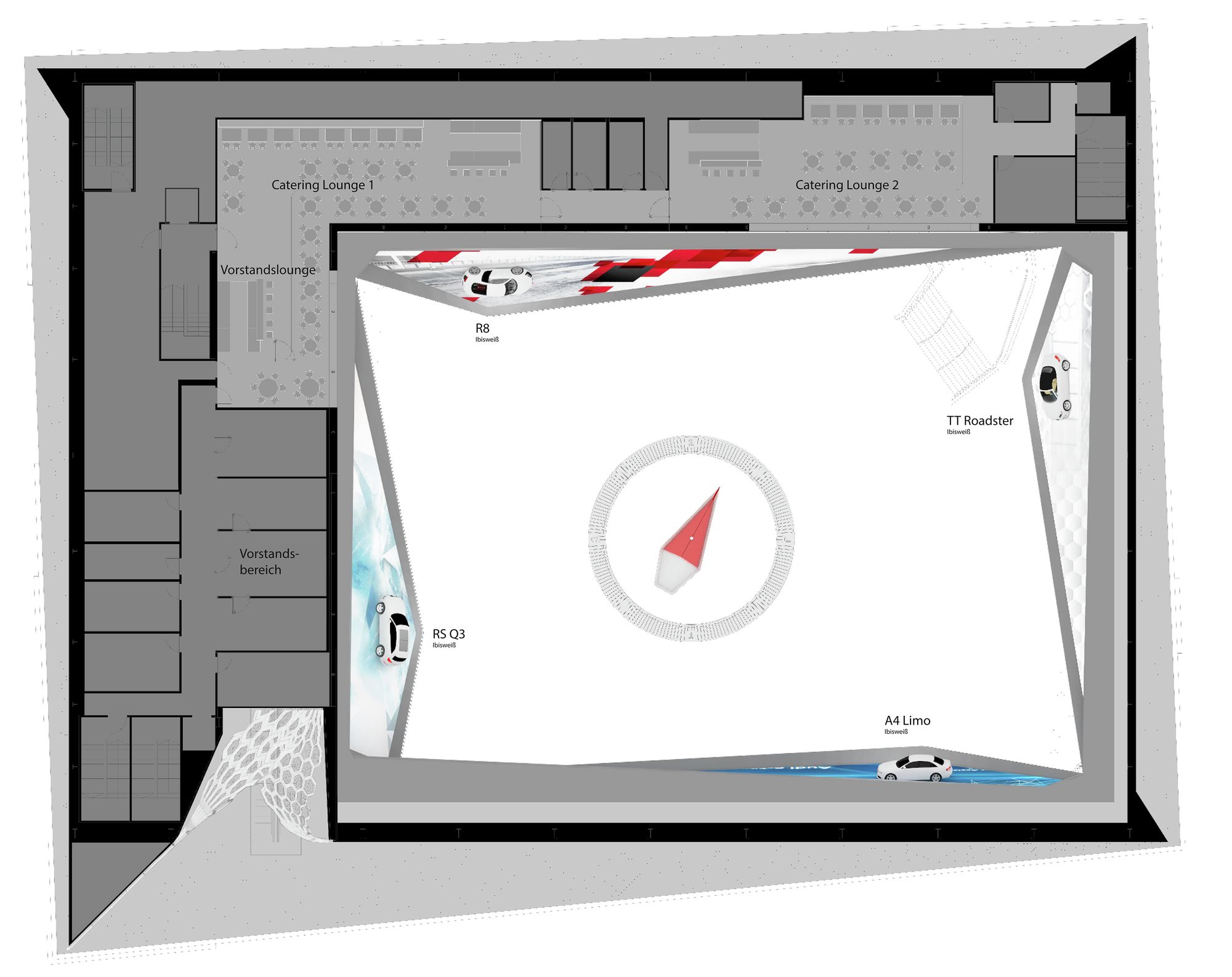 The lightweight 3D structure represents the qualities of lightweight construction techniques, alternative fuel systems, and efficient engines. On walking further, one is hit by a blast of cold, at -21 degrees Celsius, in a universe of ice and ice-carved structures presenting the idea and lifestyle of Audi Quattro in an attempt to physically manifest the concept. The next section gives a tantalizing view of the Audi A4 at the end with the curving entrance to the main hall visible. This would be the Audi Sports section justifying the theme using sound effects and visuals cues to stimulate a race-track environment. The fourth section is highlighted by an impressive vista of the Audi cars arranged in a mannerly way, at the heart of the exhibition building. A kinetic compass installed high above the center, with the new Audi A4 directly beneath it, points to the four focus areas, presented on four huge screens with a real car mounted on top of each. The cars help tell a story by way of movement, lighting and media. The compass needle picks out the focus themes to develop the story. The whole motor-show gets a new dimension thus, changing one’s outlook radically and making it possible to understand first -hand what an Audi car experience is all about without actually sitting inside one. The communication establishes itself in a tangible form which is both simple and intricate at the same time.“Live communication changes your point of view,” – Michael Ostertag-Henning, Managing Partner at SCHMIDHUBER.