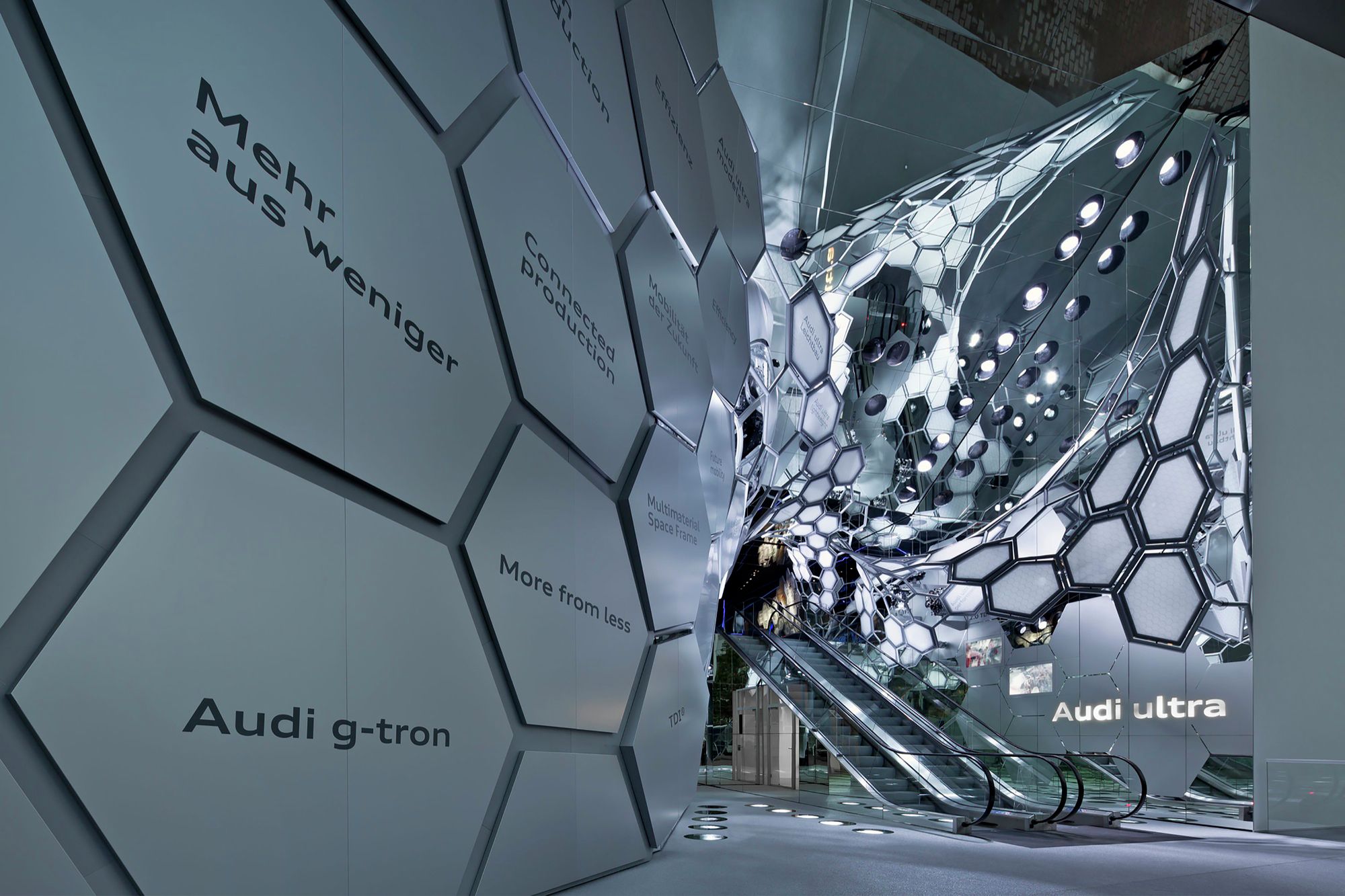 Every year is a new high for the Audi International Motor Show. Known for its exceptional designs, the Internationale Automobil-Ausstellung (IAA) has been known to organize the world’s largest motor shows. Frankfurt, the city of trade-fairs has always been an ideal location for IAA, 2015 Audi Motor Show is no exception. What defines this year’s show is the “live communication” theme which gives the whole experience a uniquely Audi-like feel. The concept not only draws one into the whole arena but beautifully helps to understand the design of Audi. It is anticipation that we feel when we enter the four levels up until the main exhibition area, featuring the brand new Audi A4. Dubbed, “the power of the four” by the architects, SCHMIDHUBER, a live presentation in four stages showcasing the focus themes of Audi ultra, Audi Technologies, Quattro, and Audi Sport, each in a way suited to the respective qualities, forms the crux of the experience. “We’ve never developed an exhibition presentation that was as thematically stringent as this one. Never before have we been able to describe the innovations from Audi in such great detail. At the 2015 IAA, we will be offering our visitors more of an experience than ever before. This is a unique combination,” says Luca de Meo, Board Member for Sales and Marketing at AUDI AG As one begins the ‘experience walk’, they are confronted by an exquisitely organic structure projecting itself form the façade of the building, covering it in its network of webs.