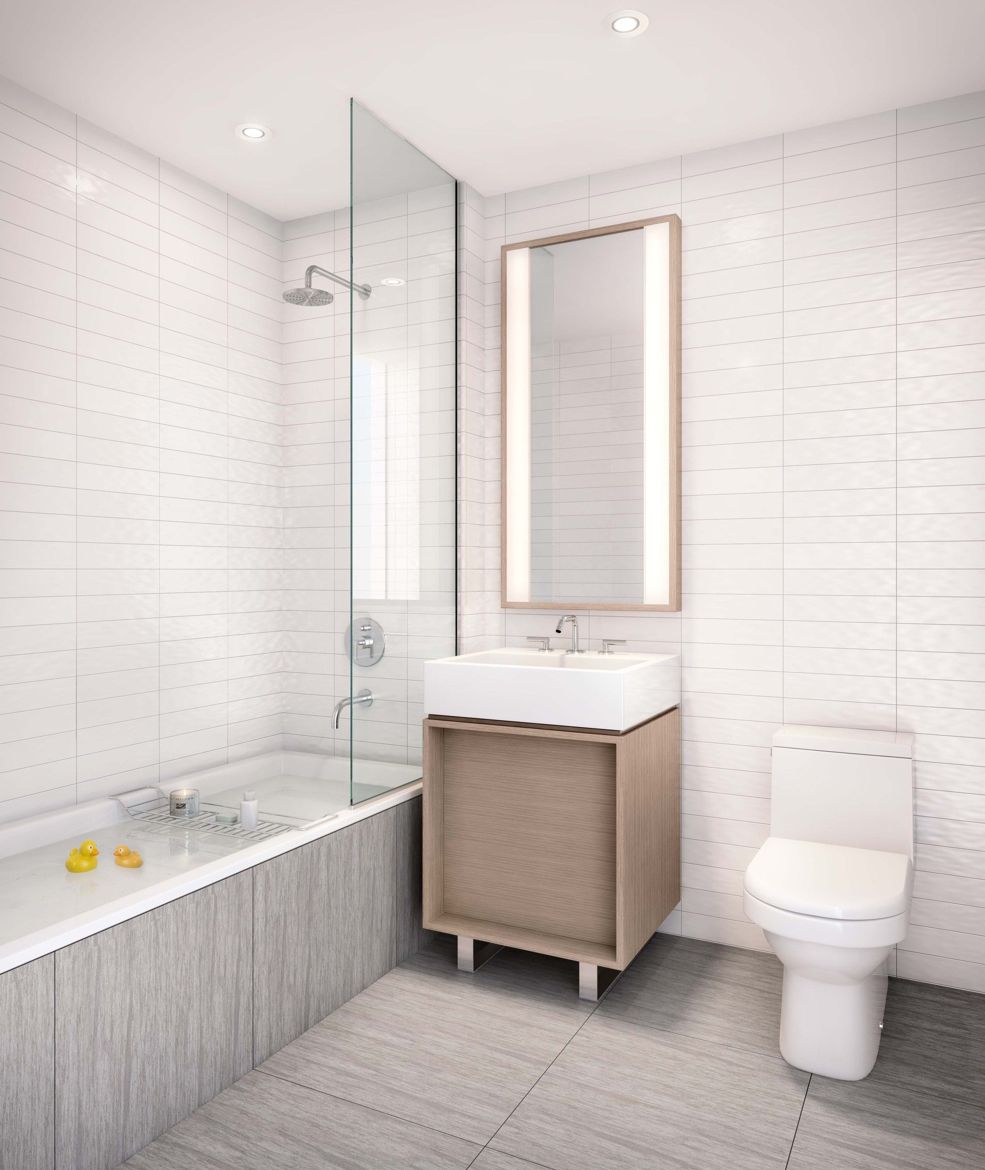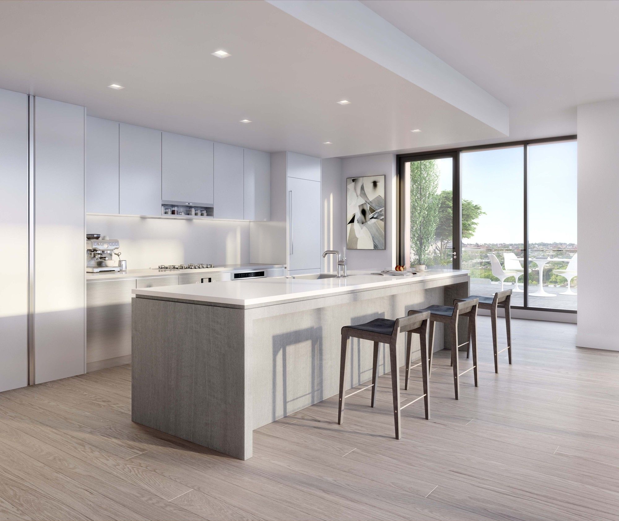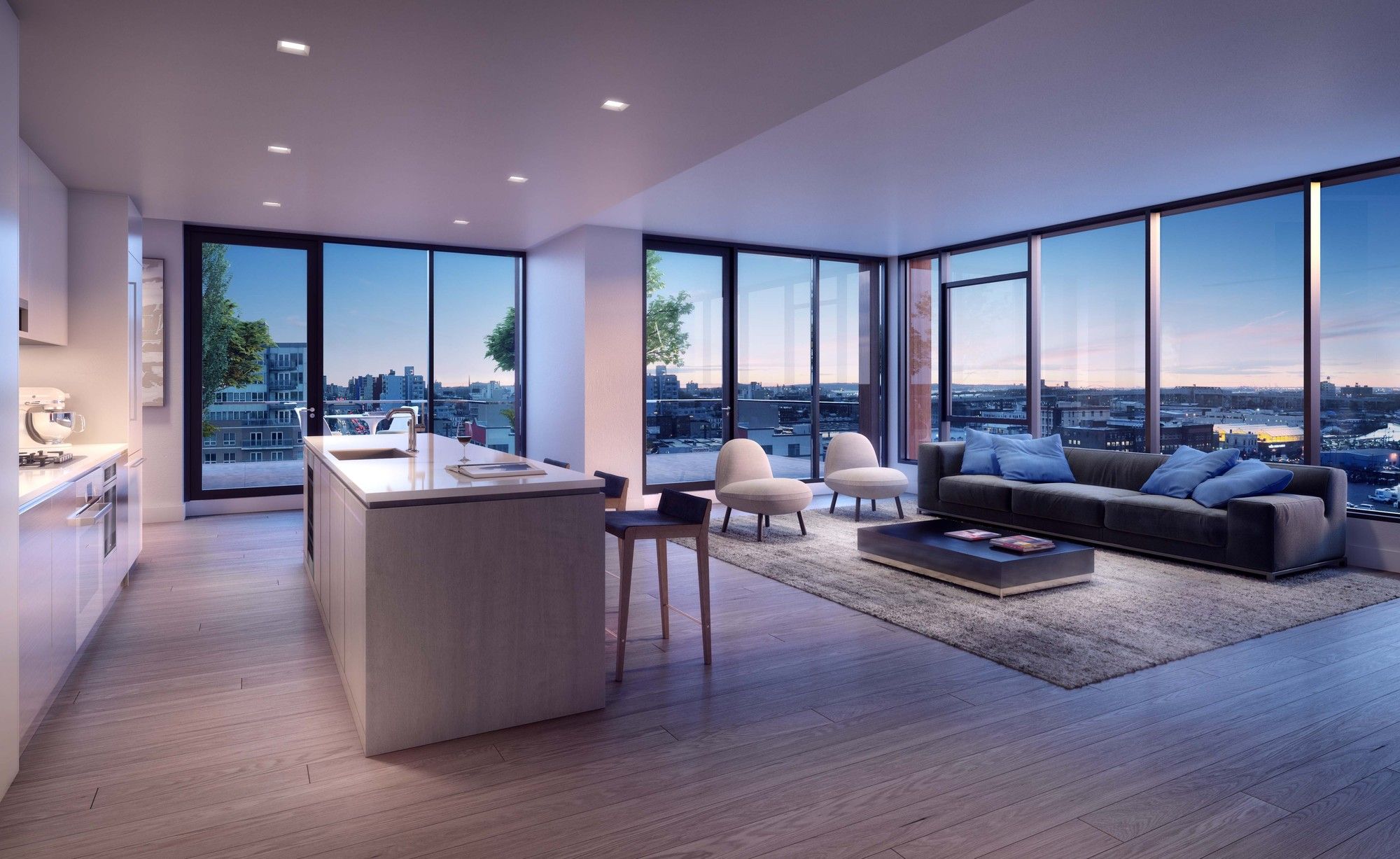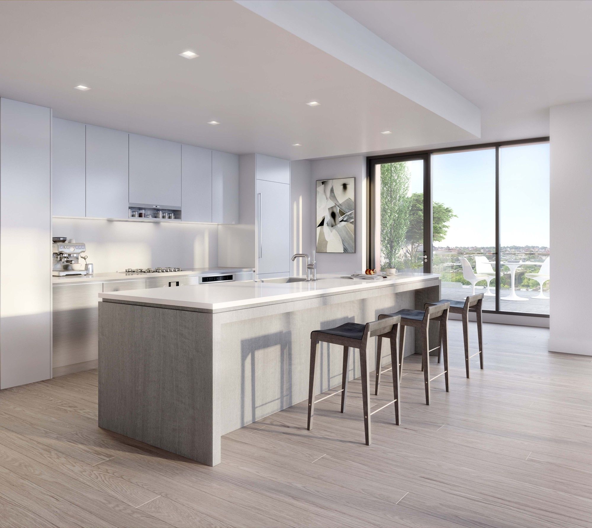 Units, in contrast, feature muted palettes—and are, per usual, elegantly appointed. Wide plank white oaks floors lay beneath soaring ceilings, circumscribed by floor-to- ceiling glass windows and doors. Powder rooms, secondary baths, and master baths are outfitted with Italian marble, imported porcelain, and white honed marble, respectively. And eleven light-filled penthouses boast panoramic vistas reaching from the Manhattan skyline to the Verrezano-Narrows Bridge.