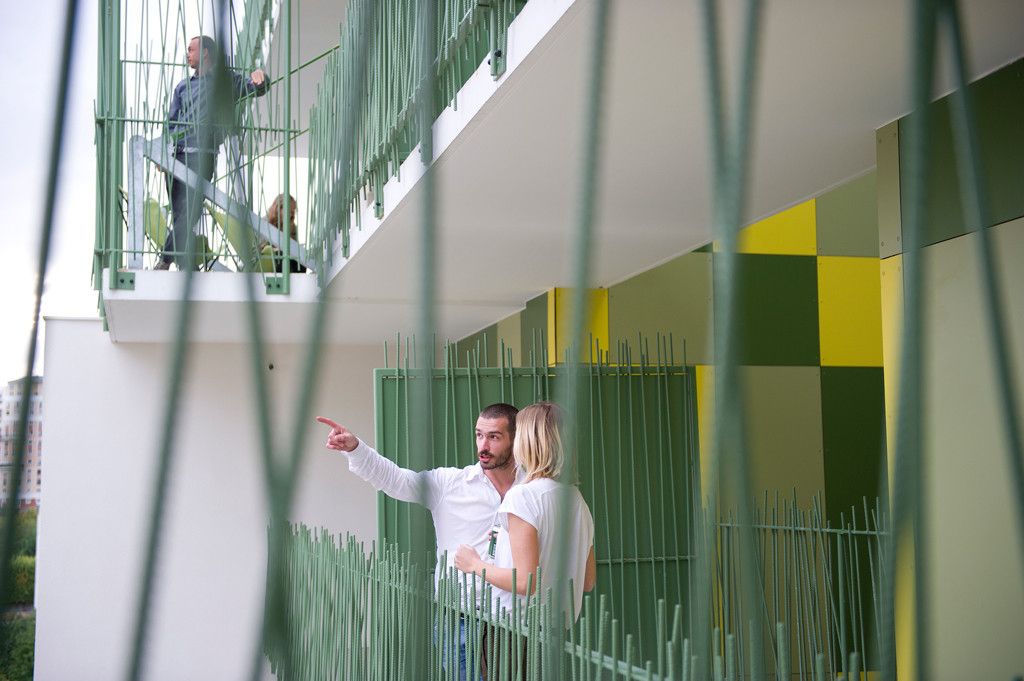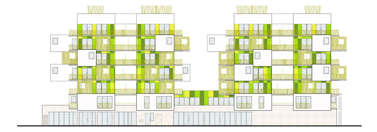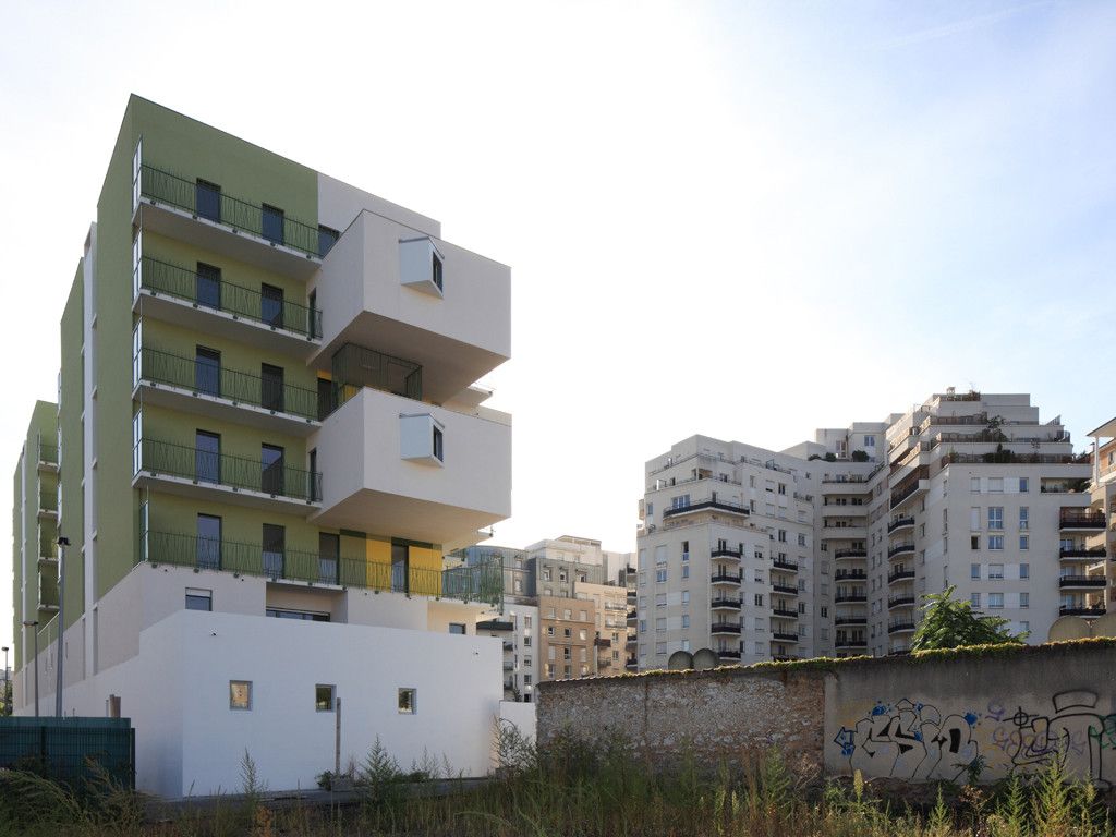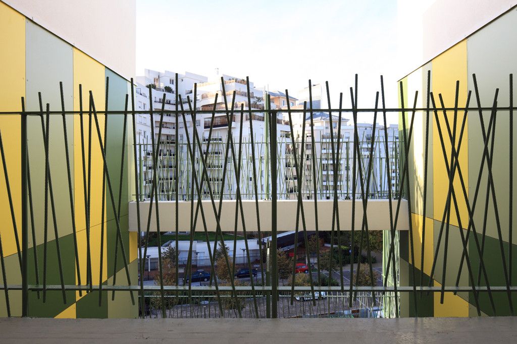 28 Social Housing In Paris designed by KOZ Architectes, The complex comprises 28 apartments, a shop, business premises and a basement for parking. Reinforced concrete structural system. Coloured high-density laminated panels. Rain-water collection, planted roof, heated flooring, external wood/ aluminum joinery, loggia and private walkways for all apartments.