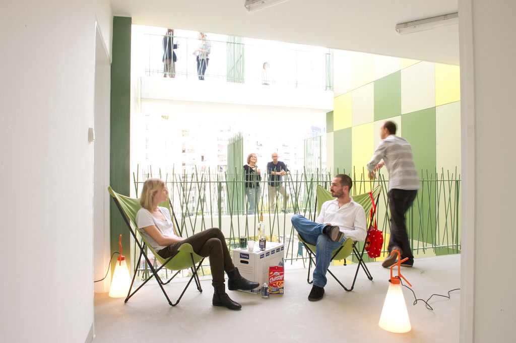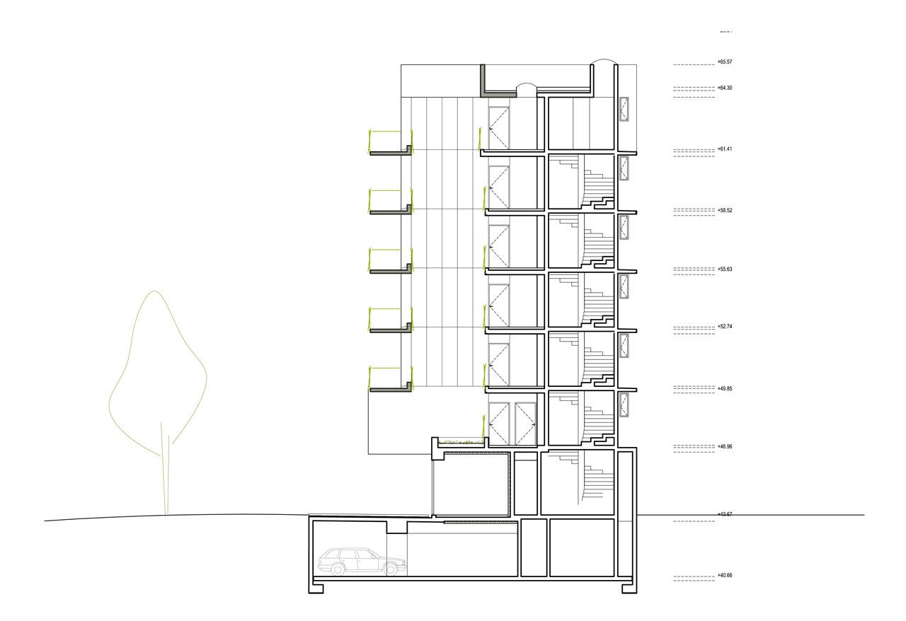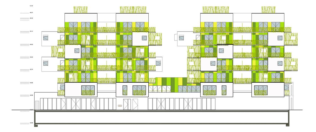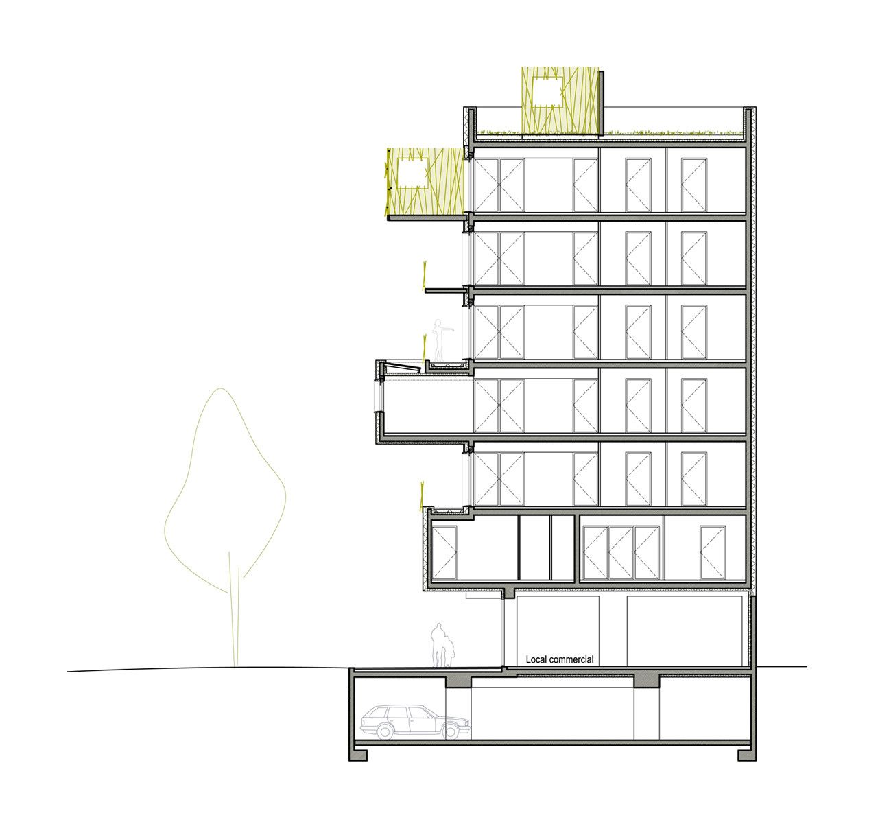 28 Social Housing In Paris designed by KOZ Architectes, The complex comprises 28 apartments, a shop, business premises and a basement for parking. Reinforced concrete structural system. Coloured high-density laminated panels. Rain-water collection, planted roof, heated flooring, external wood/ aluminum joinery, loggia and private walkways for all apartments.