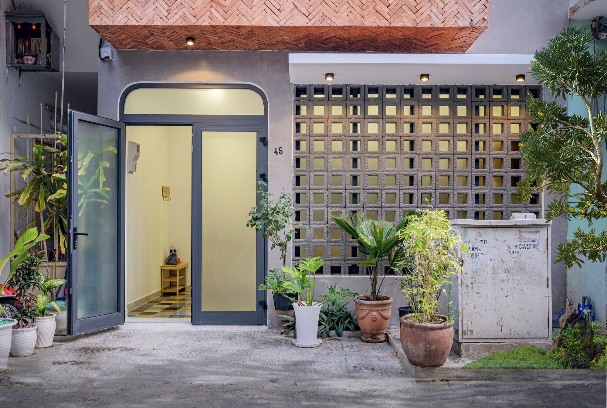 Thus, with the given requirements, we combined plants with raw color materials such as: Red brick tone, cement wall outside to paint a natural and rustic exterior. The main highlight of the interior is wood; the wall was painted white tone to help the space become wider and more luxurious. The economic problem is the point that we are most satisfied with in the design of 45 House. As the cost of building the house is very reasonable for the young couple. At the same time, the front of the house is also distinctive and prominent in the small alley.