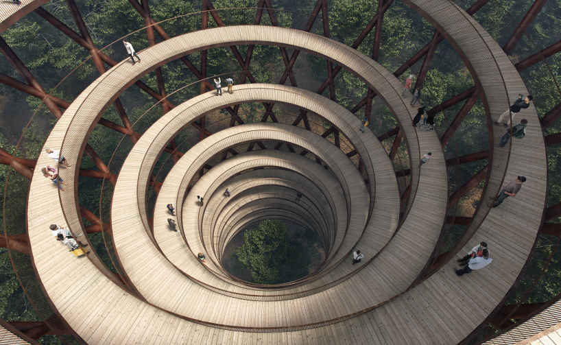 Copenhagen-based architecture office EFFEKT designs a spiraling observation tower and a treetop walkway that overlook the Gisselfeld Klosters Skove forest in Haslev, south of Copenhagen, Denmark. The 45-meter-tall tower will be located amidst the lush greenery, creeks, and wetlands of the forest’s distinctive hilly landscape. It will be seamlessly connected to a 600-meter-long walkway that goes between the trees, providing a uniquely immersive experience for all visitors.