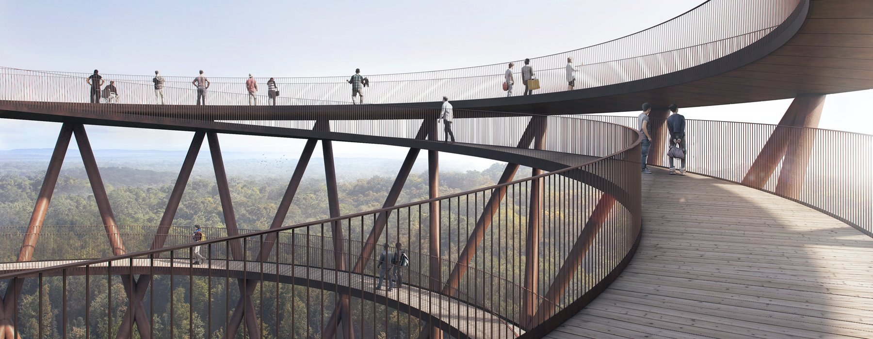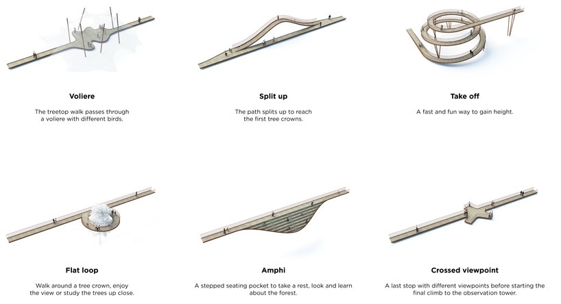 The treetop walkway is split into two routes. The higher route passes through the older parts of the forest, while the lower route passes through the younger are where the tower is, also, located. The tower will be supported via a Corten steel lattice structure which shall have minimal impact on the surrounding natural landscape. Its hourglass shape is meant to provide extra stability as well as enhance the visitor experience by providing a broader observation deck.