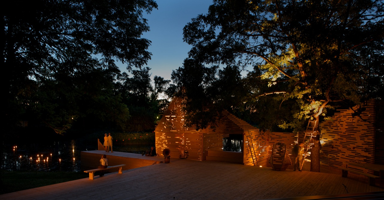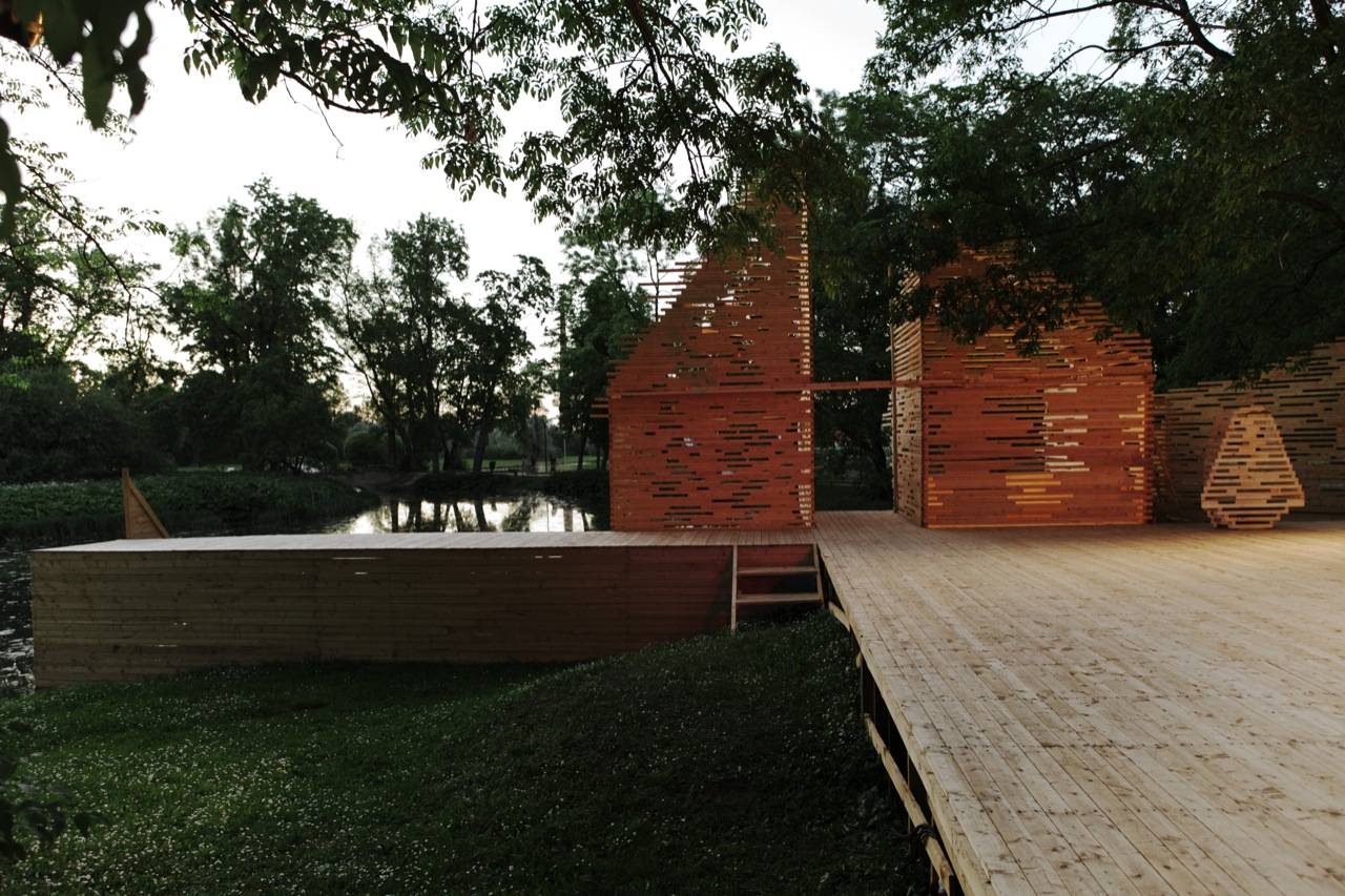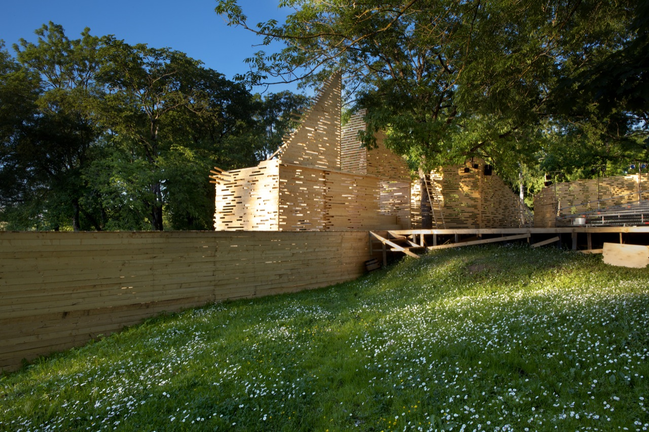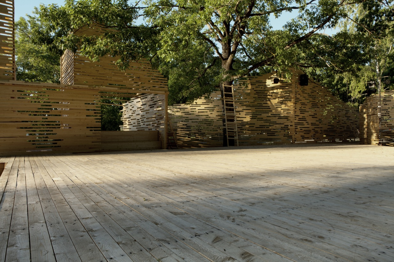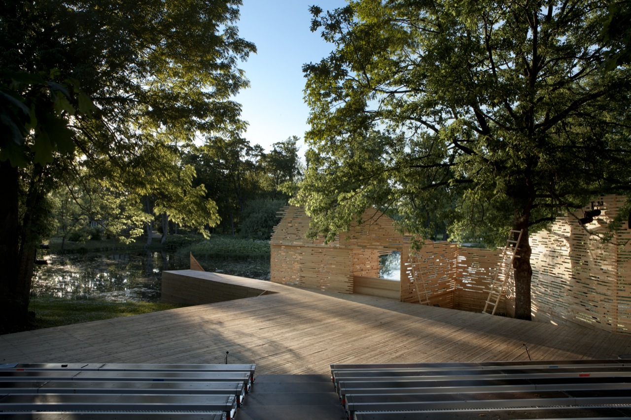 RAKVERE Summer Theater designed by Kadarik Tüür Arhitektid, The outdoor theatre stage is built especially for 12 plays during the summer. Its main architectural goal is to create a closed, comfortable and intimate space that forms an immediate connection with the audience and the actors. The architecture frames the landscape in a way that the park, trees and the pond become an integral part of the stage-set.
