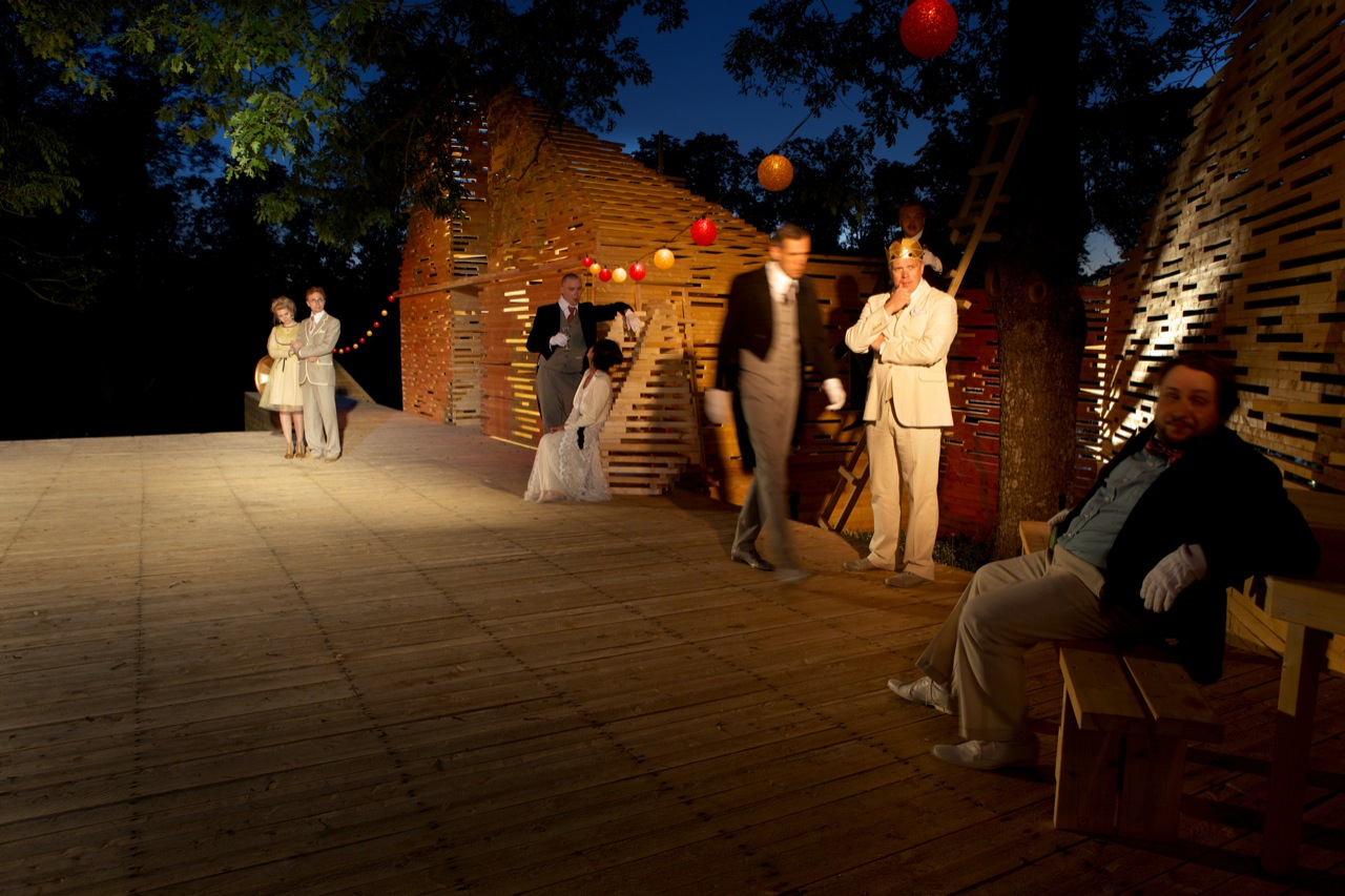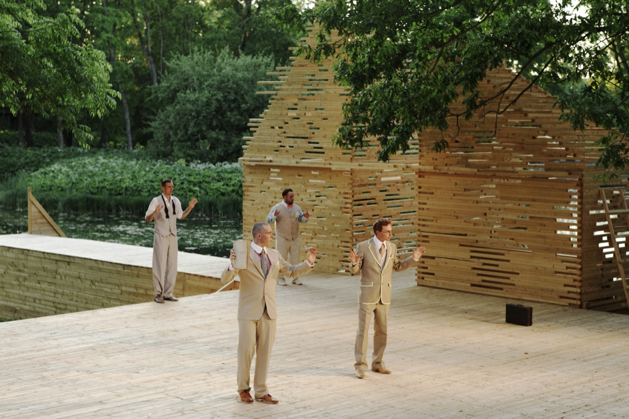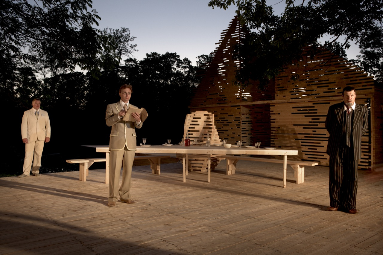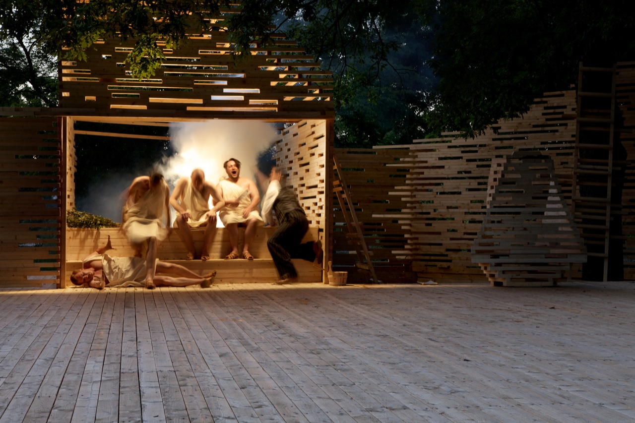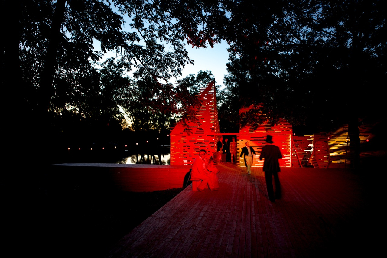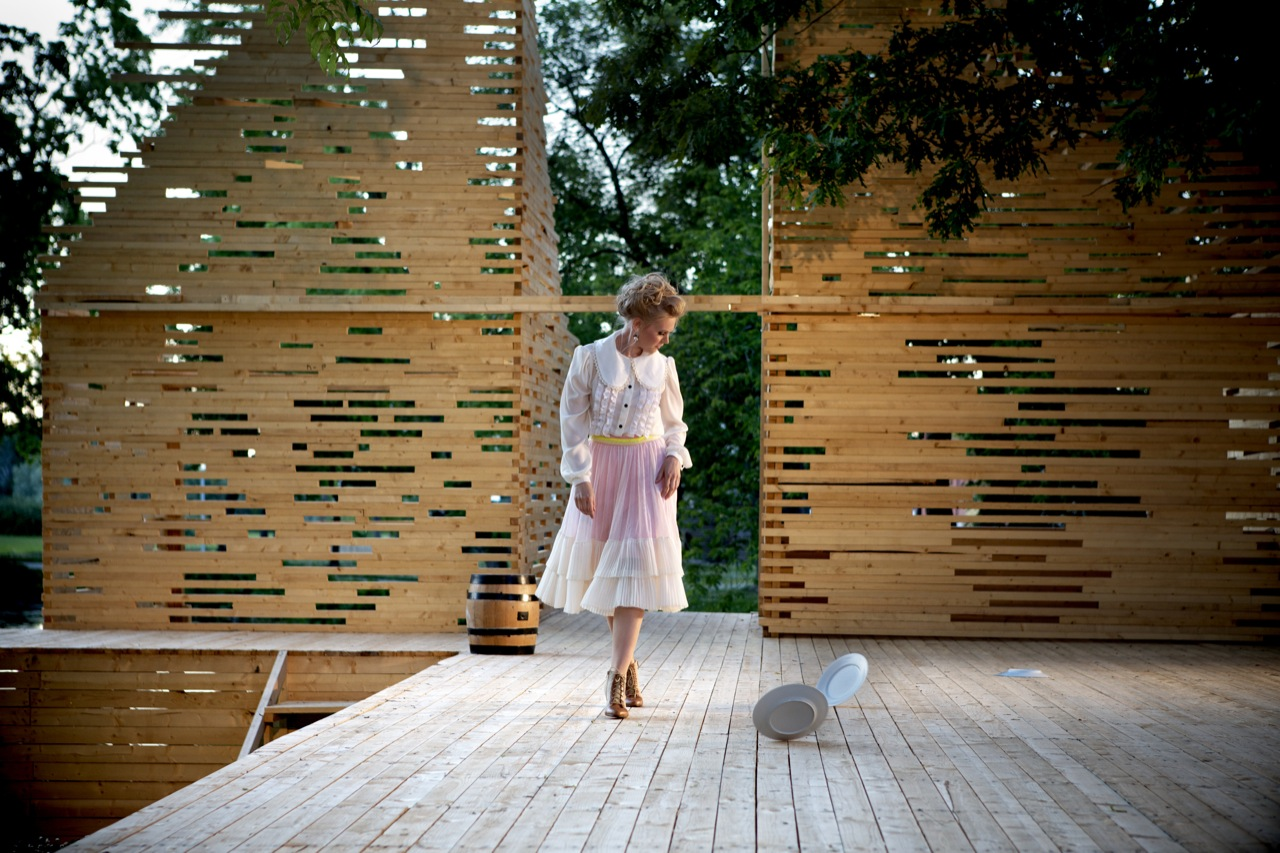 RAKVERE Summer Theater designed by Kadarik Tüür Arhitektid, The outdoor theatre stage is built especially for 12 plays during the summer. Its main architectural goal is to create a closed, comfortable and intimate space that forms an immediate connection with the audience and the actors. The architecture frames the landscape in a way that the park, trees and the pond become an integral part of the stage-set.