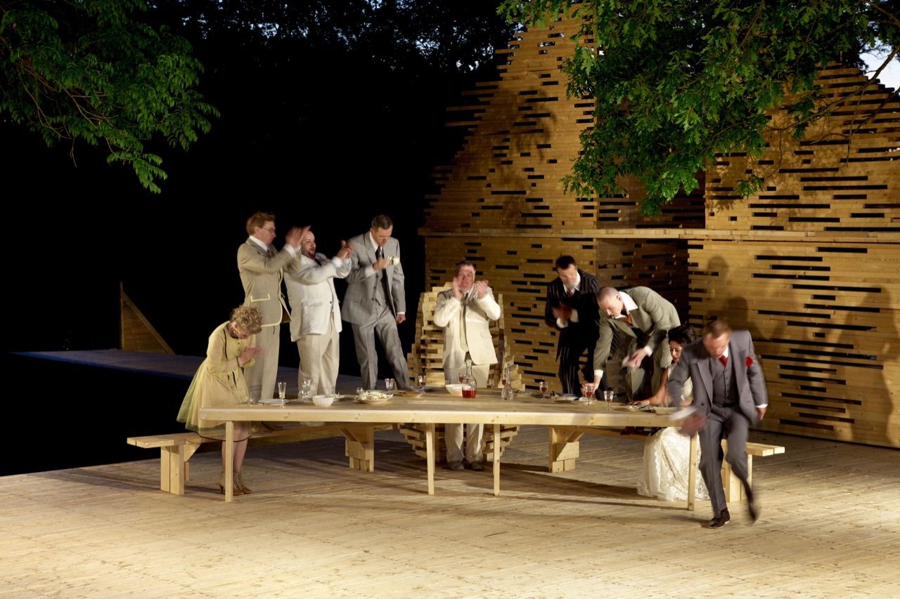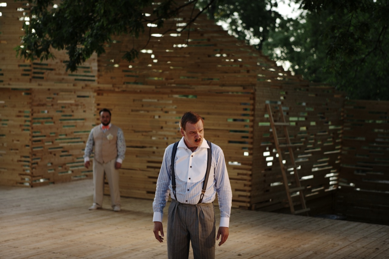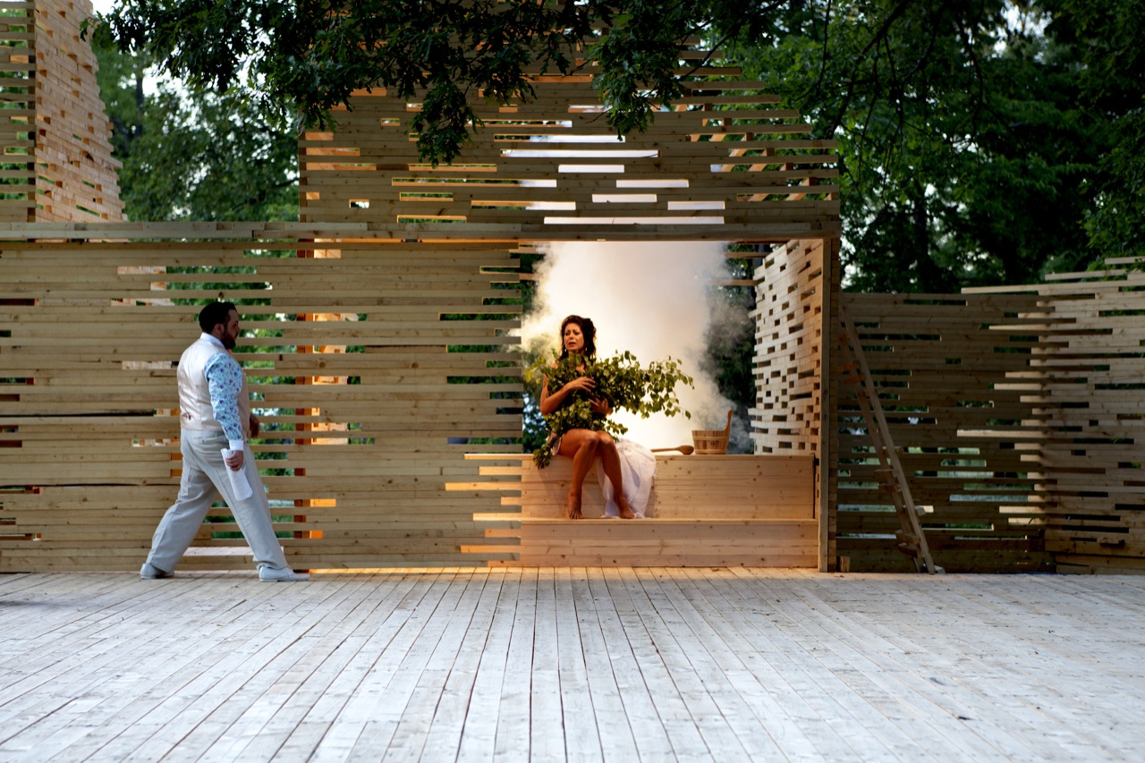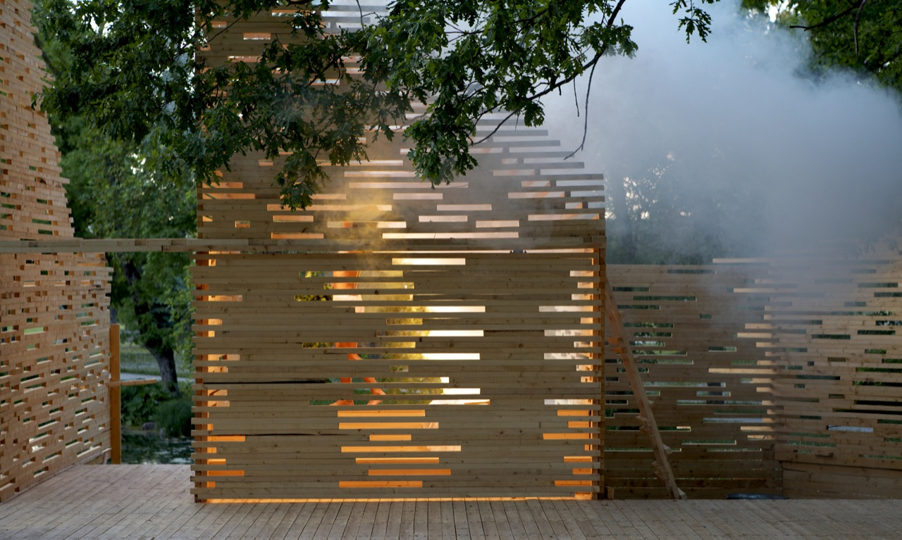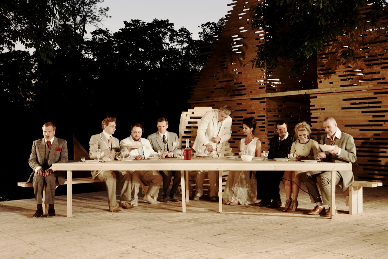 RAKVERE Summer Theater designed by Kadarik Tüür Arhitektid, The outdoor theatre stage is built especially for 12 plays during the summer. Its main architectural goal is to create a closed, comfortable and intimate space that forms an immediate connection with the audience and the actors. The architecture frames the landscape in a way that the park, trees and the pond become an integral part of the stage-set.