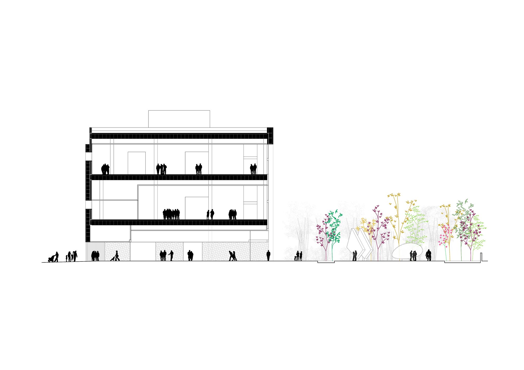 In the southern facade, the main entrance appears as a transverse passage, which is the lobby of the museum and connects us with the sculpture garden, located in the north of the site. The southern facade is metallic, aluminum, bright, solar, mirror and announcement of the events that will be held at the museum. It is closed, protecting the exhibition halls from the direct solar radiation of the south. The facade is pierced by luminous small openings that respond to a triangular geometry, a consequence of the evocative fracture of the lateral movements of the strong hurricane winds. Underneath the metallic plane, floating, a horizontal strip is created on street level, a shadow where the letters of ICA MIAMI appear, large and deep, like the columns that support the building.