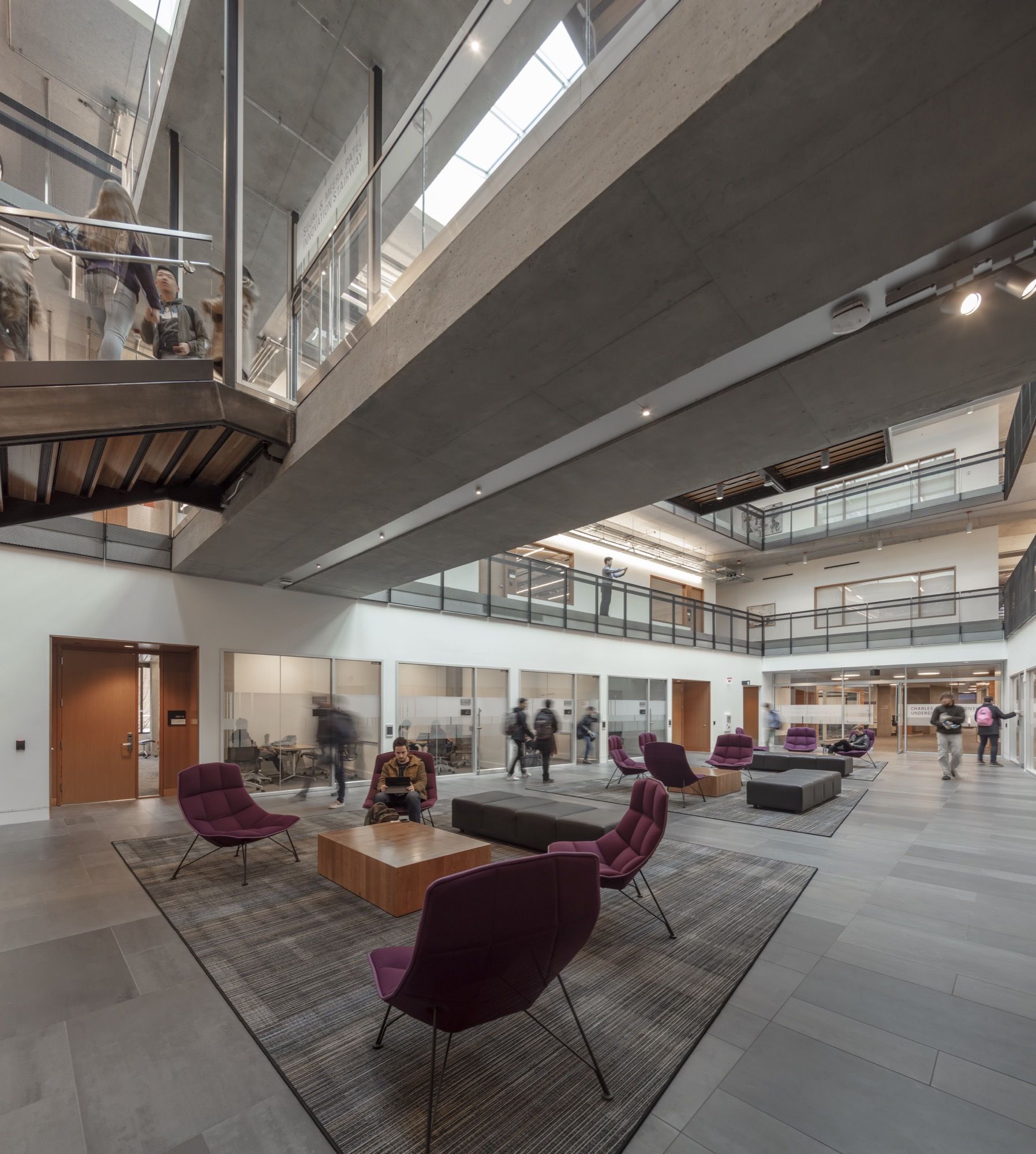 Designed by LMN Architects, The Gates Center greatly expands the current capacity of the school, providing critical research spaces, classrooms and lecture spaces, faculty offices, and a new home to the School’s undergraduate majors. At the heart of the building is a large central atrium that provides visual and physical connections to all floors, and acts as the school’s cultural hub. This daylight atrium is an important social incubator in this technology-centered environment, fostering connections between students, encouraging interaction among teams, and reflecting the department’s culture of innovation and collaboration across disciplines.