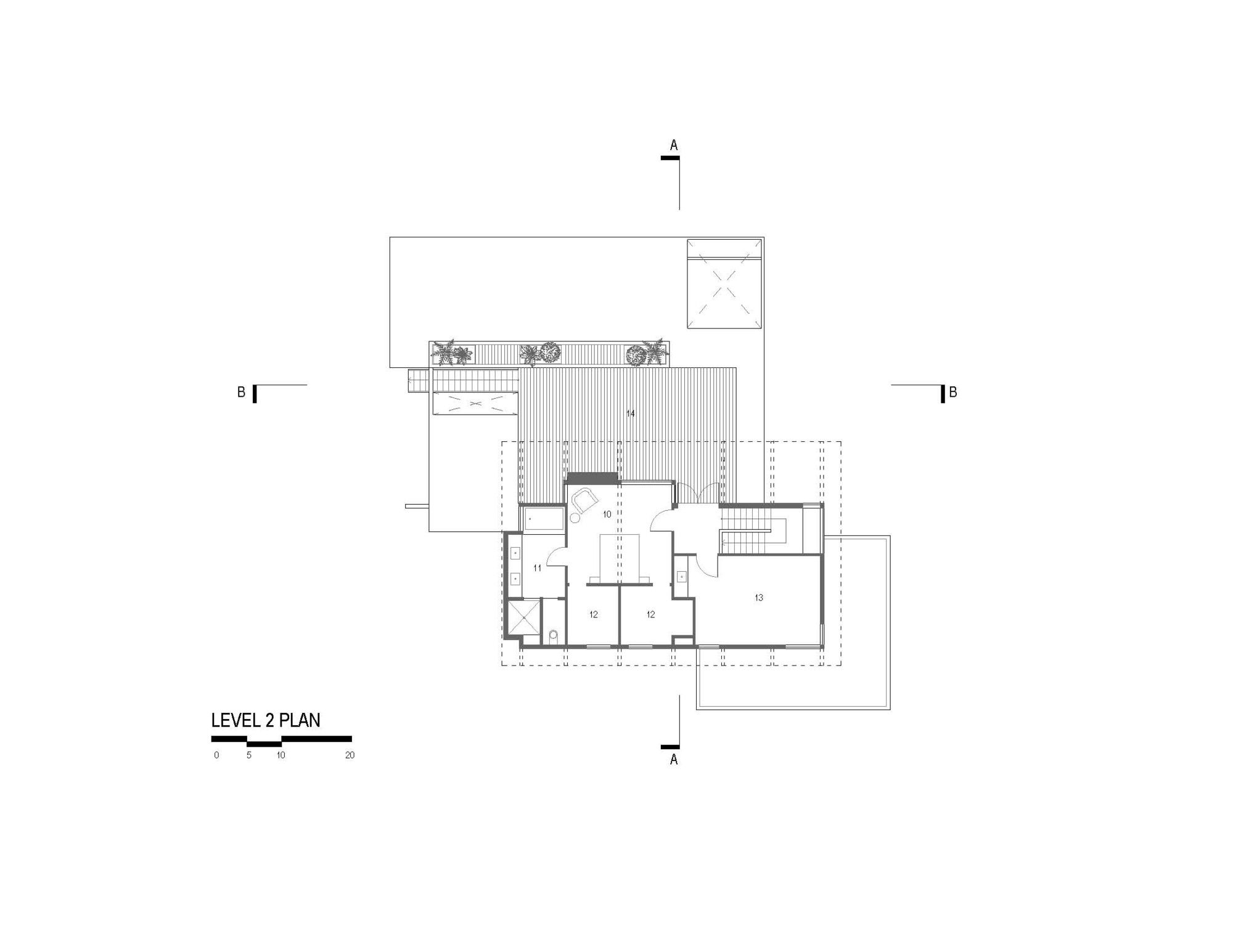 The tectonic design reinforces this vertical procession, starting with a heavy concrete plinth that retains earth at the sunken garage and becomes the foundation, exposed steel wide-flange beams which support the heavy loads of the second story and roof deck, and cantilevered glulam beams at the high roof, that taper up to the sky and orient this level to its primary downtown view.