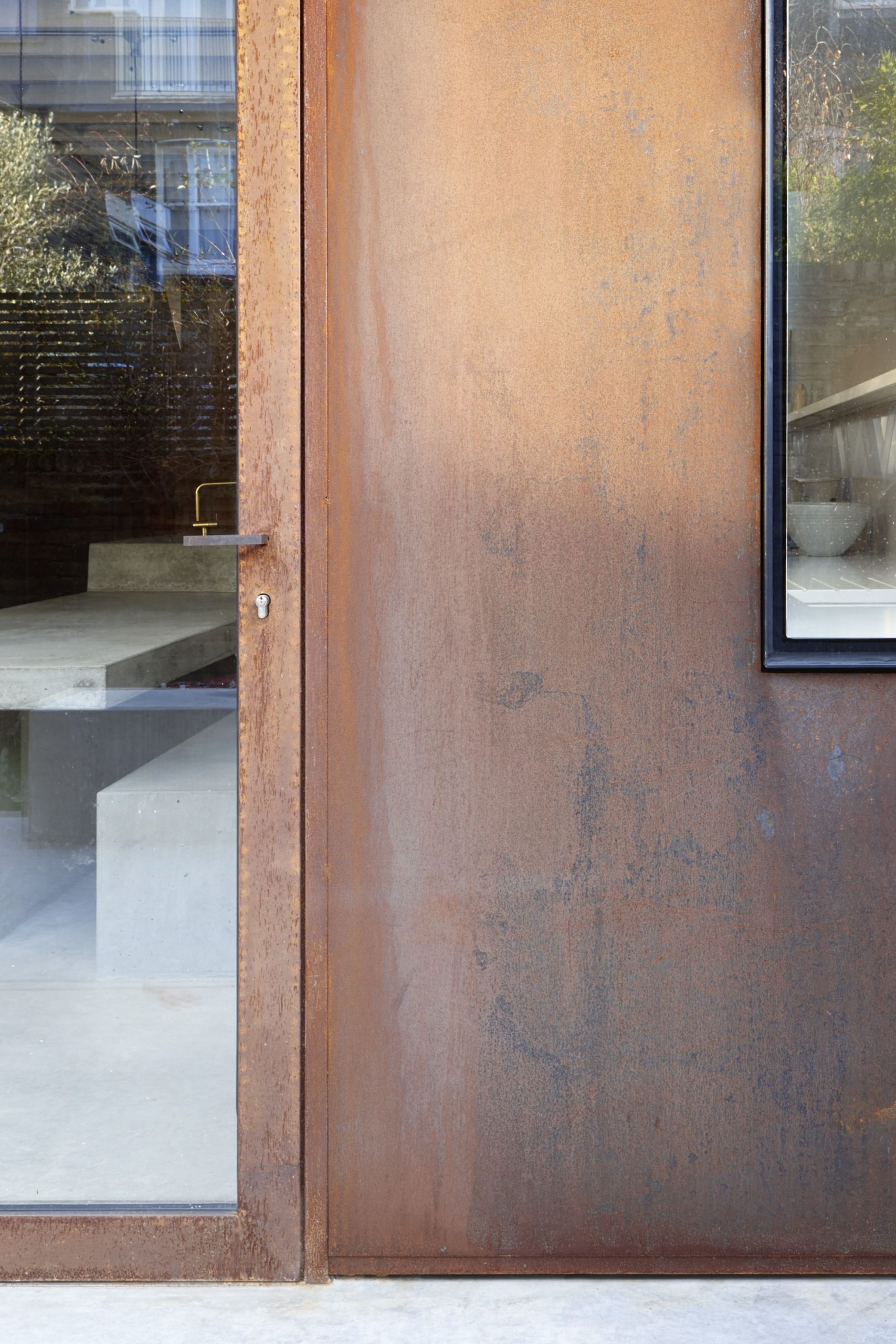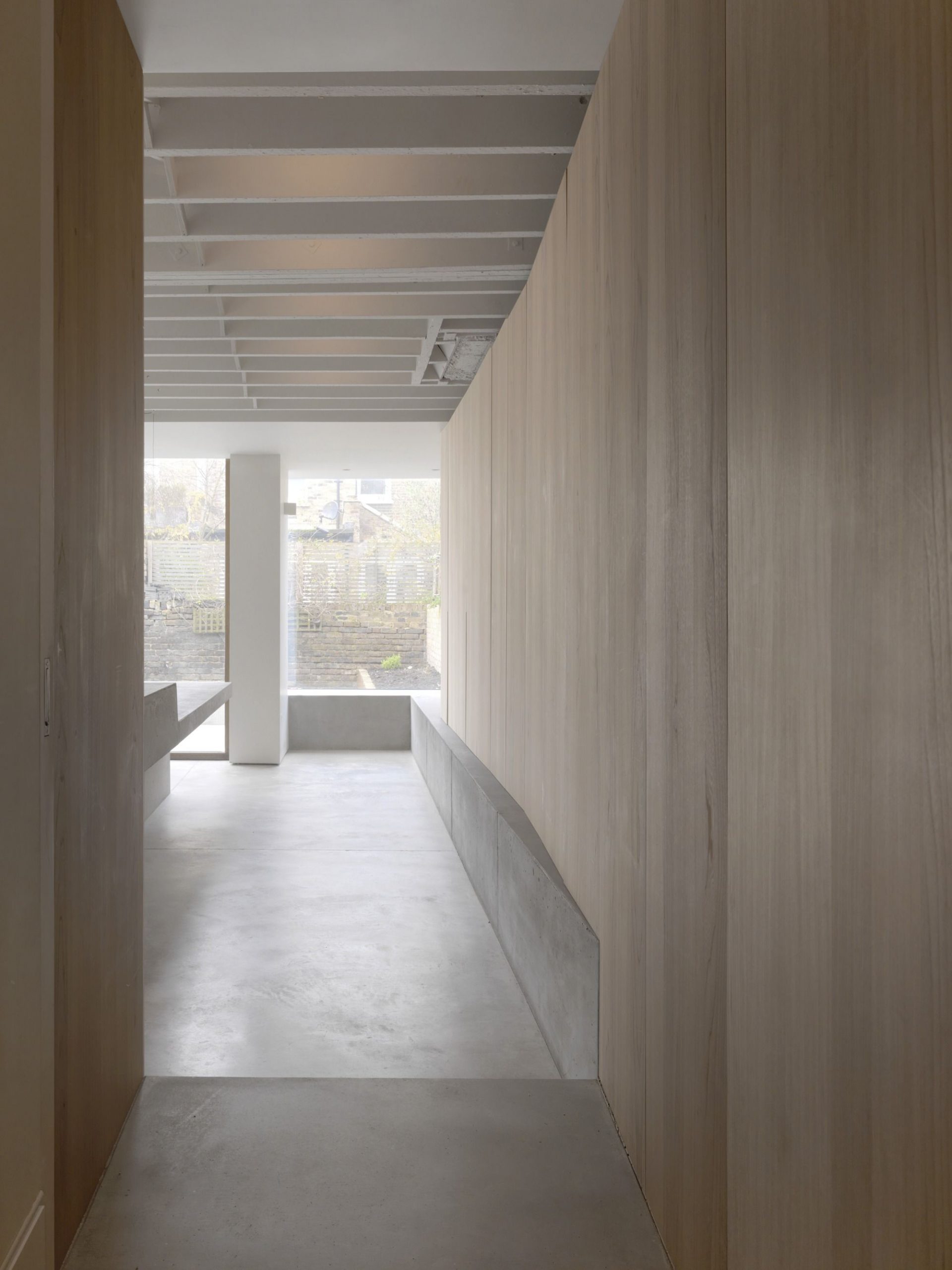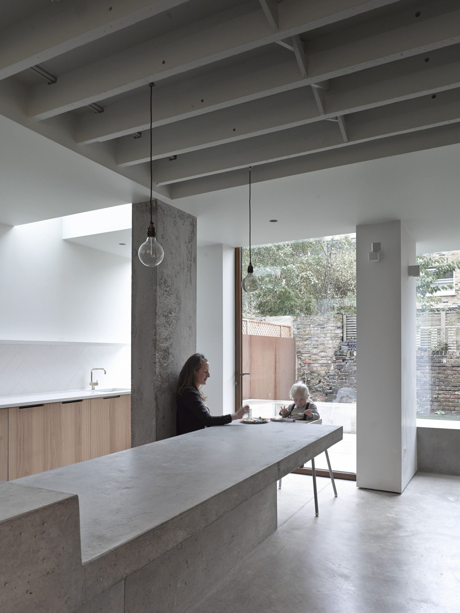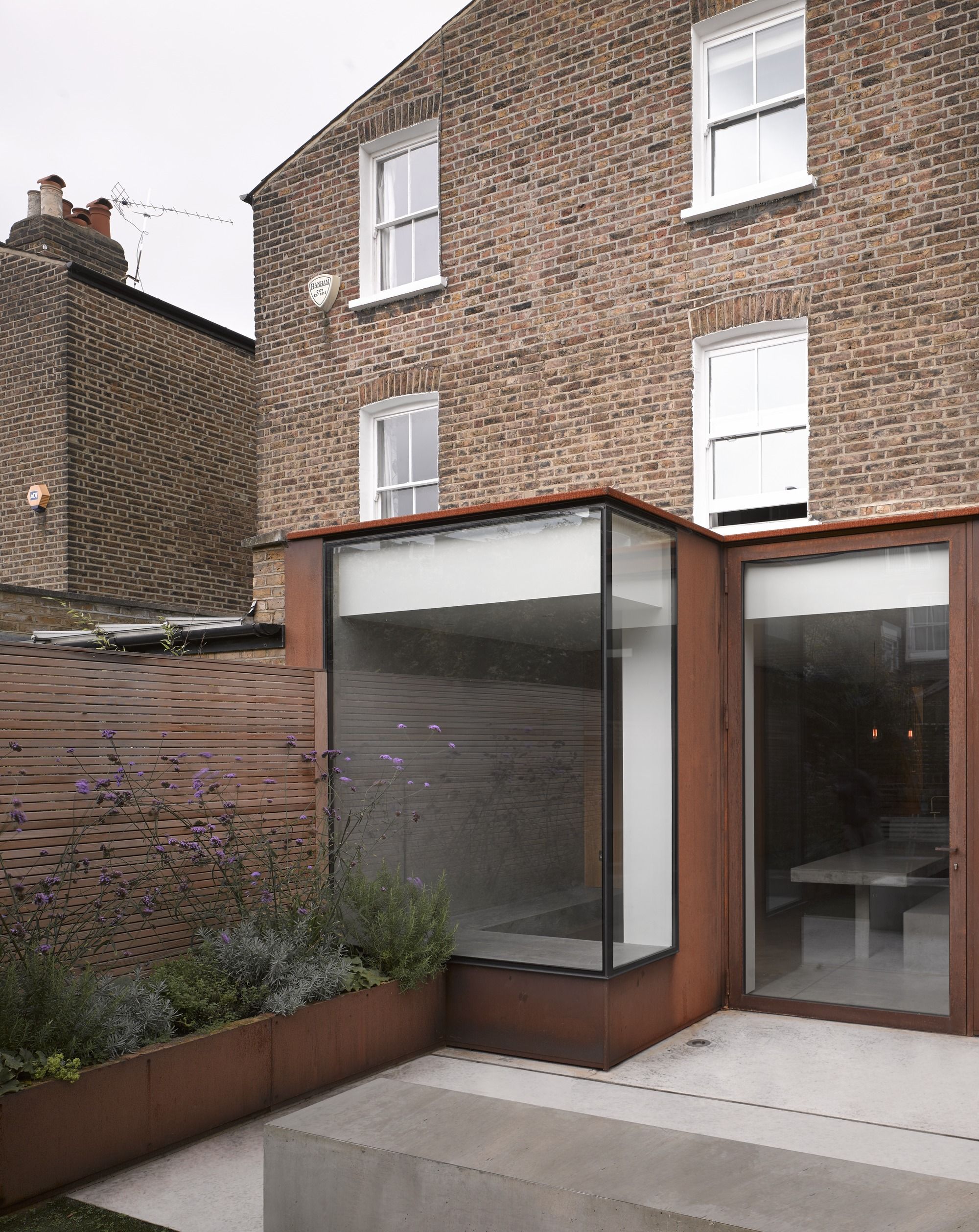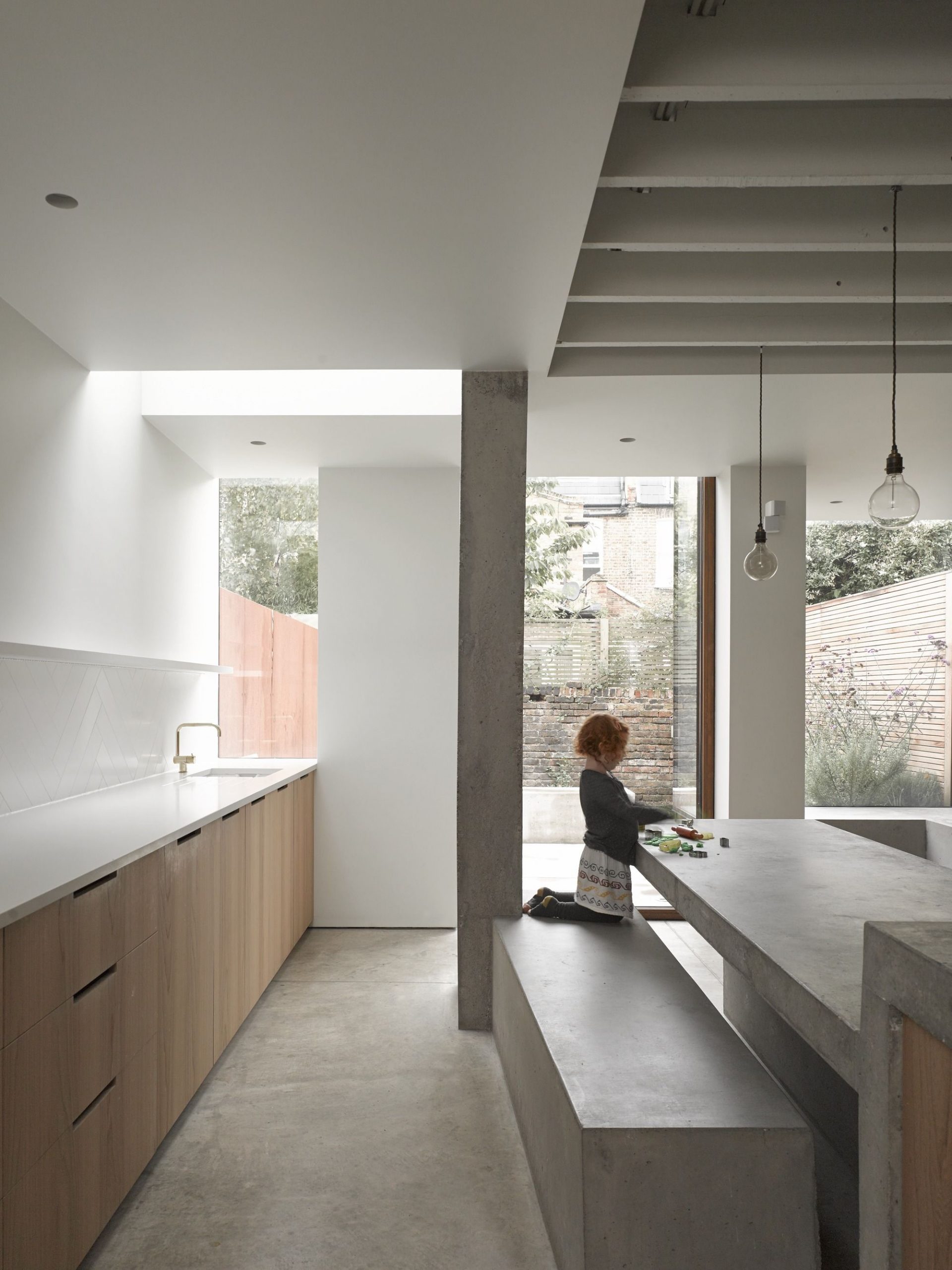 This was a project about making something extraordinary out of the very ordinary. We were approached by Kate and Ewan Thompson to extend and re-furbish their Victorian terraced house in Shepherd’s Bush for a growing family. Our remit was very conventional: a ground floor extension and loft conversion – a potentially hum-drum brief. What wasn’t so conventional was their approach: our task was to come up with a design which rejected the typical solutions with aspirations beyond the planning-friendly aesthetics of a London terraced house extension. From the outset, discussions centred around the use of insitu concrete: for floors, walls and ‘furniture’ elements within the scheme. As the dominant material presence, concrete was chosen primarily for its aesthetic qualities but the opportunity to build in high thermal mass and develop free-form structures became increasingly important considerations as the project progressed. As a point of reference concrete then became the driver for all other material decisions. The facade of the extension is clad in rusted Corten steel and the interior joinery fronts made from Grey Elm- both providing the necessary contrast, warmth and richness against the cool swathes of smooth concrete. Presenting fewer opportunities for spatial invention, the loft conversion has a very different, more ethereal feel to the ground floor. A reductive palette of Scandinavian white-washed Douglas Fir boards, light walls and exposed brickwork keep it simple and bright. The Victorian stairwell winds up the house and collides with the new loft staircase – a meeting between the old and the new – which leads up to the top landing and is illuminated with natural daylight from the rooflight above. The treads of the staircase lead on to a large expanse of Douglas Fir boards which flood the room and run up the walls as panelling.