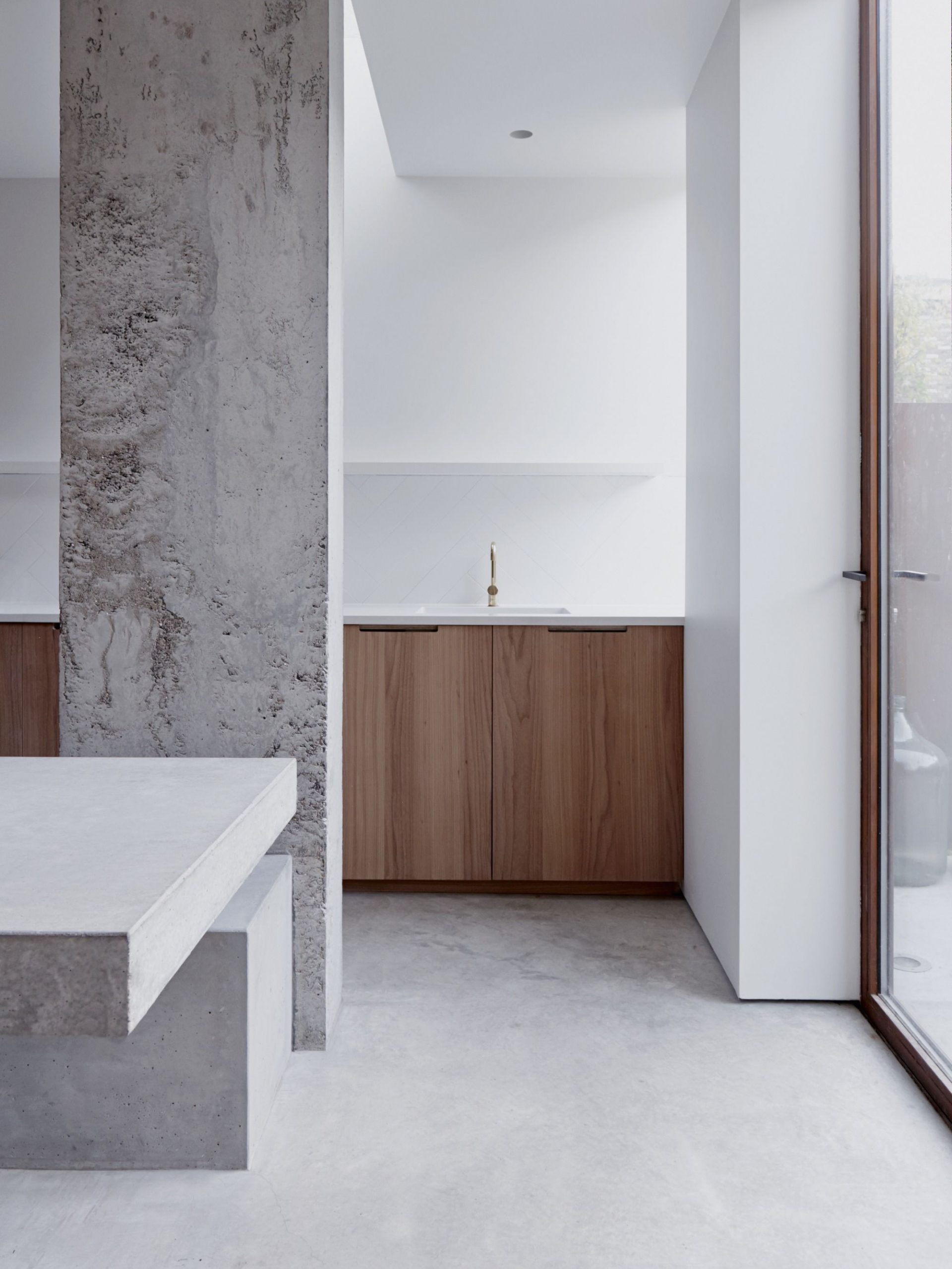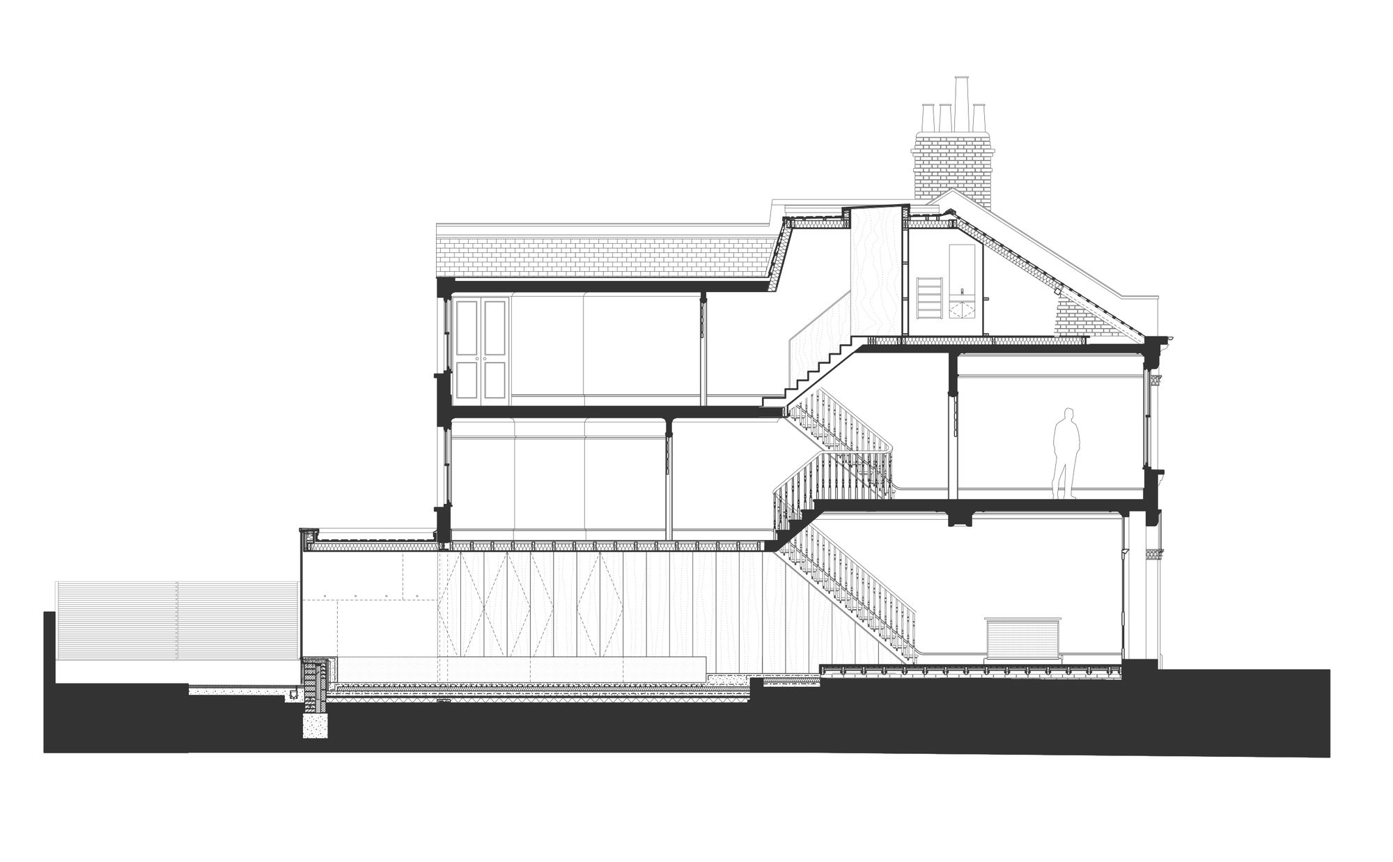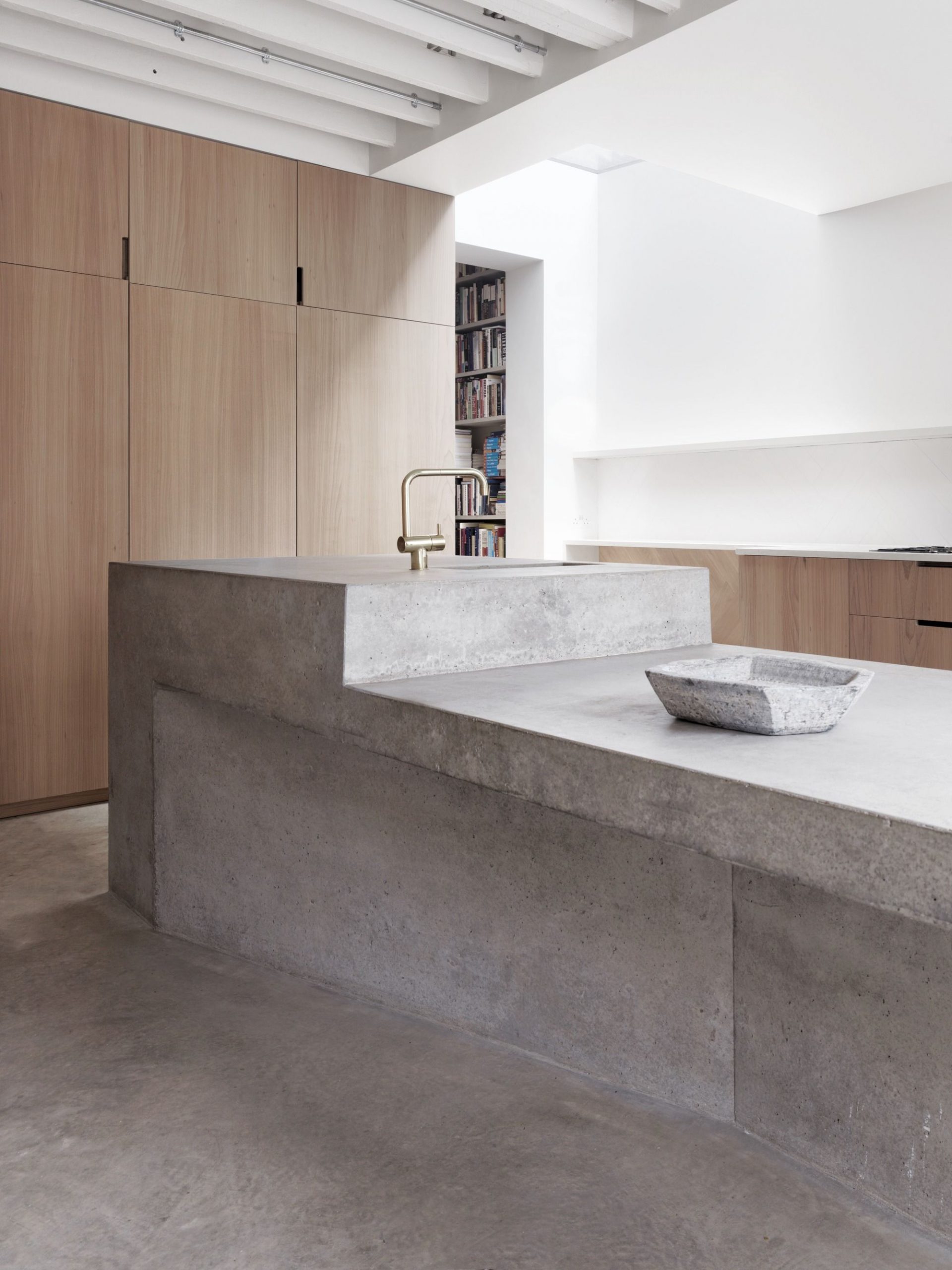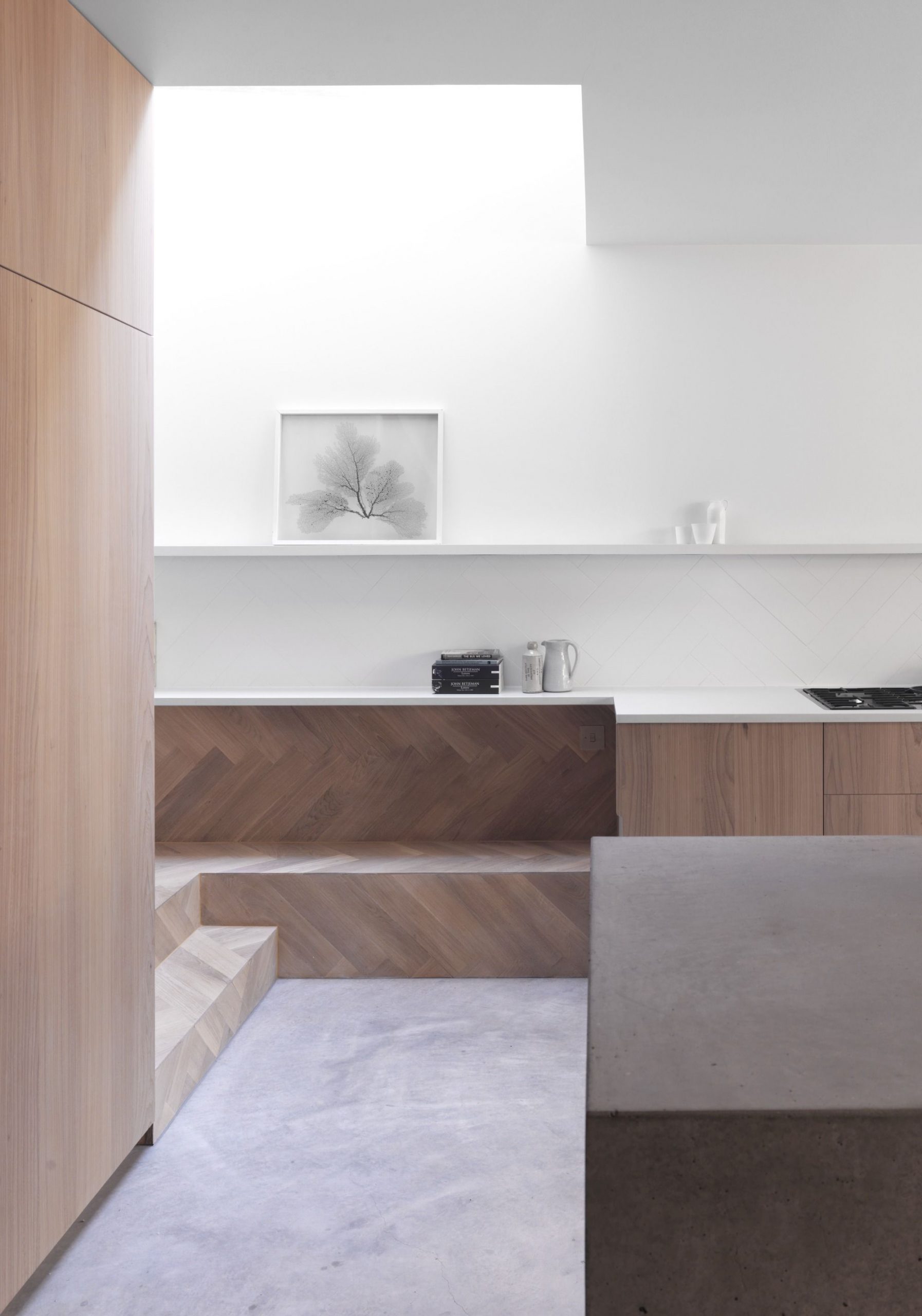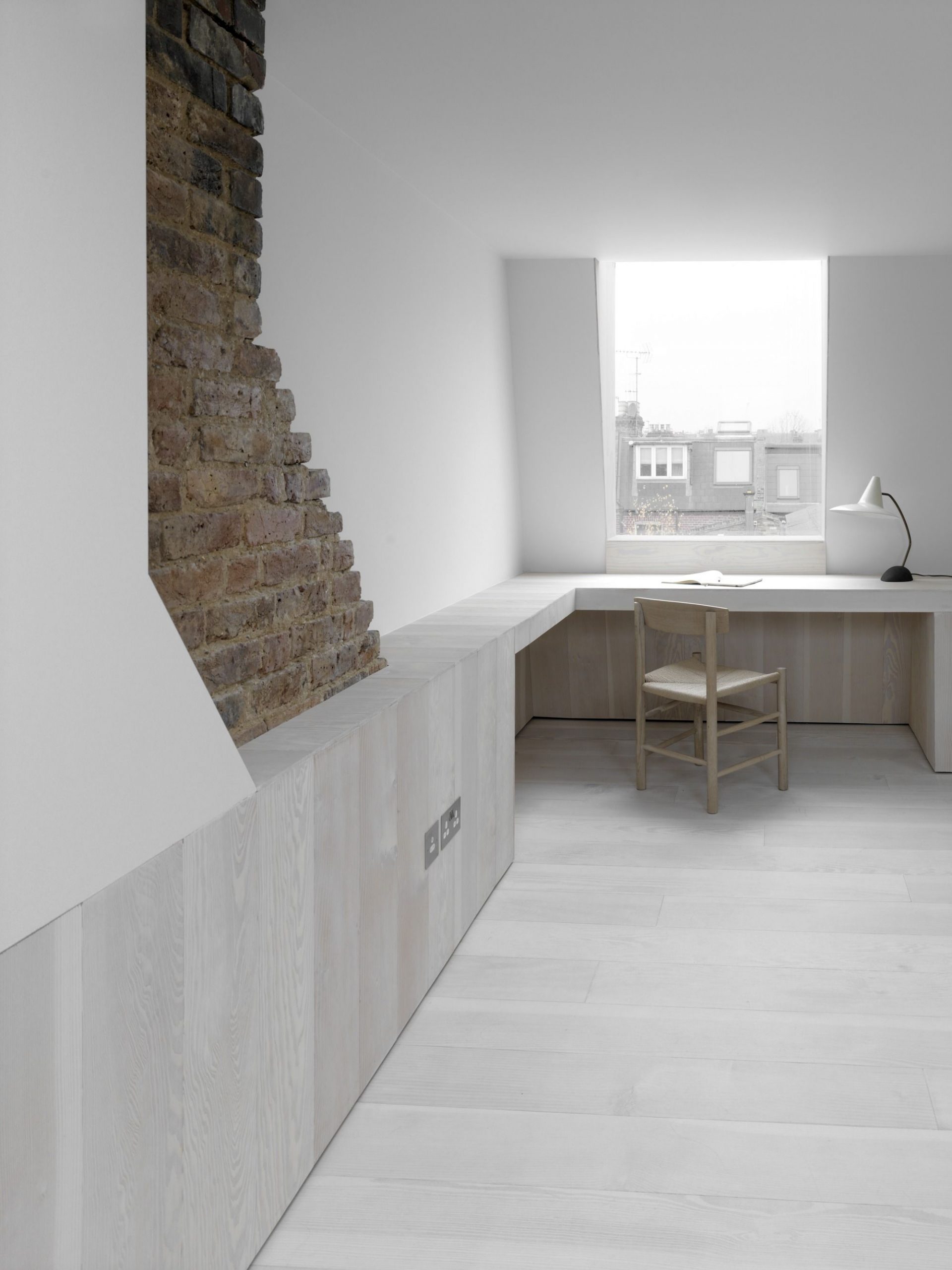 This was a project about making something extraordinary out of the very ordinary. We were approached by Kate and Ewan Thompson to extend and re-furbish their Victorian terraced house in Shepherd’s Bush for a growing family. Our remit was very conventional: a ground floor extension and loft conversion – a potentially hum-drum brief. What wasn’t so conventional was their approach: our task was to come up with a design which rejected the typical solutions with aspirations beyond the planning-friendly aesthetics of a London terraced house extension. From the outset, discussions centred around the use of insitu concrete: for floors, walls and ‘furniture’ elements within the scheme. As the dominant material presence, concrete was chosen primarily for its aesthetic qualities but the opportunity to build in high thermal mass and develop free-form structures became increasingly important considerations as the project progressed. As a point of reference concrete then became the driver for all other material decisions. The facade of the extension is clad in rusted Corten steel and the interior joinery fronts made from Grey Elm- both providing the necessary contrast, warmth and richness against the cool swathes of smooth concrete. Presenting fewer opportunities for spatial invention, the loft conversion has a very different, more ethereal feel to the ground floor. A reductive palette of Scandinavian white-washed Douglas Fir boards, light walls and exposed brickwork keep it simple and bright. The Victorian stairwell winds up the house and collides with the new loft staircase – a meeting between the old and the new – which leads up to the top landing and is illuminated with natural daylight from the rooflight above. The treads of the staircase lead on to a large expanse of Douglas Fir boards which flood the room and run up the walls as panelling.
