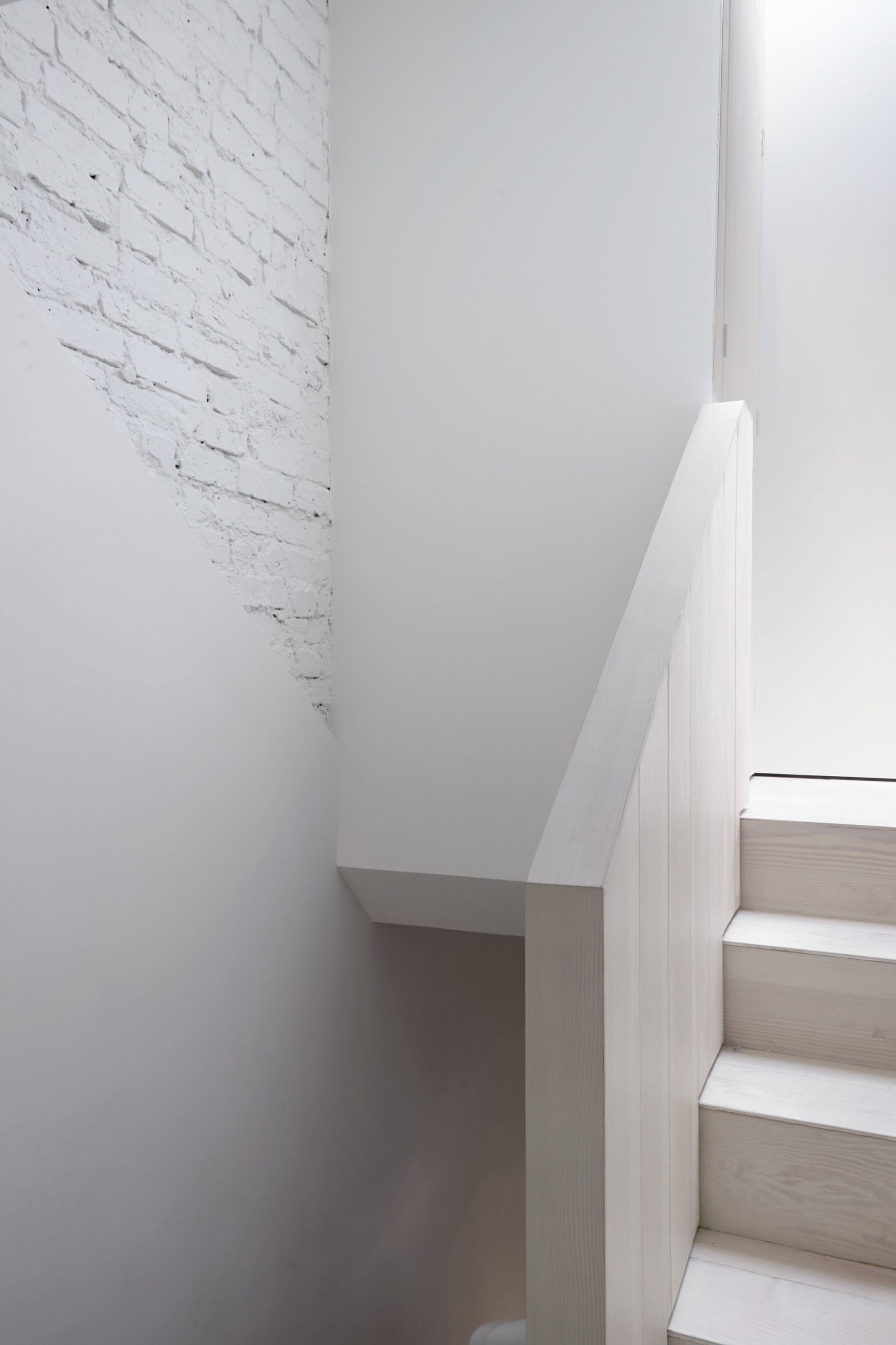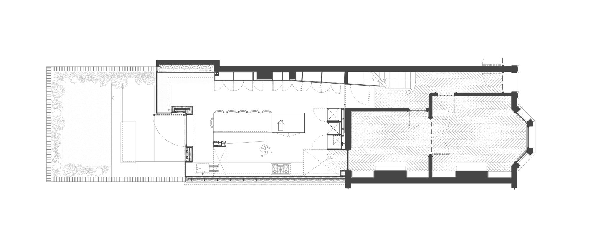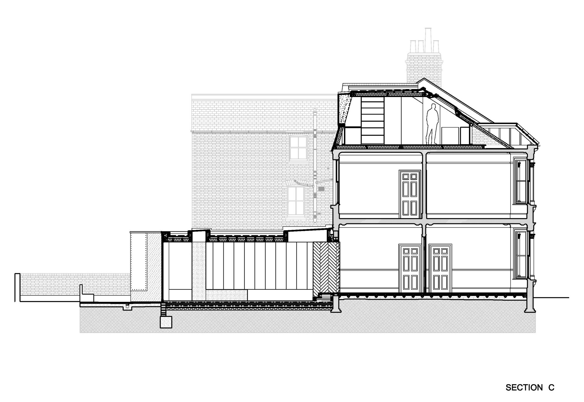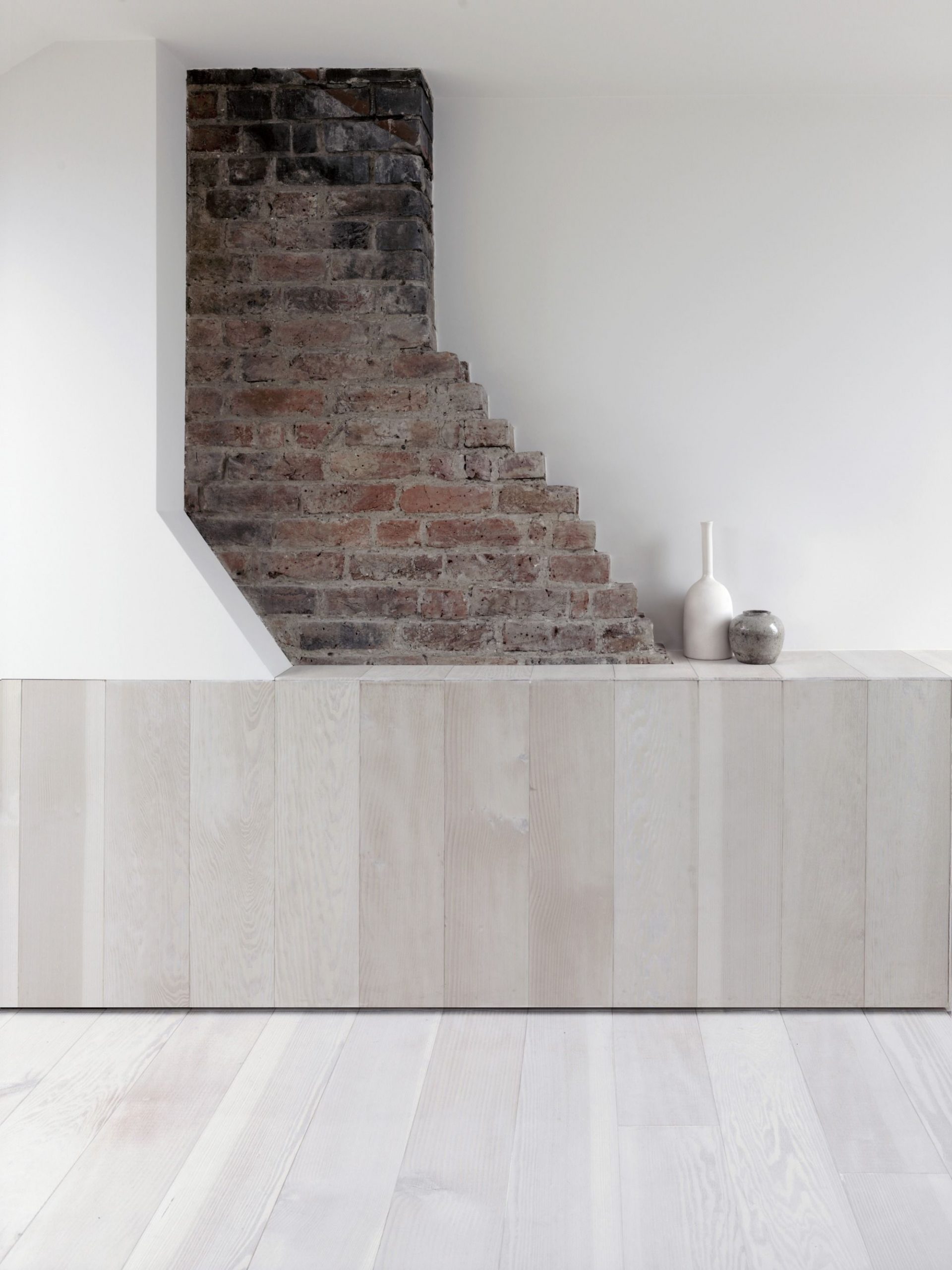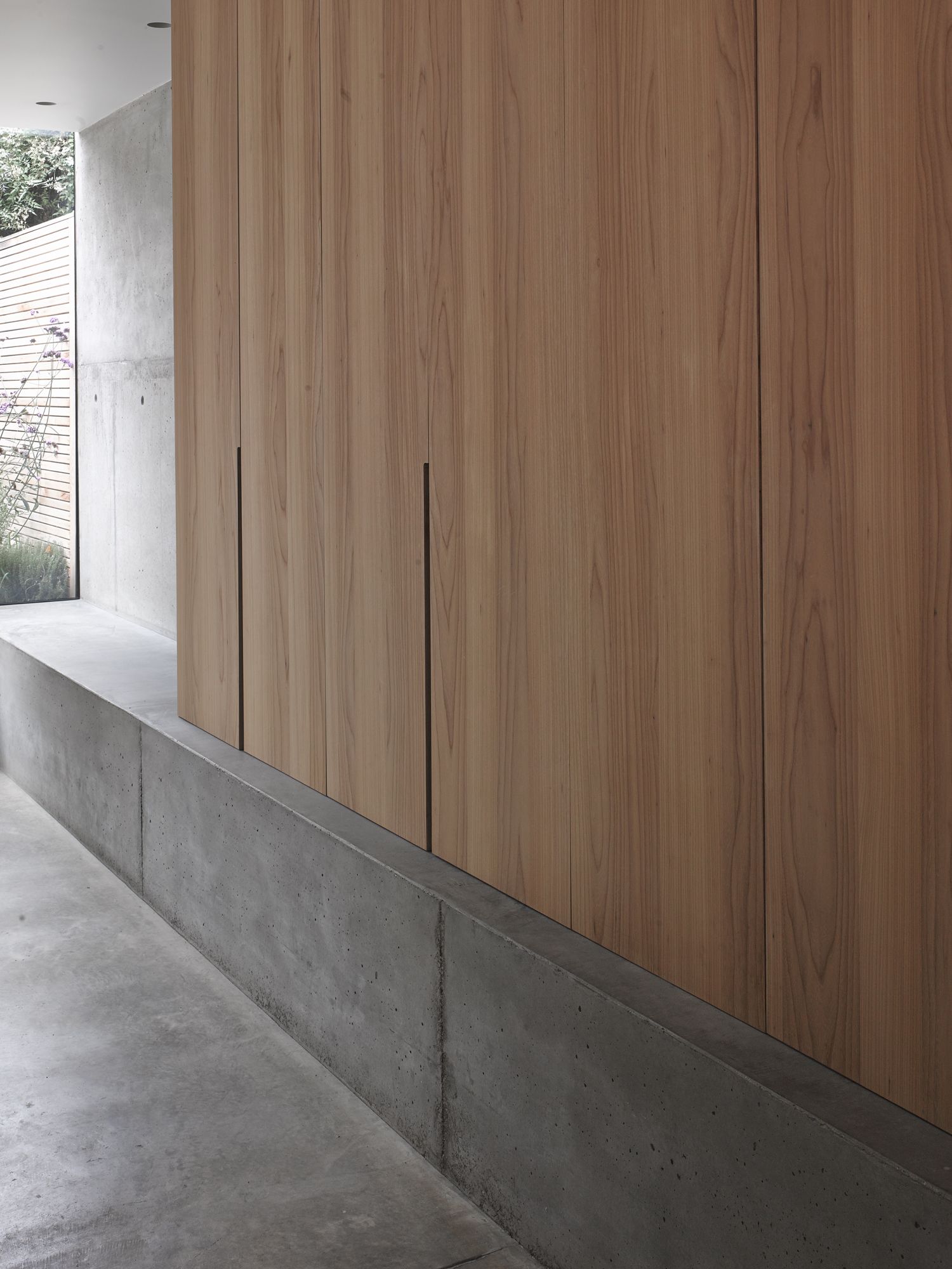 This was a project about making something extraordinary out of the very ordinary. We were approached by Kate and Ewan Thompson to extend and re-furbish their Victorian terraced house in Shepherd’s Bush for a growing family. Our remit was very conventional: a ground floor extension and loft conversion – a potentially hum-drum brief. What wasn’t so conventional was their approach: our task was to come up with a design which rejected the typical solutions with aspirations beyond the planning-friendly aesthetics of a London terraced house extension. From the outset, discussions centred around the use of insitu concrete: for floors, walls and ‘furniture’ elements within the scheme. As the dominant material presence, concrete was chosen primarily for its aesthetic qualities but the opportunity to build in high thermal mass and develop free-form structures became increasingly important considerations as the project progressed. As a point of reference concrete then became the driver for all other material decisions. The facade of the extension is clad in rusted Corten steel and the interior joinery fronts made from Grey Elm- both providing the necessary contrast, warmth and richness against the cool swathes of smooth concrete. Presenting fewer opportunities for spatial invention, the loft conversion has a very different, more ethereal feel to the ground floor. A reductive palette of Scandinavian white-washed Douglas Fir boards, light walls and exposed brickwork keep it simple and bright. The Victorian stairwell winds up the house and collides with the new loft staircase – a meeting between the old and the new – which leads up to the top landing and is illuminated with natural daylight from the rooflight above. The treads of the staircase lead on to a large expanse of Douglas Fir boards which flood the room and run up the walls as panelling.