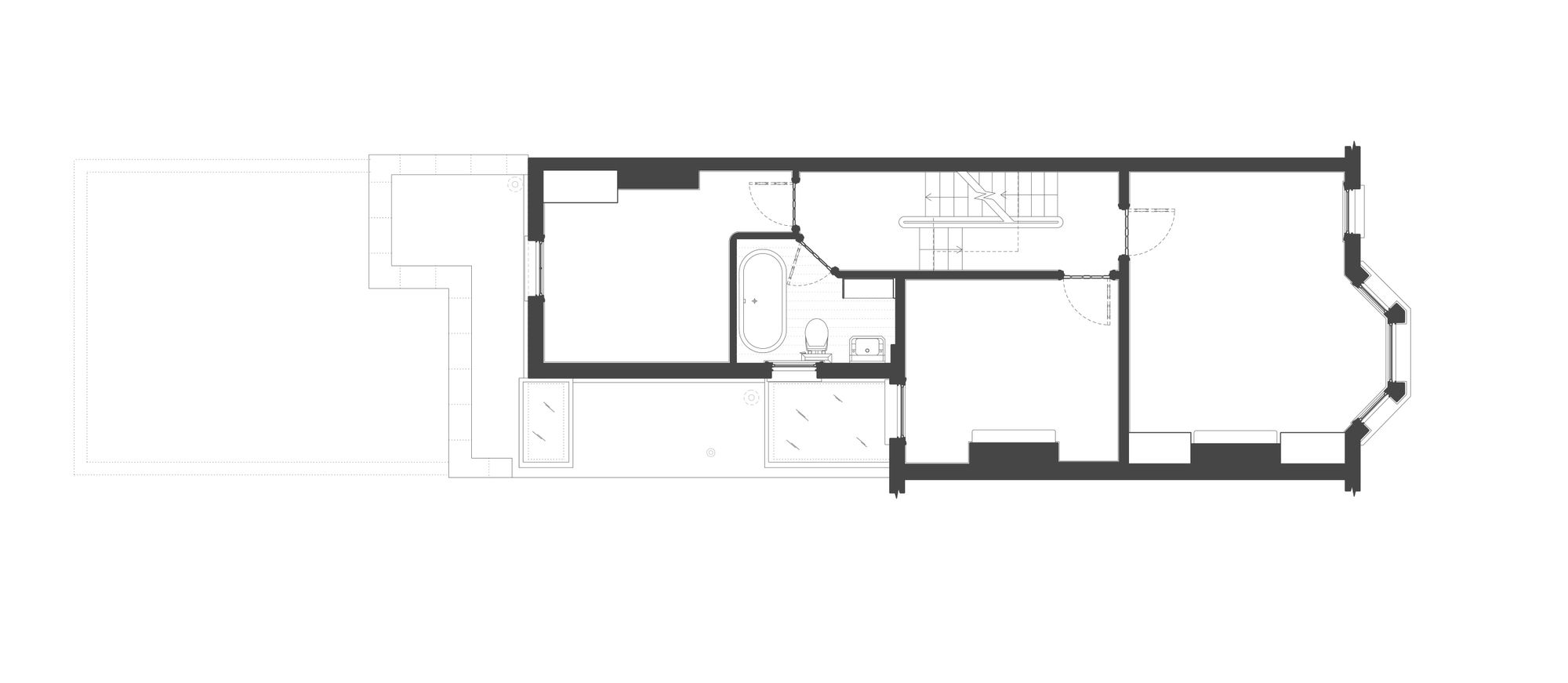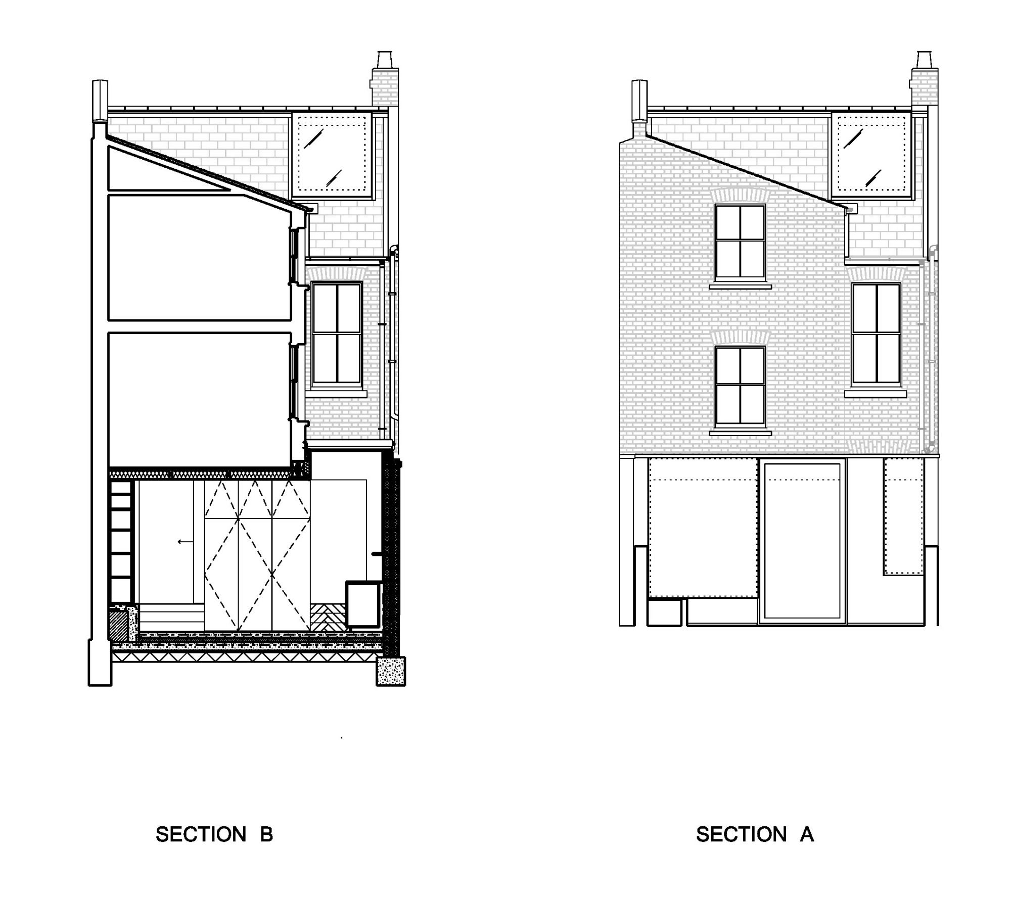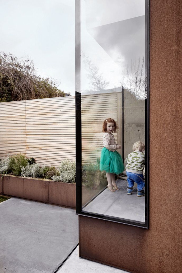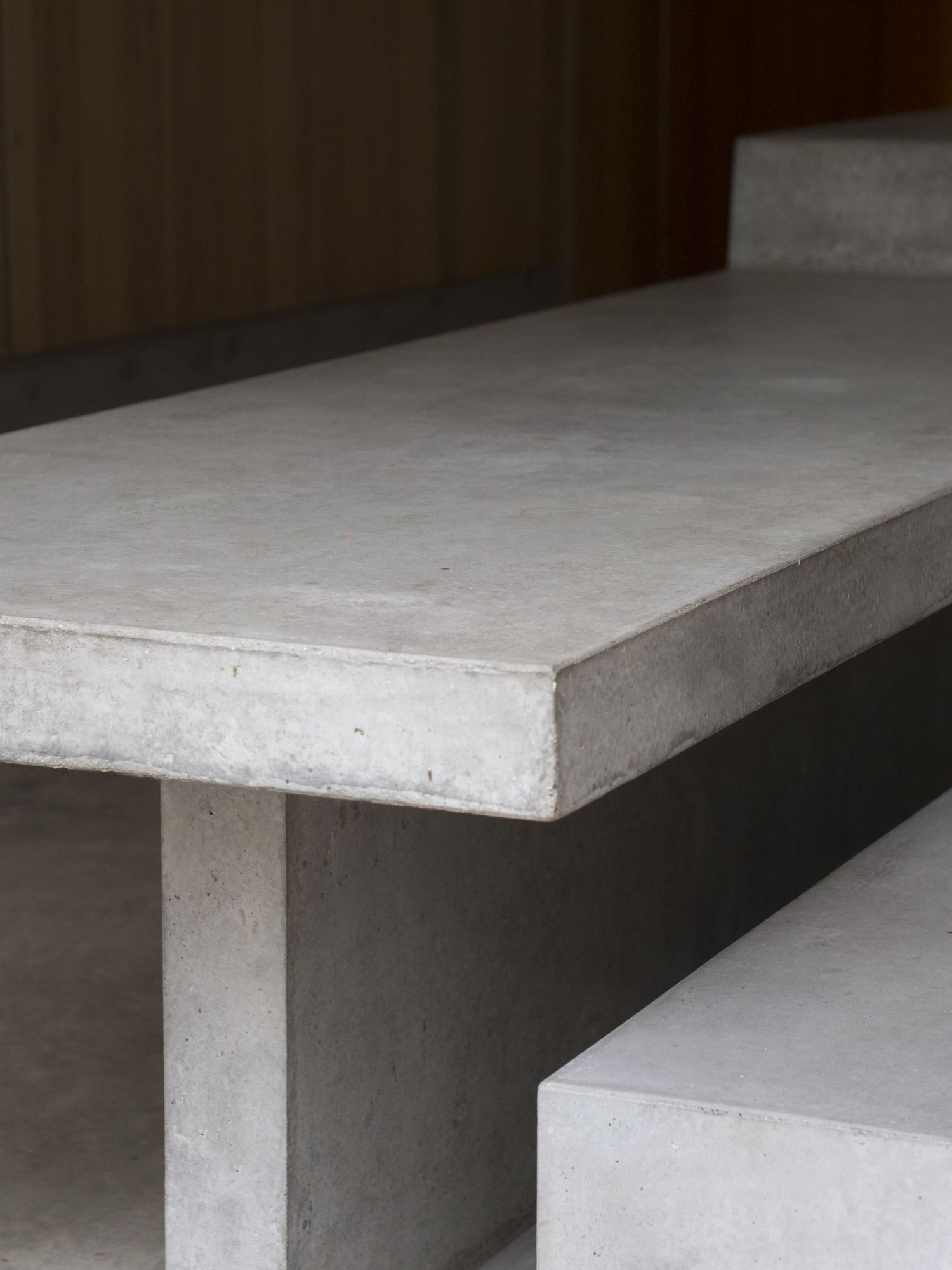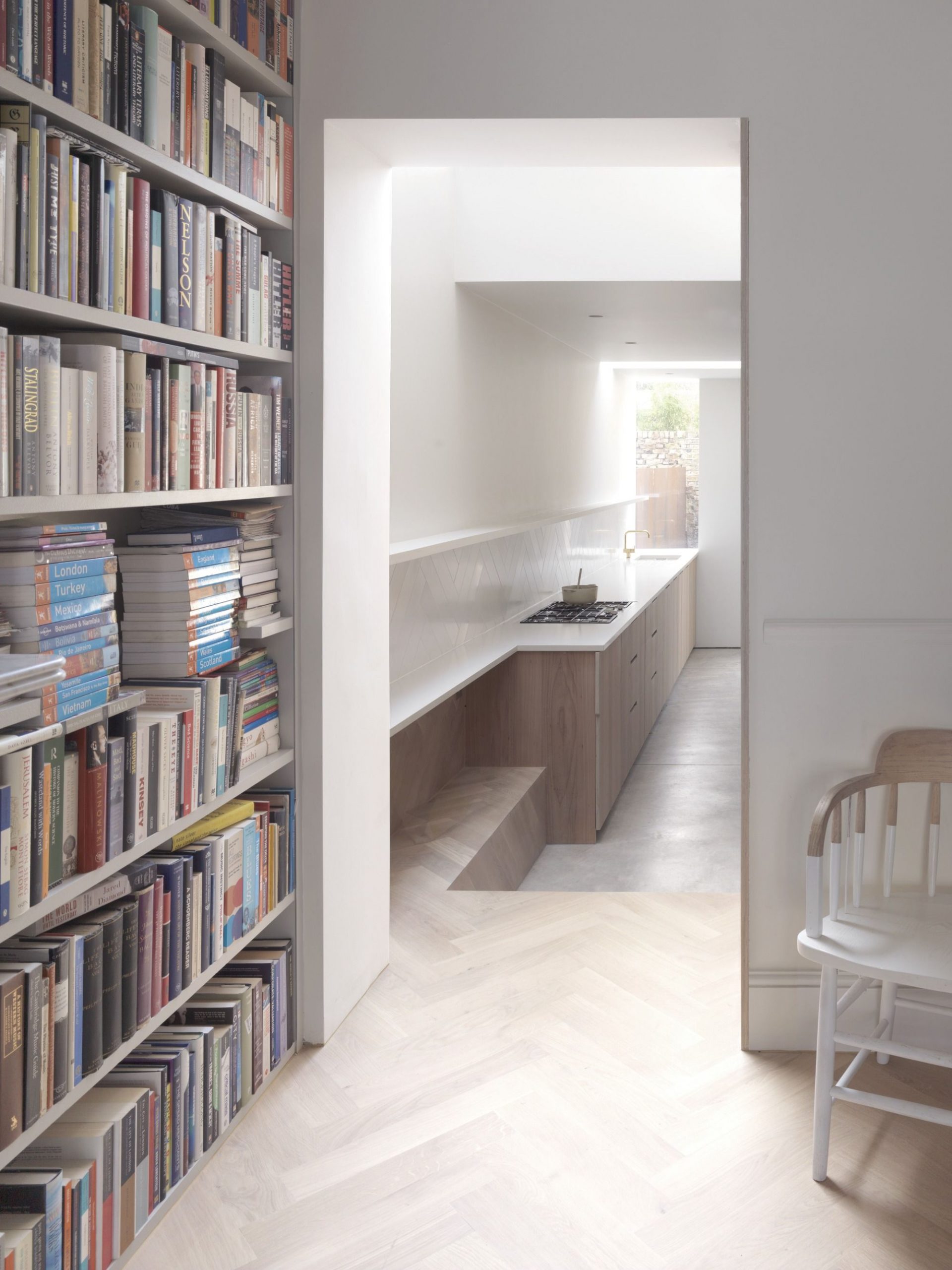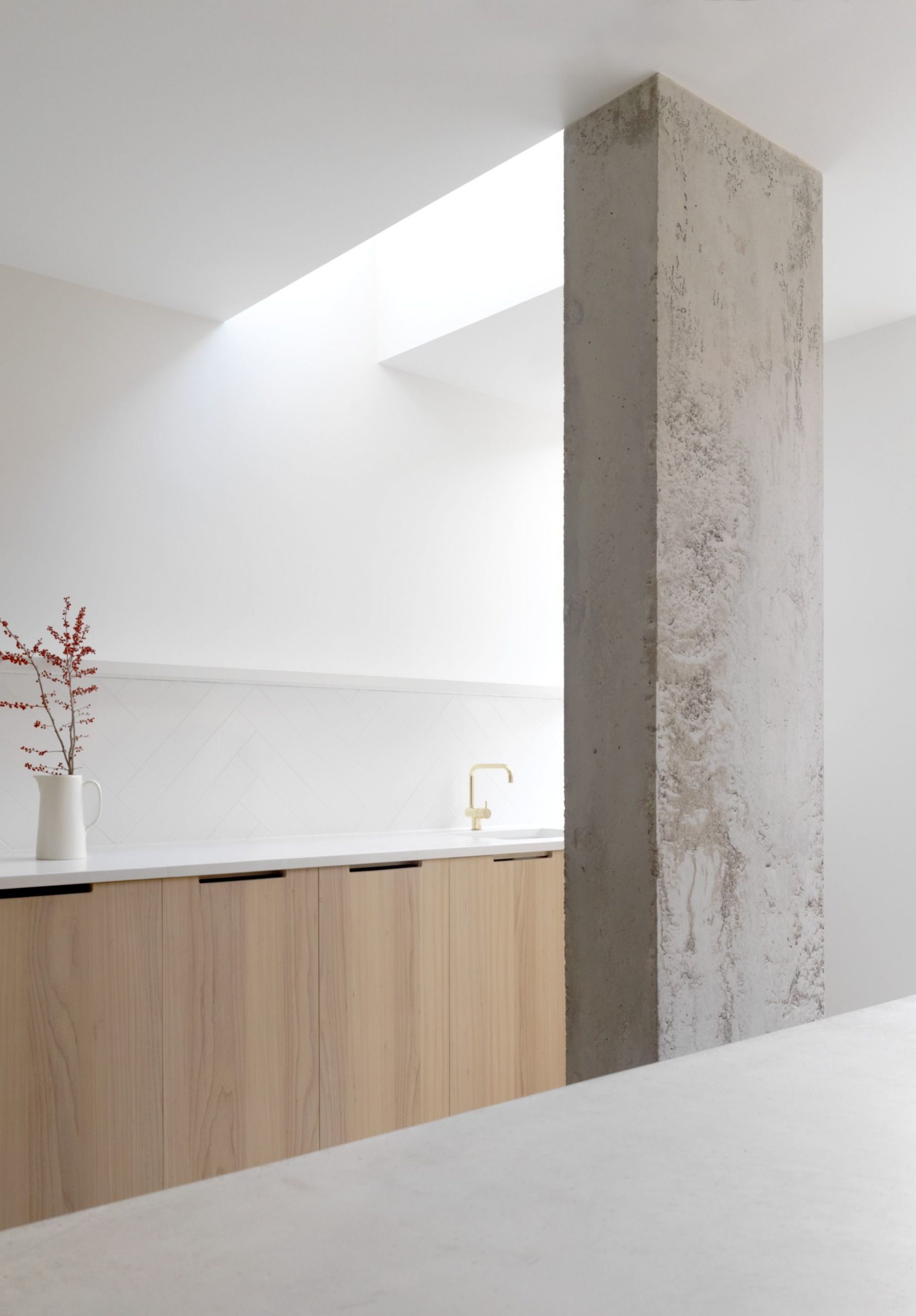 This was a project about making something extraordinary out of the very ordinary. We were approached by Kate and Ewan Thompson to extend and re-furbish their Victorian terraced house in Shepherd’s Bush for a growing family. Our remit was very conventional: a ground floor extension and loft conversion – a potentially hum-drum brief. What wasn’t so conventional was their approach: our task was to come up with a design which rejected the typical solutions with aspirations beyond the planning-friendly aesthetics of a London terraced house extension. From the outset, discussions centred around the use of insitu concrete: for floors, walls and ‘furniture’ elements within the scheme. As the dominant material presence, concrete was chosen primarily for its aesthetic qualities but the opportunity to build in high thermal mass and develop free-form structures became increasingly important considerations as the project progressed. As a point of reference concrete then became the driver for all other material decisions. The facade of the extension is clad in rusted Corten steel and the interior joinery fronts made from Grey Elm- both providing the necessary contrast, warmth and richness against the cool swathes of smooth concrete. Presenting fewer opportunities for spatial invention, the loft conversion has a very different, more ethereal feel to the ground floor. A reductive palette of Scandinavian white-washed Douglas Fir boards, light walls and exposed brickwork keep it simple and bright. The Victorian stairwell winds up the house and collides with the new loft staircase – a meeting between the old and the new – which leads up to the top landing and is illuminated with natural daylight from the rooflight above. The treads of the staircase lead on to a large expanse of Douglas Fir boards which flood the room and run up the walls as panelling.