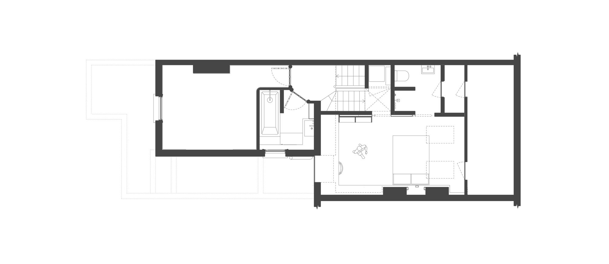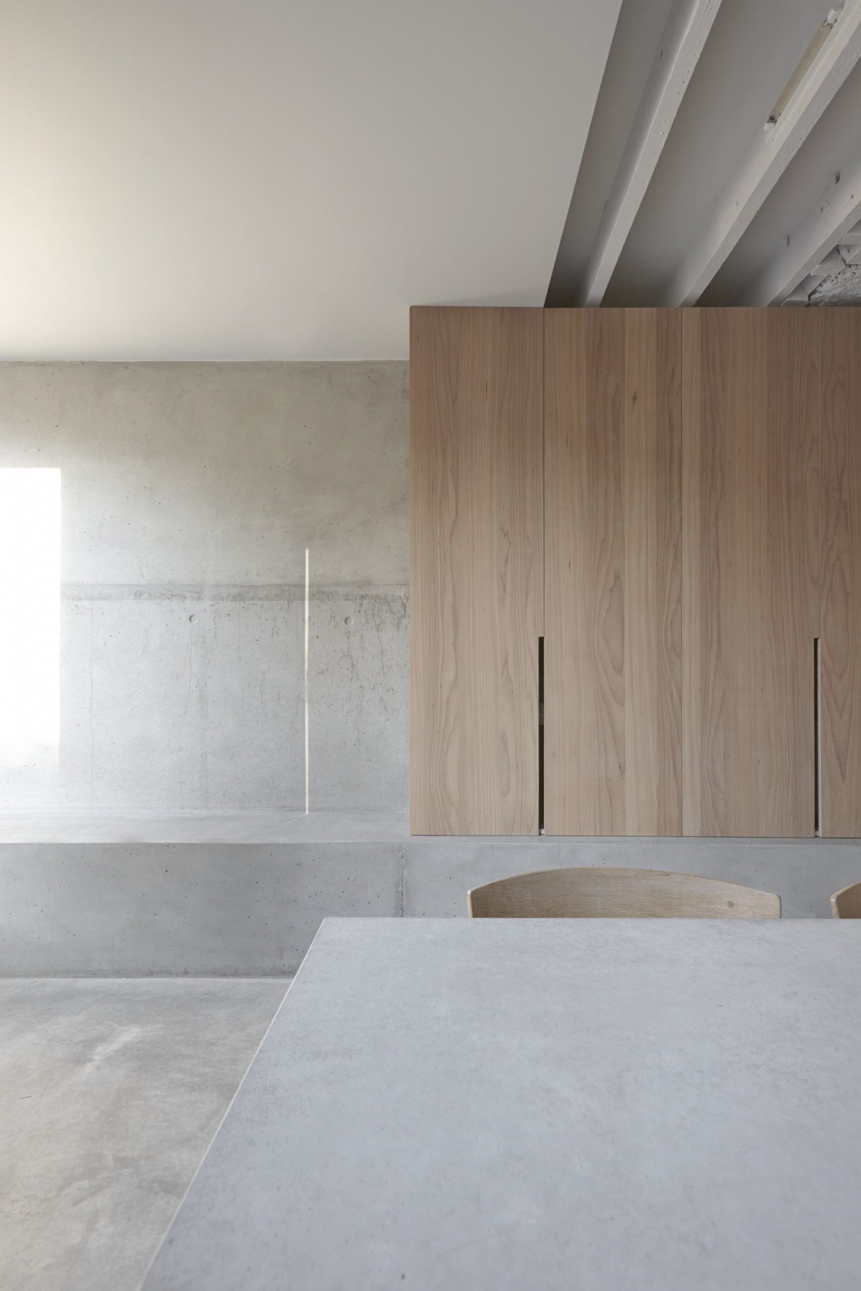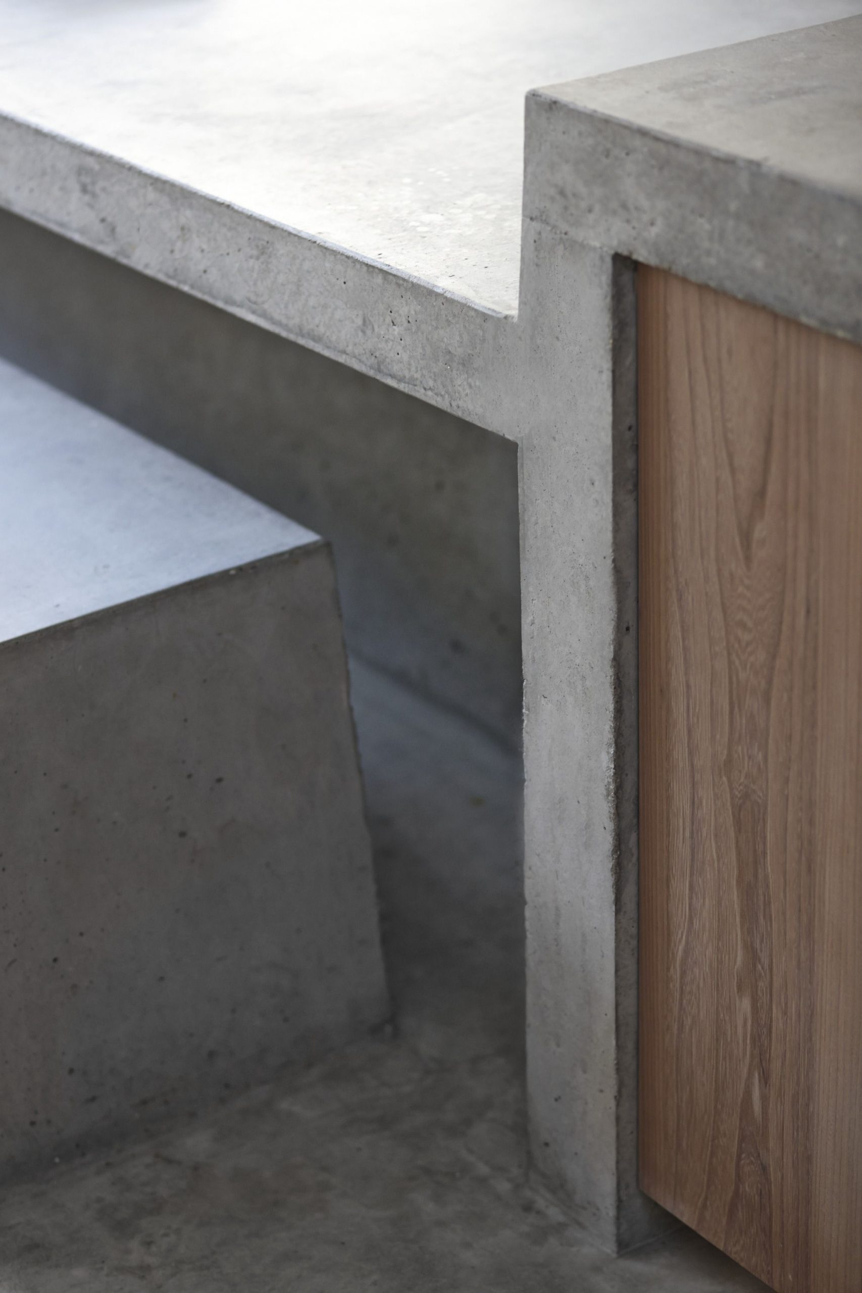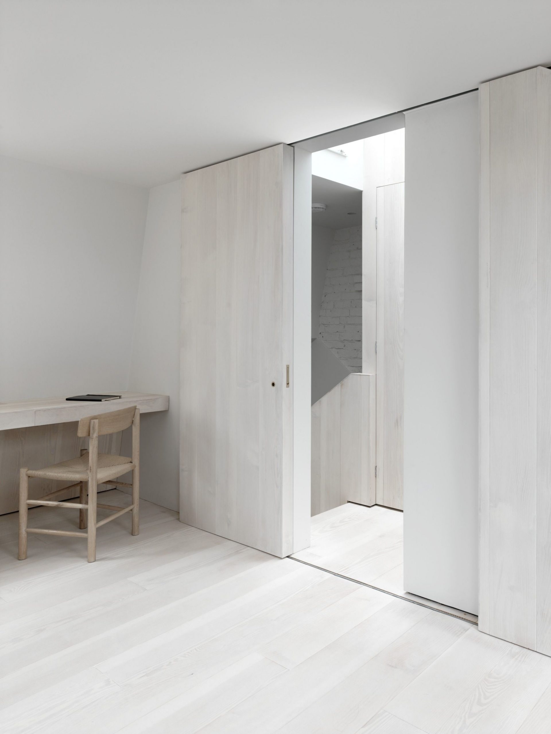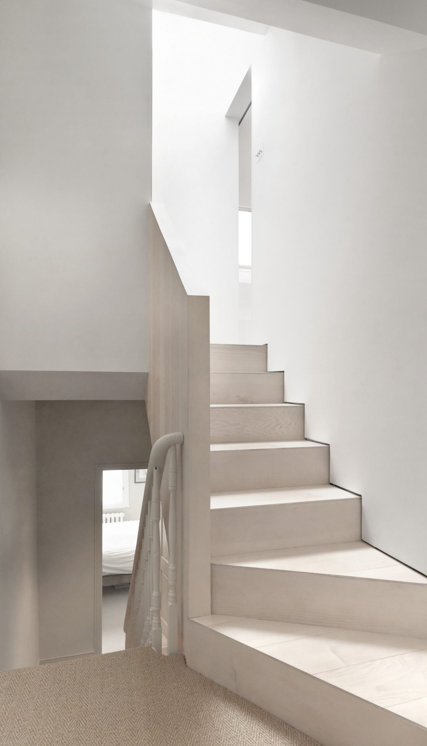 This was a project about making something extraordinary out of the very ordinary. We were approached by Kate and Ewan Thompson to extend and re-furbish their Victorian terraced house in Shepherd’s Bush for a growing family. Our remit was very conventional: a ground floor extension and loft conversion – a potentially hum-drum brief. What wasn’t so conventional was their approach: our task was to come up with a design which rejected the typical solutions with aspirations beyond the planning-friendly aesthetics of a London terraced house extension. From the outset, discussions centred around the use of insitu concrete: for floors, walls and ‘furniture’ elements within the scheme. As the dominant material presence, concrete was chosen primarily for its aesthetic qualities but the opportunity to build in high thermal mass and develop free-form structures became increasingly important considerations as the project progressed. As a point of reference concrete then became the driver for all other material decisions. The facade of the extension is clad in rusted Corten steel and the interior joinery fronts made from Grey Elm- both providing the necessary contrast, warmth and richness against the cool swathes of smooth concrete. Presenting fewer opportunities for spatial invention, the loft conversion has a very different, more ethereal feel to the ground floor. A reductive palette of Scandinavian white-washed Douglas Fir boards, light walls and exposed brickwork keep it simple and bright. The Victorian stairwell winds up the house and collides with the new loft staircase – a meeting between the old and the new – which leads up to the top landing and is illuminated with natural daylight from the rooflight above. The treads of the staircase lead on to a large expanse of Douglas Fir boards which flood the room and run up the walls as panelling.