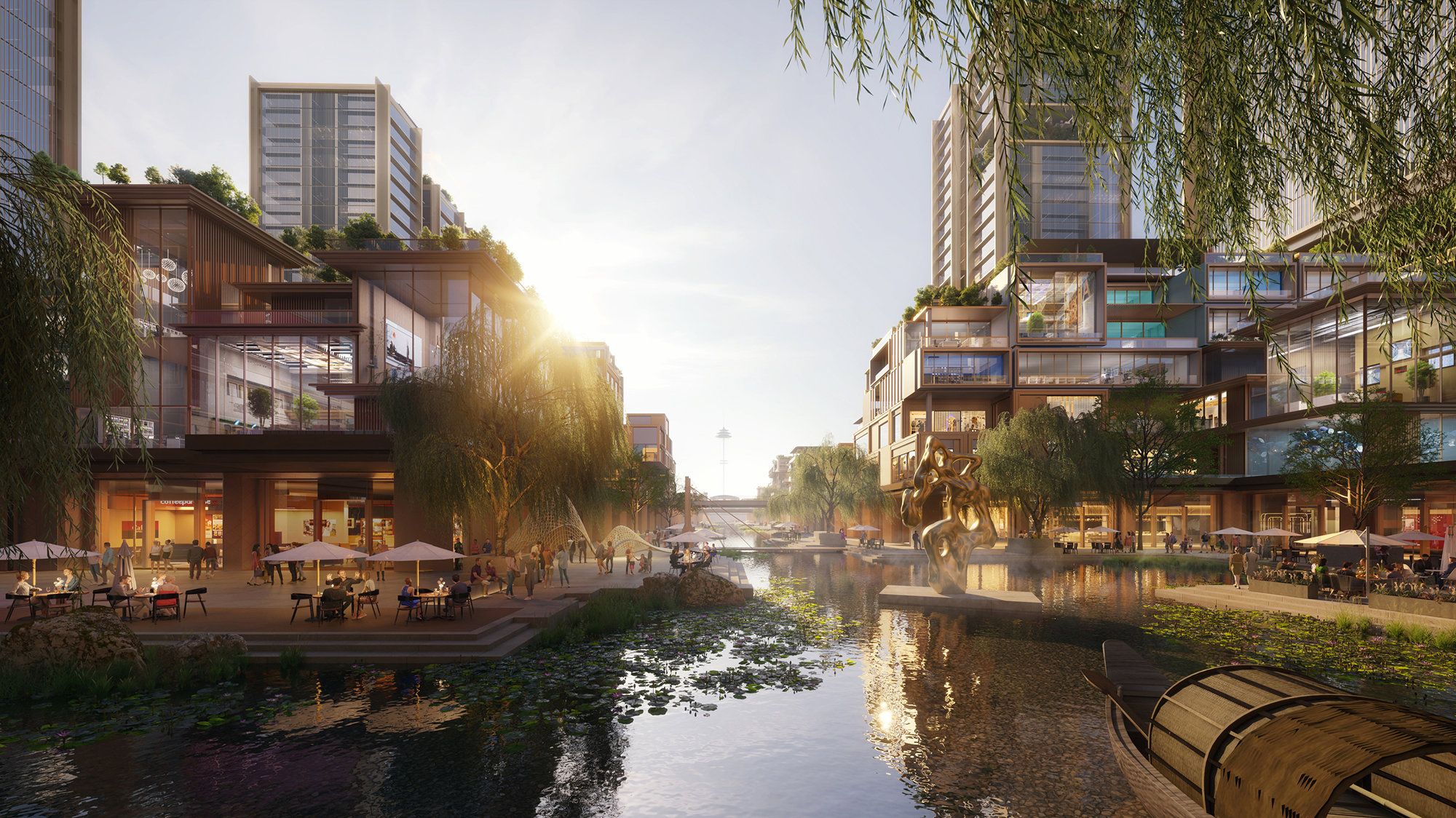 This environmentally friendly Hangzhou masterplan aims to preserve the existing wetlands while incorporating sustainable strategies such as passive massing and rainwater reuse. The architects have set ambitious goals, aiming for a 3-star green rating in China, along with LEED and WELL Community Gold certifications.