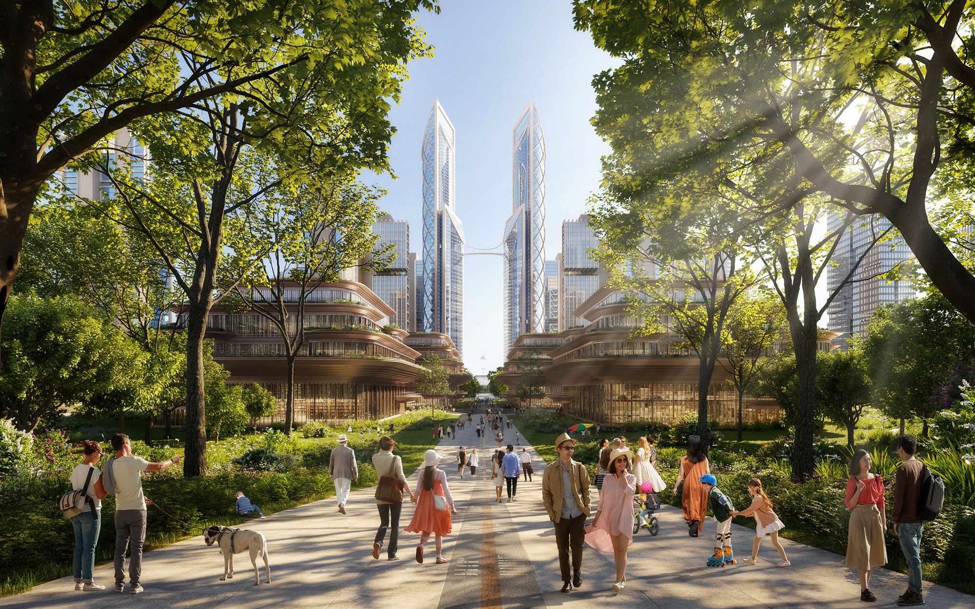 The central axis of the district, envisioned as a “leafy spine,” serves as a guiding pathway for visitors. Green spaces bookend this axis, with a public park located at the north end and a connected wetland at the southern end, which is linked to a new cultural hub.