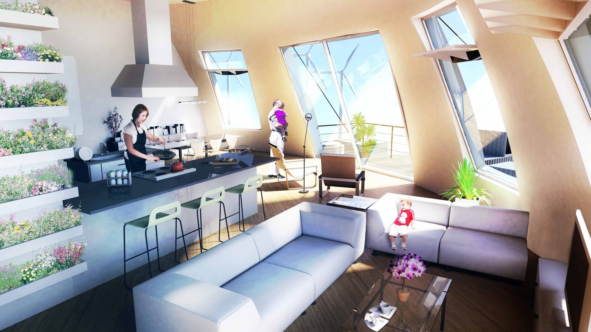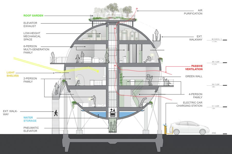 On the exterior of the silos, PV cells and solar hot water panels coat the silo, which due to its spherical geometry enable a high level of energy production. These systems, along with the heavily insulated walls and other remaining industrial qualities such as waterproofing and structure, act to build a home that is carbon neutral, approaching carbon-positive.
