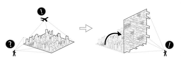 By questioning traditional typologies, FLIP/CITY redefines methods of organizing communities by preserving the human scale. The proposal flips the horizontal cityscape to the vertical. Footprints of Shanghai’s existing typologies, only visible by plane, embody the new face of the vertical city.  By expressing distinct functions for its citizens, FLIP/CITY relates strongly to the human scale while simultaneously increasing density and green space at the urban scale.