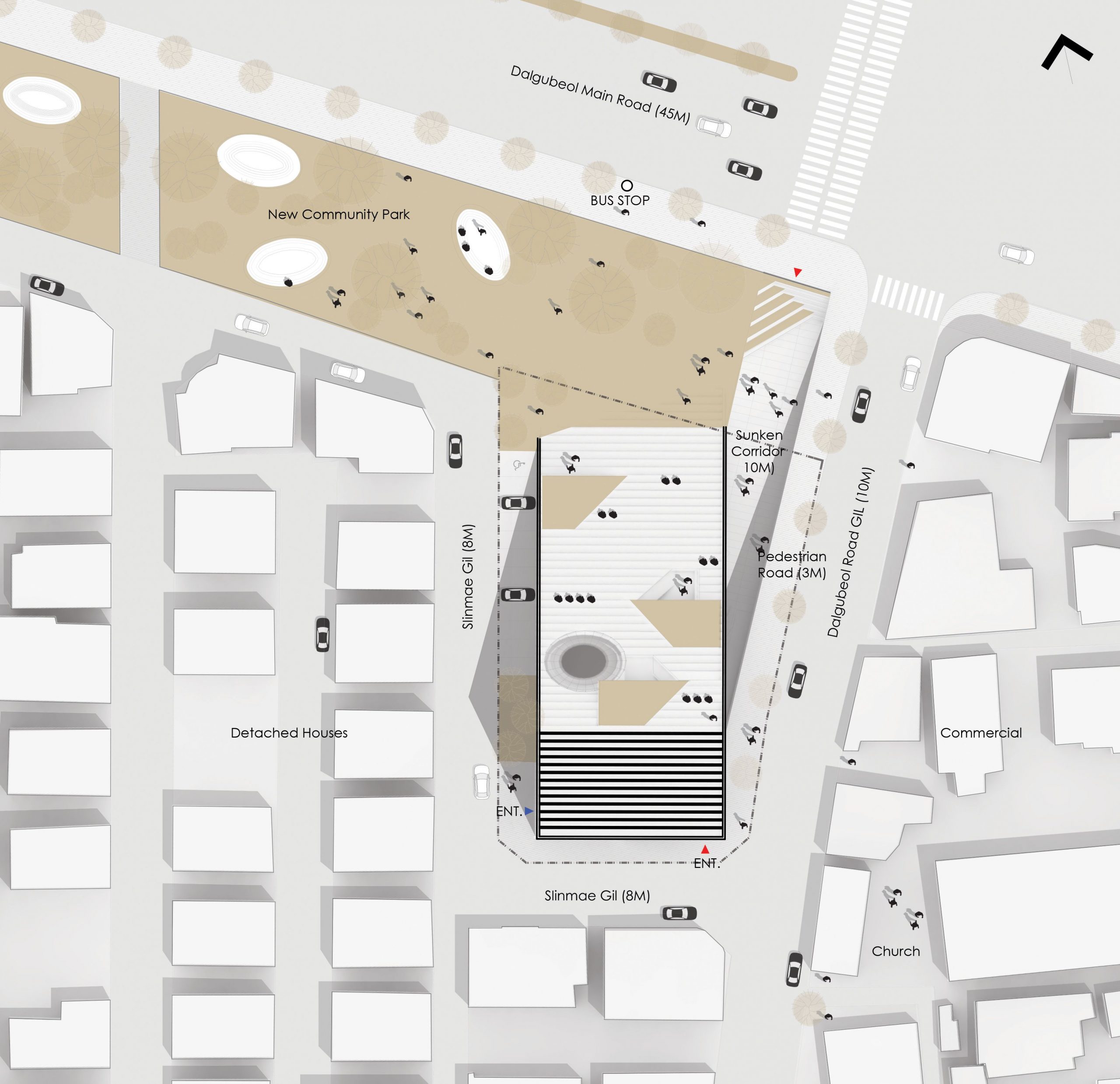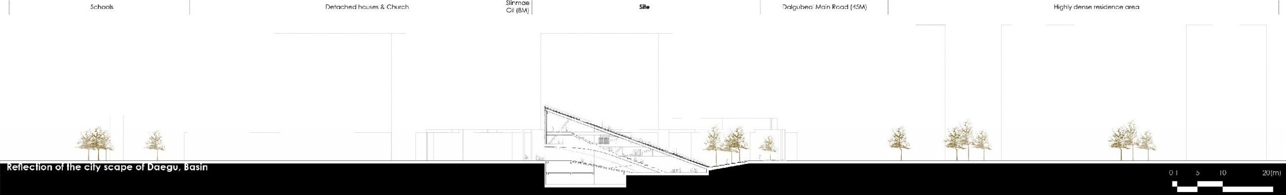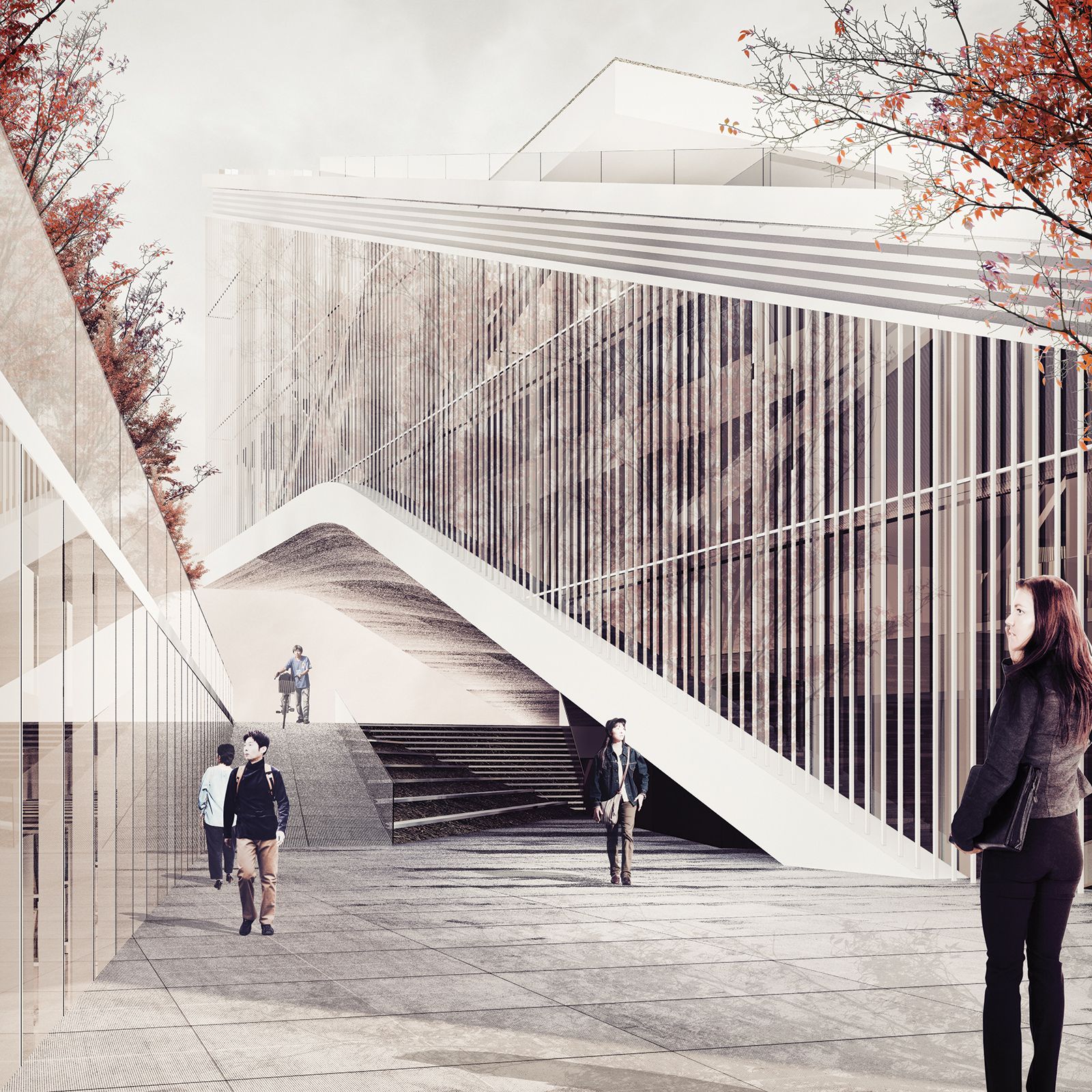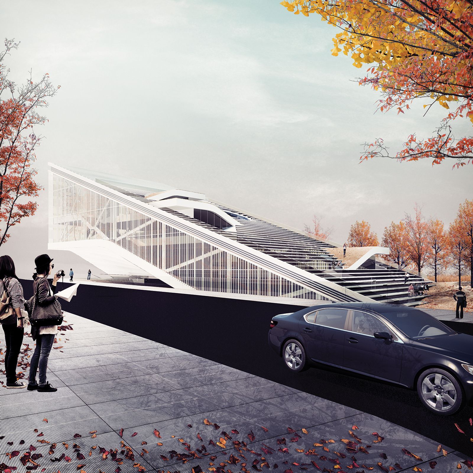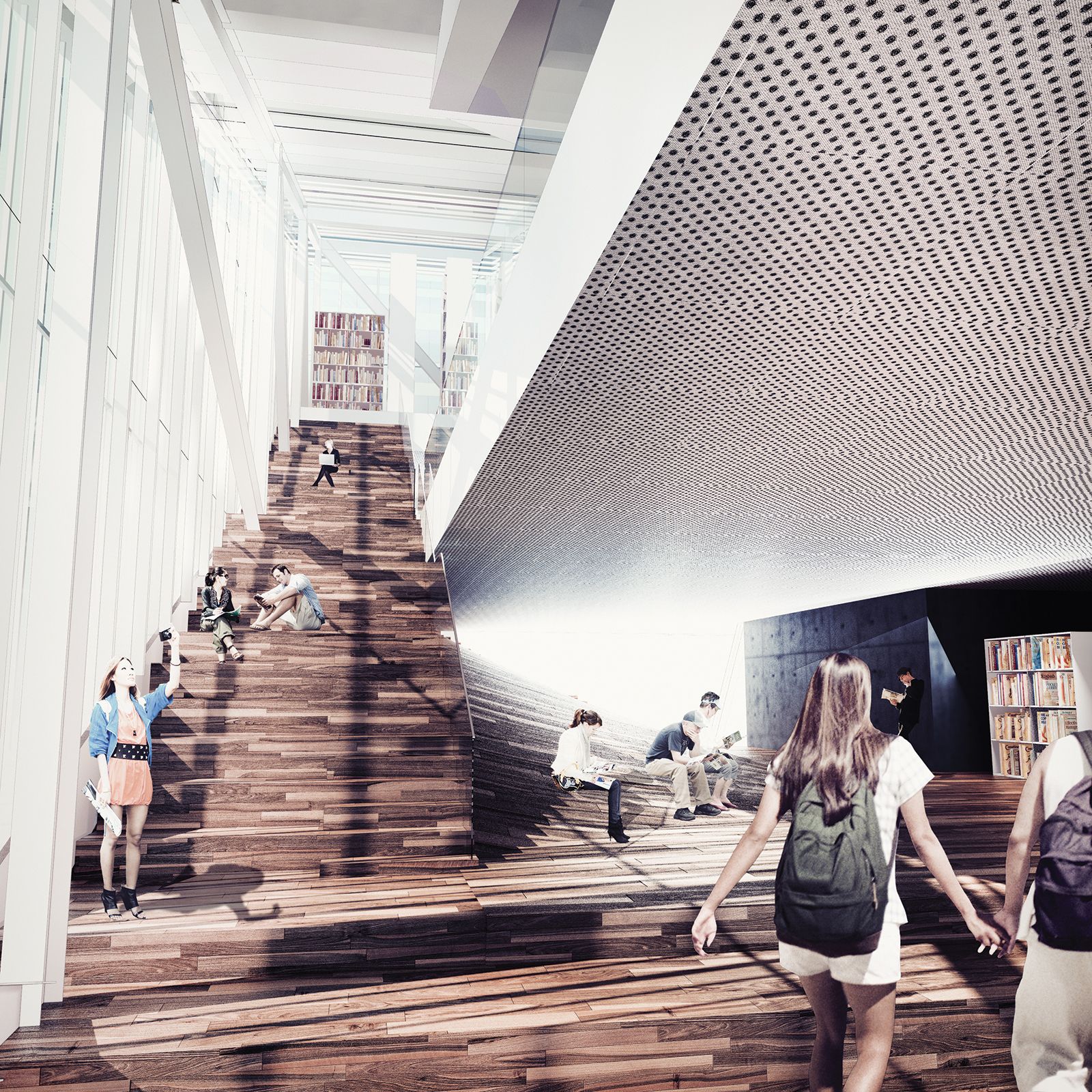 Daegu Gosan Public Library design proposal by Sunggi Park a design assistant at BIG challenges the traditional notion of a library as merely a distribution centre for knowledge..His aim in this design is to create a quality public life that reflects present openness of the people od Daegu. Prominently from the outside the library depicts a kind of a staircase that emerges from the surrounding landscape.
